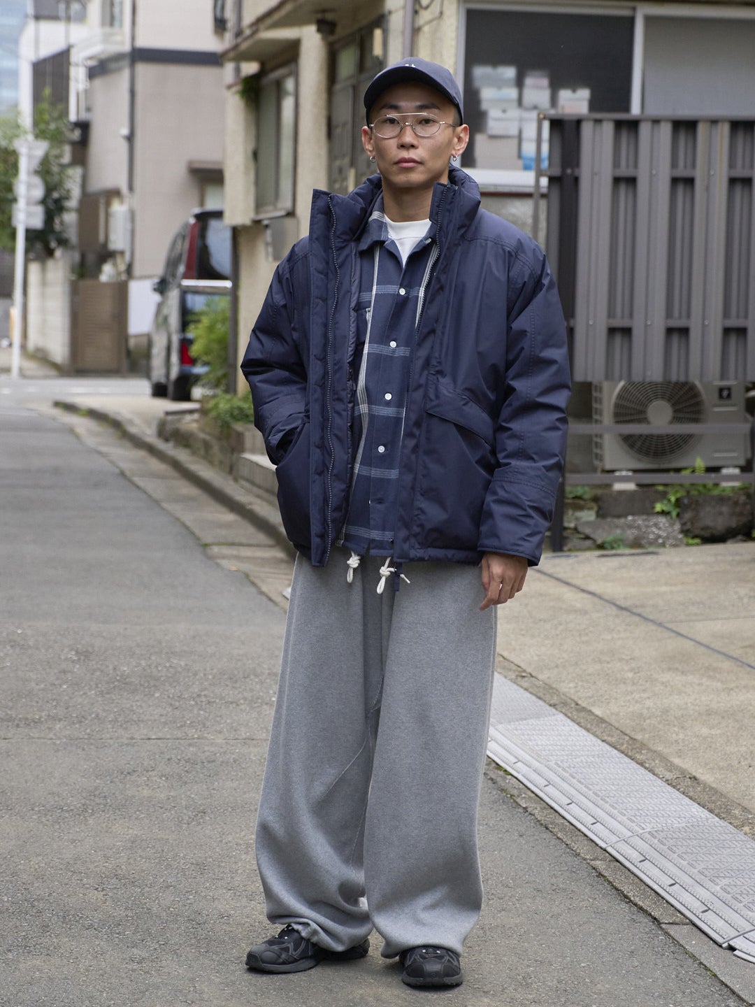 「スウェットパンツでカジュアルさを出しつつ、アウターと同系色のシャツとキャップで全体的にまとまりのあるコーディネートにしました。ショート丈でトレンド感もありますし、オンオフ問わずさまざまなシーンで着られるのがいい」。