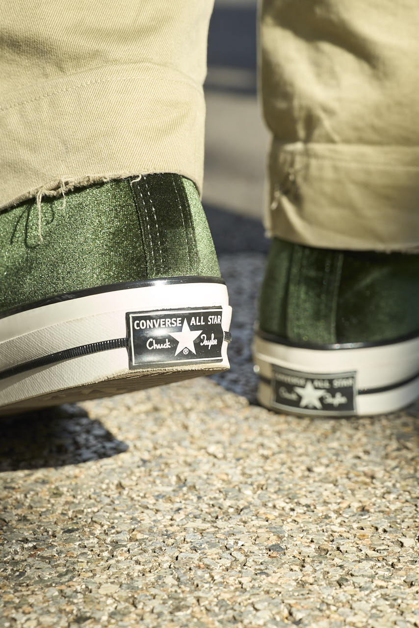 「『ALL STAR LGCY VELVET HI』の特徴は、やはりこのベルベット素材。深いグリーンのベルベットは、光の加減で明るいグリーンに見えたり、黒に見えたりと、その時々で雰囲気が変わるのがお気に入りです」。