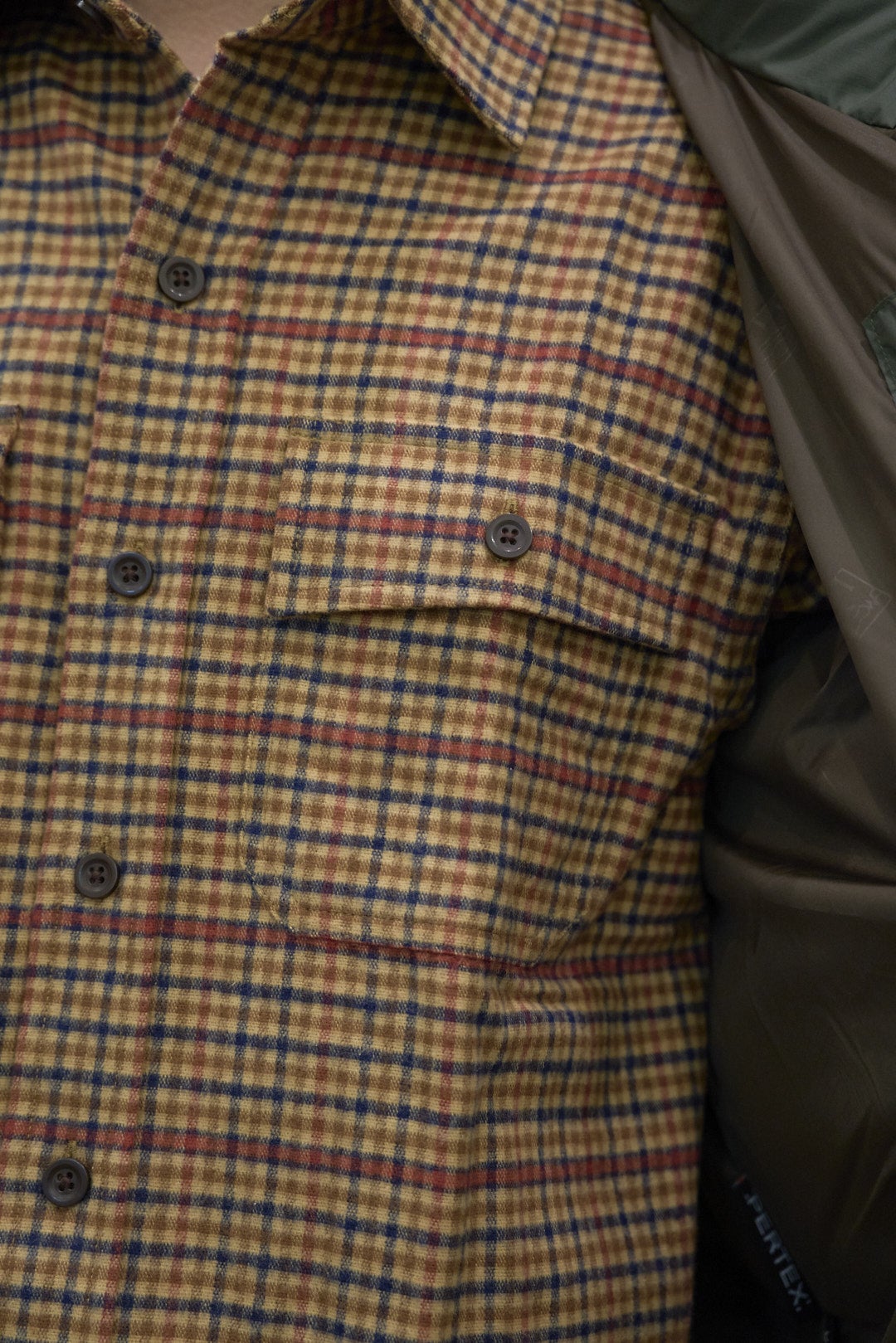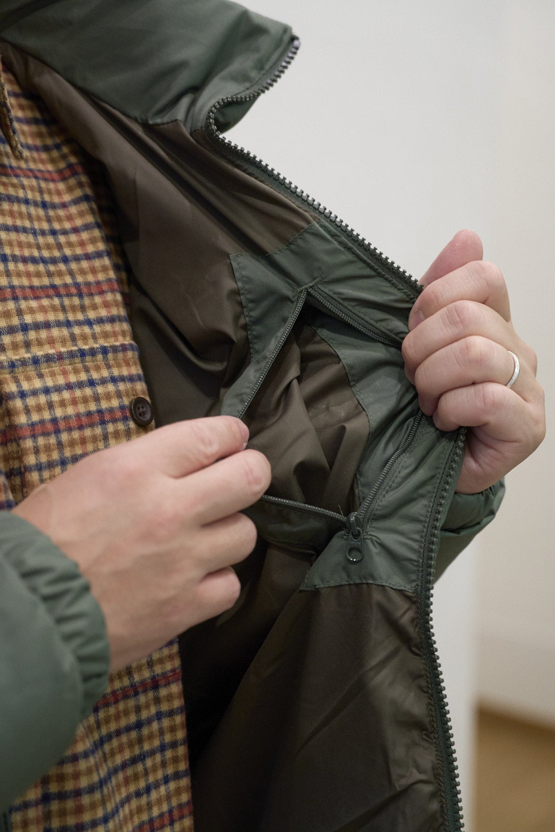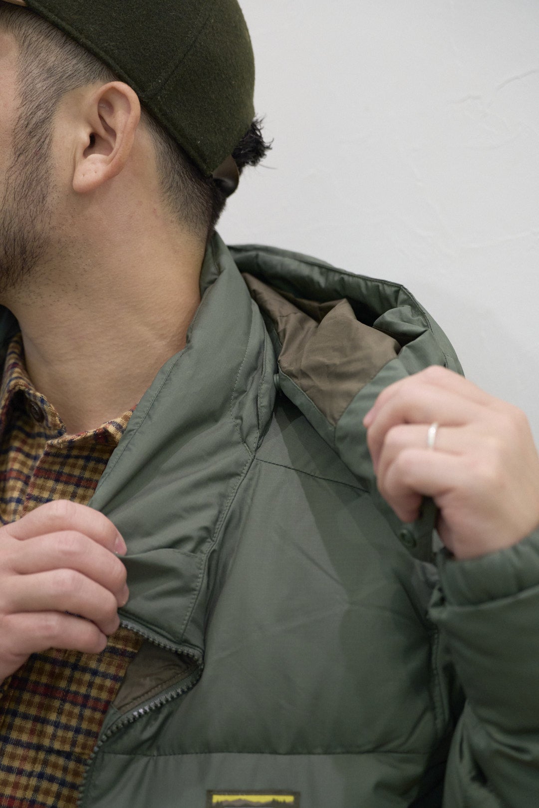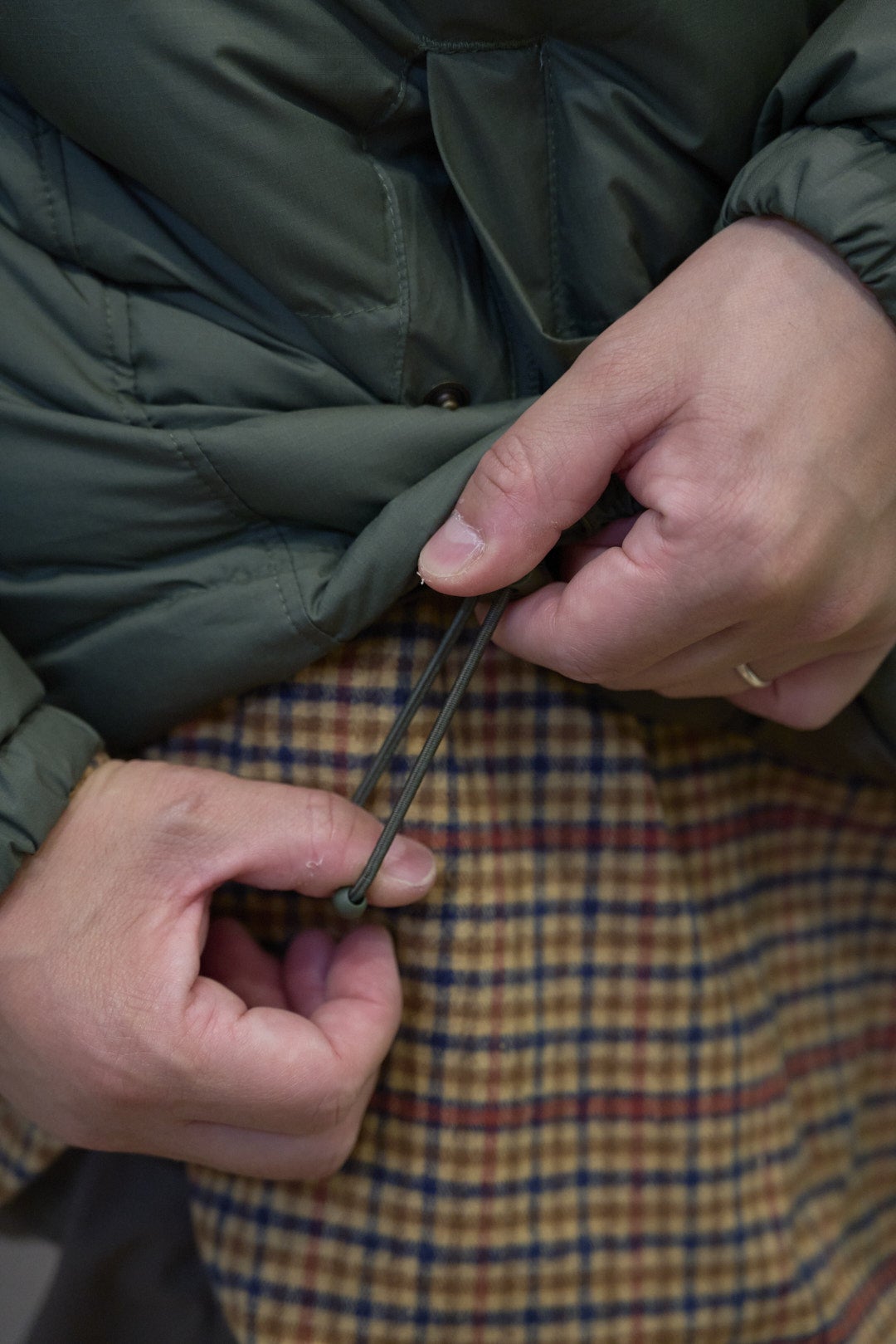 「短い丈のディテールと、ゆったりとしたシルエットで今っぽく着られる1着は、トレンドのブラウンと組み合わせてアウトドアスタイルに。独自のダウンテック加工により、ダウンの弱点である“水”に強いので、雪が降る地域の方にもおすすめです」。