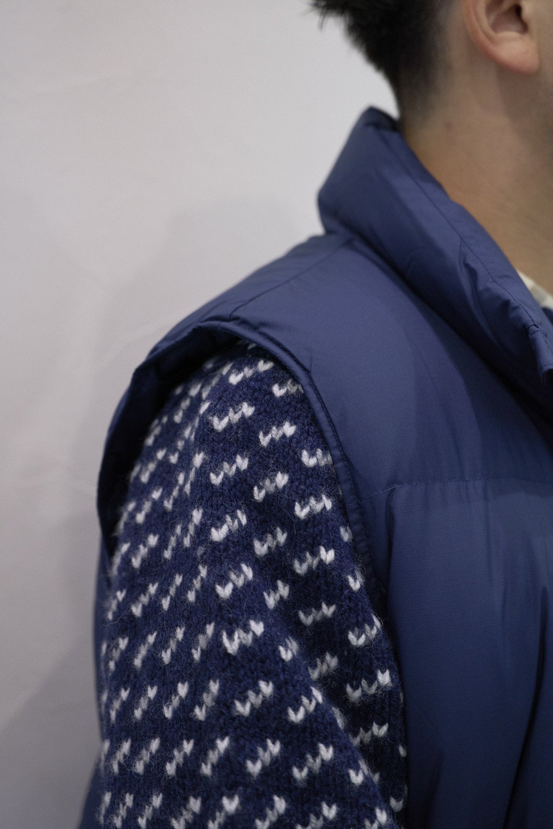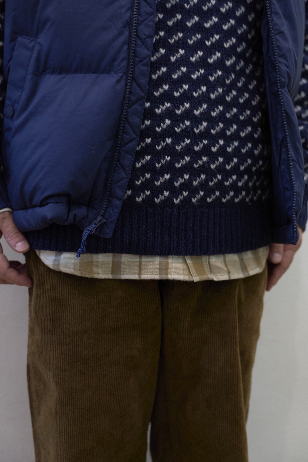 「そこまで寒くない地域ならダウンベストという選択もあり! ダウンジャケットだとシンプルなコーディネートになりがちですが、ダウンベストなら中に着たアイテムがしっかり見えるので、スタイリングしがいがあっておすすめです。柄ものをチョイスして可愛げのあるスタイリングに仕上げました」。