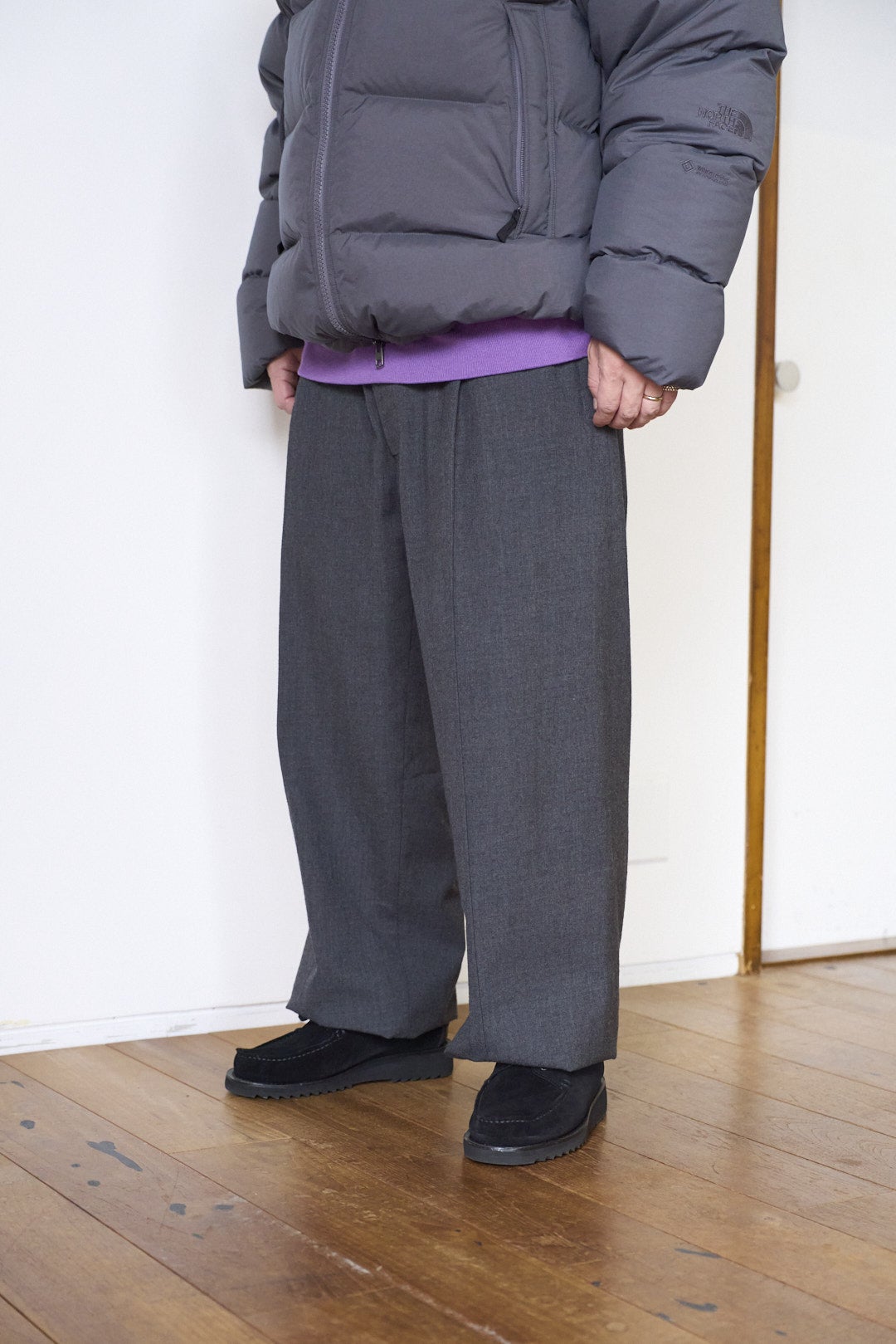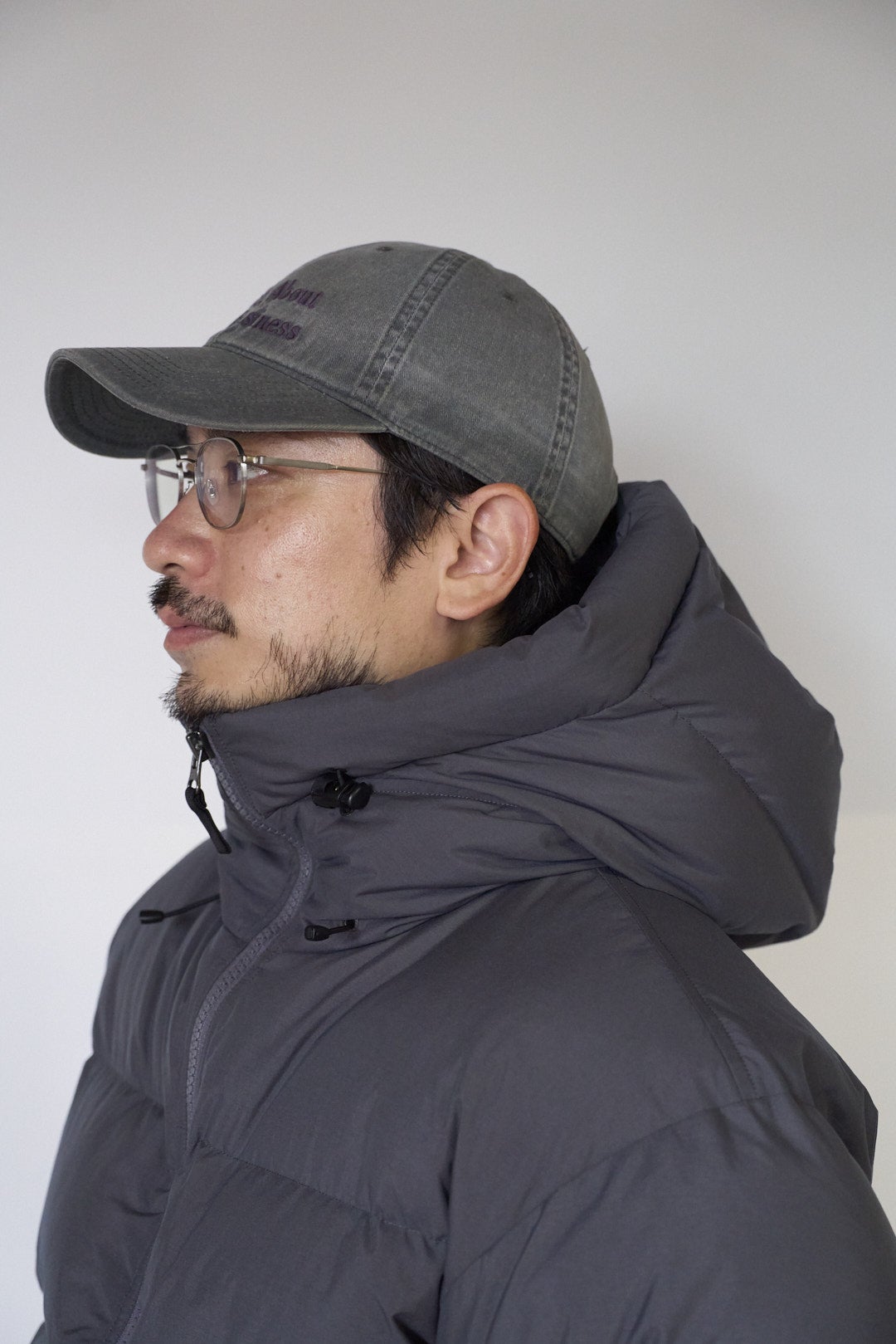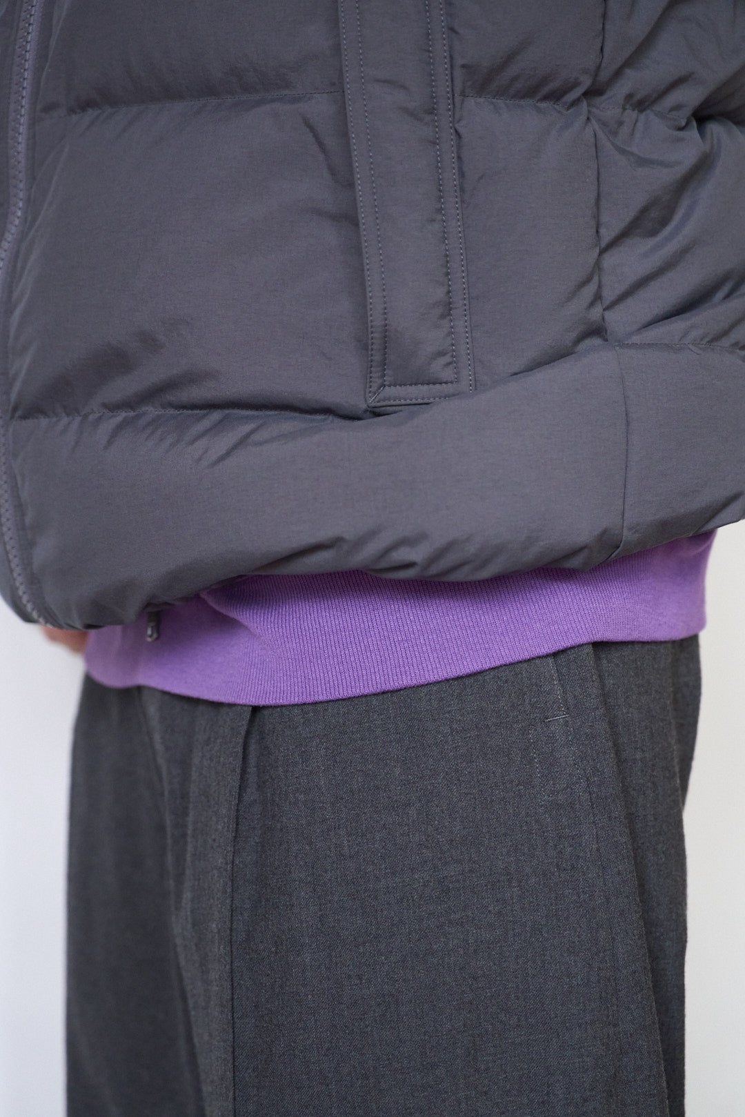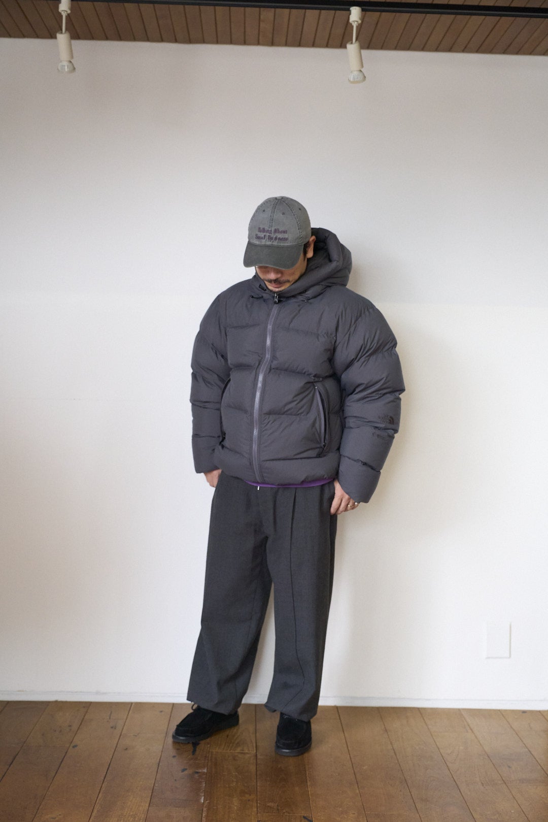 「グレー系のワントーンでまとめつつ、スウェットとキャップの刺繍でパープルを差し色にアクセントをつけました。ボリューミーなトップスとウエストを絞ったり、インナーを出すことでウエストのマーキングなどメリハリをつけるのがコツ」。
