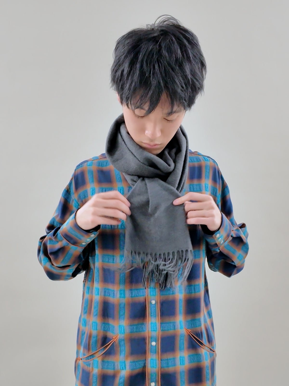 マフラーを巻きやすい細さに整えてから、片側が長くなるように首にかける。ラフにふわっと巻くのがコツで、きつく結ばないように。巻き終えてからはフロントをきれいに調整しよう。