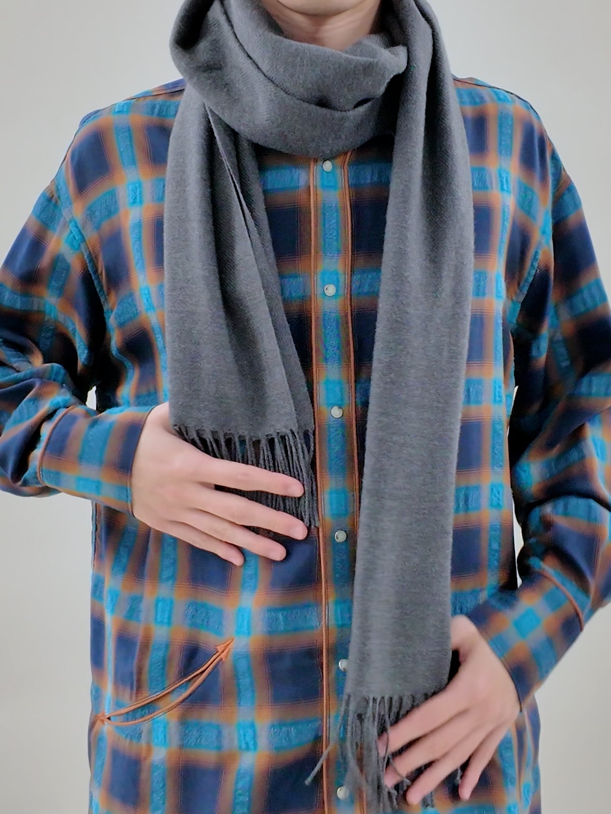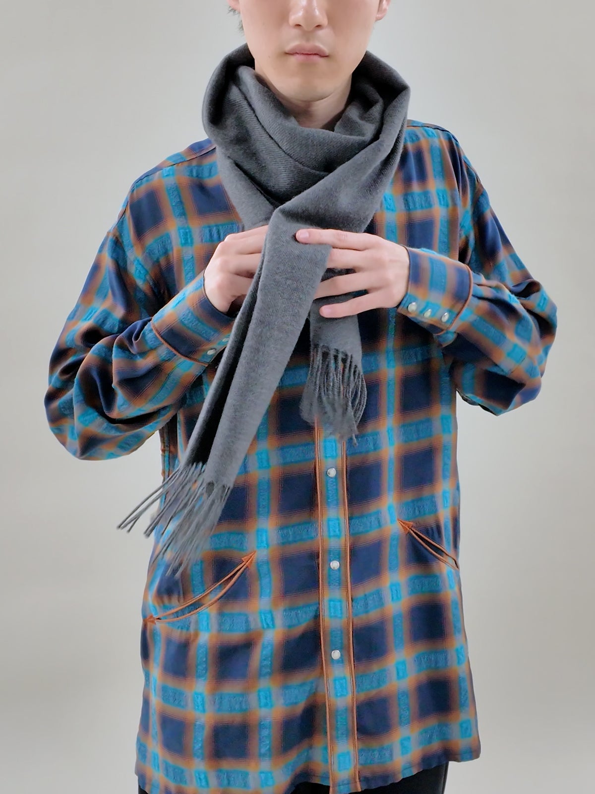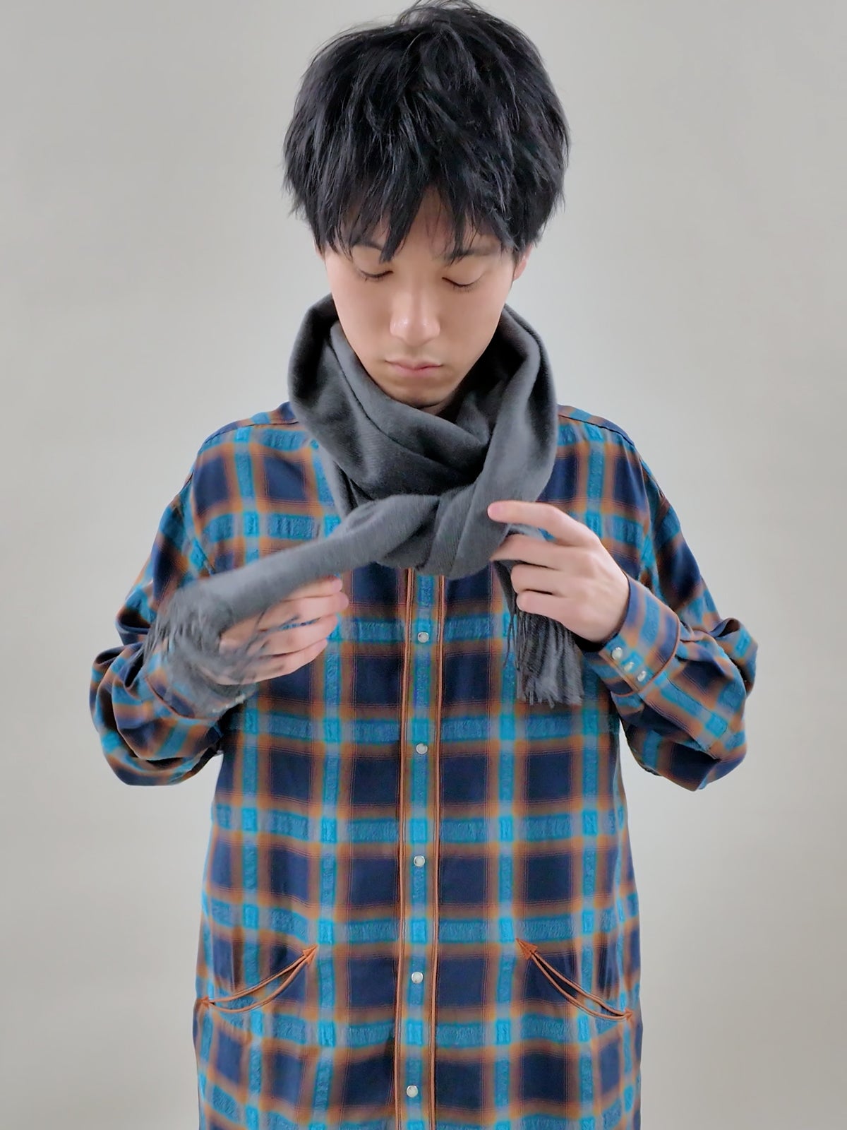 マフラーを首から垂らす際に、左右の長さを変えて、フロントでひと巻きする定番的な巻き方。簡単にできるうえに、カジュアルからビジネスシーンまで幅広く対応してくれるから、迷ったらまずはチャレンジを!