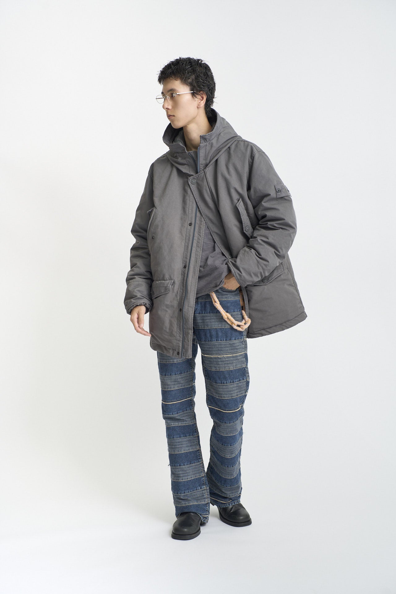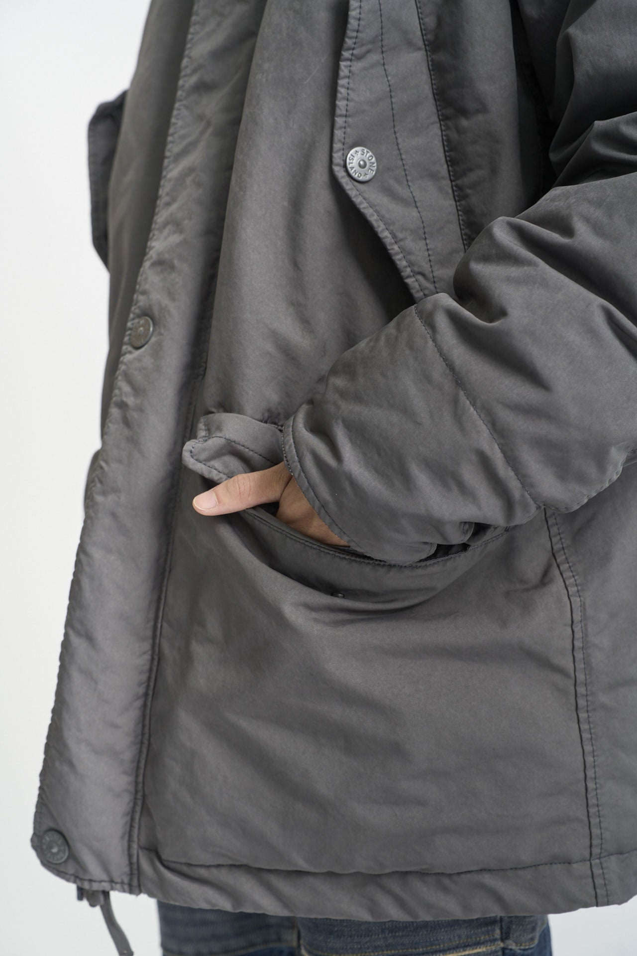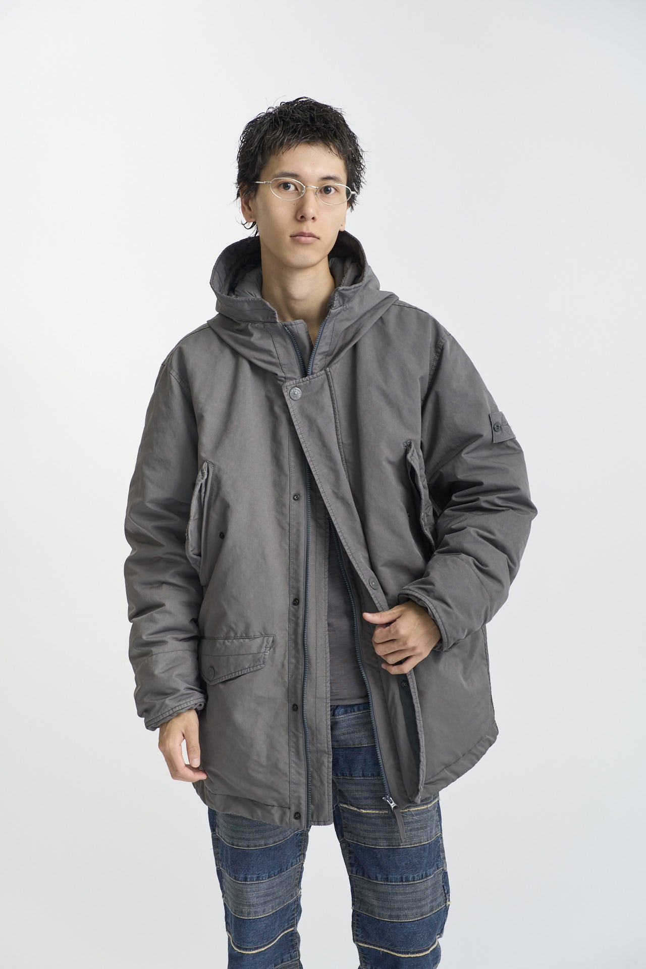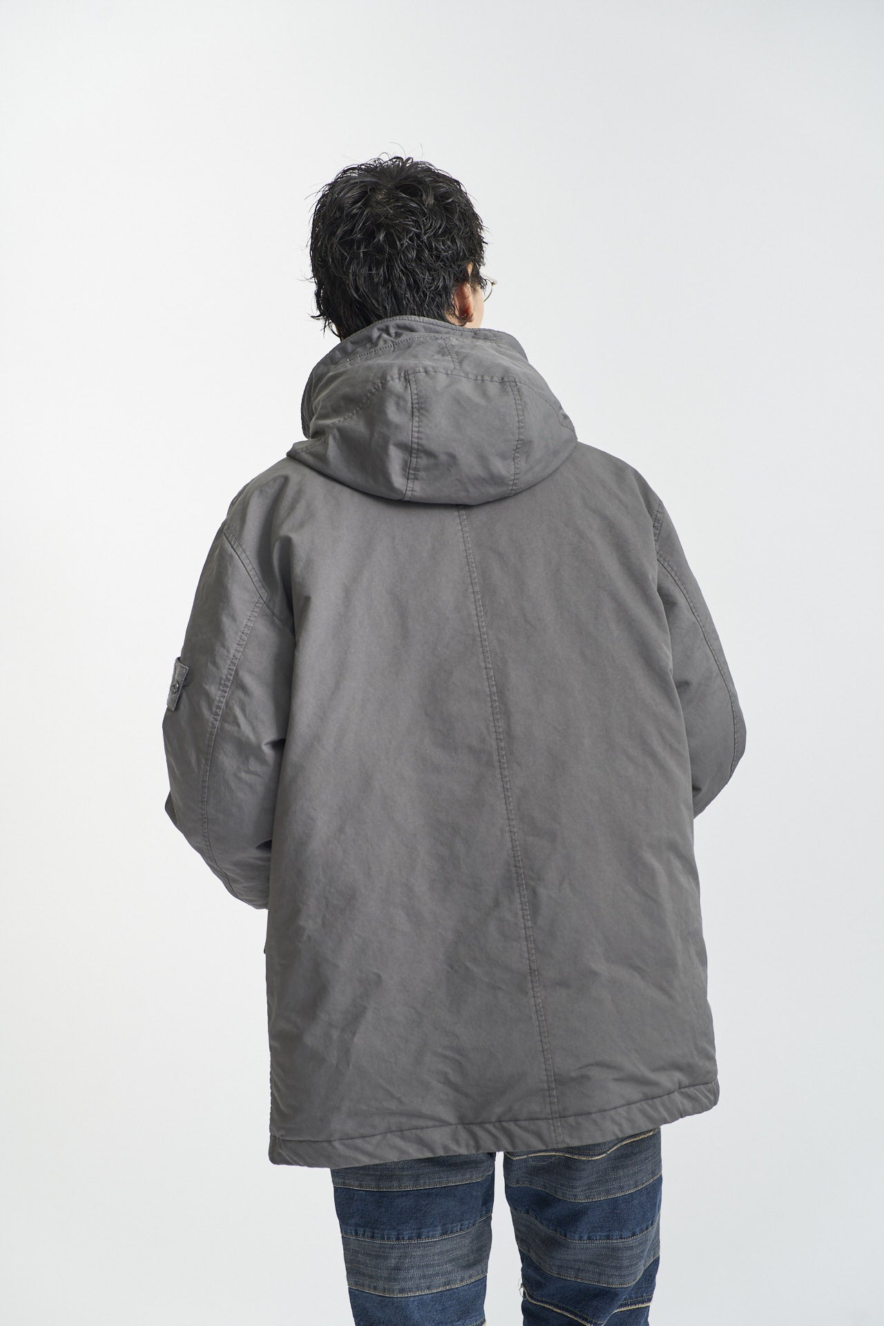 「ダウンはストーンアイランドのロングパーカをチョイス。ミリタリーにおけるカモフラージュのコンセプトから生まれ、全てが単色で仕上げられているのがいい」。
