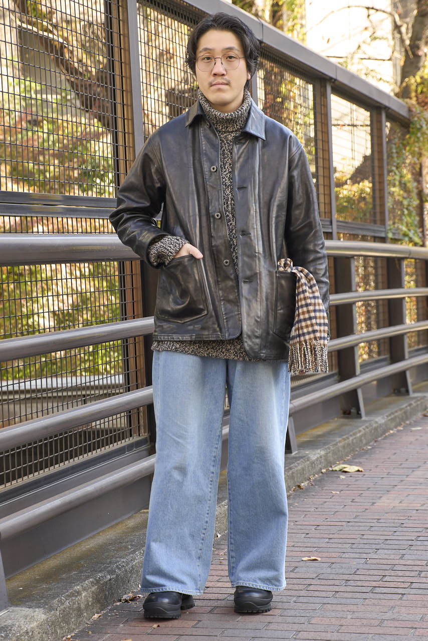 「スニーカーのカテゴリーの中では綺麗めな印象が強かったので、レザーのカーコートと上品なニットを合わせています。底が厚くボリュームがあるなと感じたので裾幅の広いワイドストレートのデニムでコーディネートしました」。