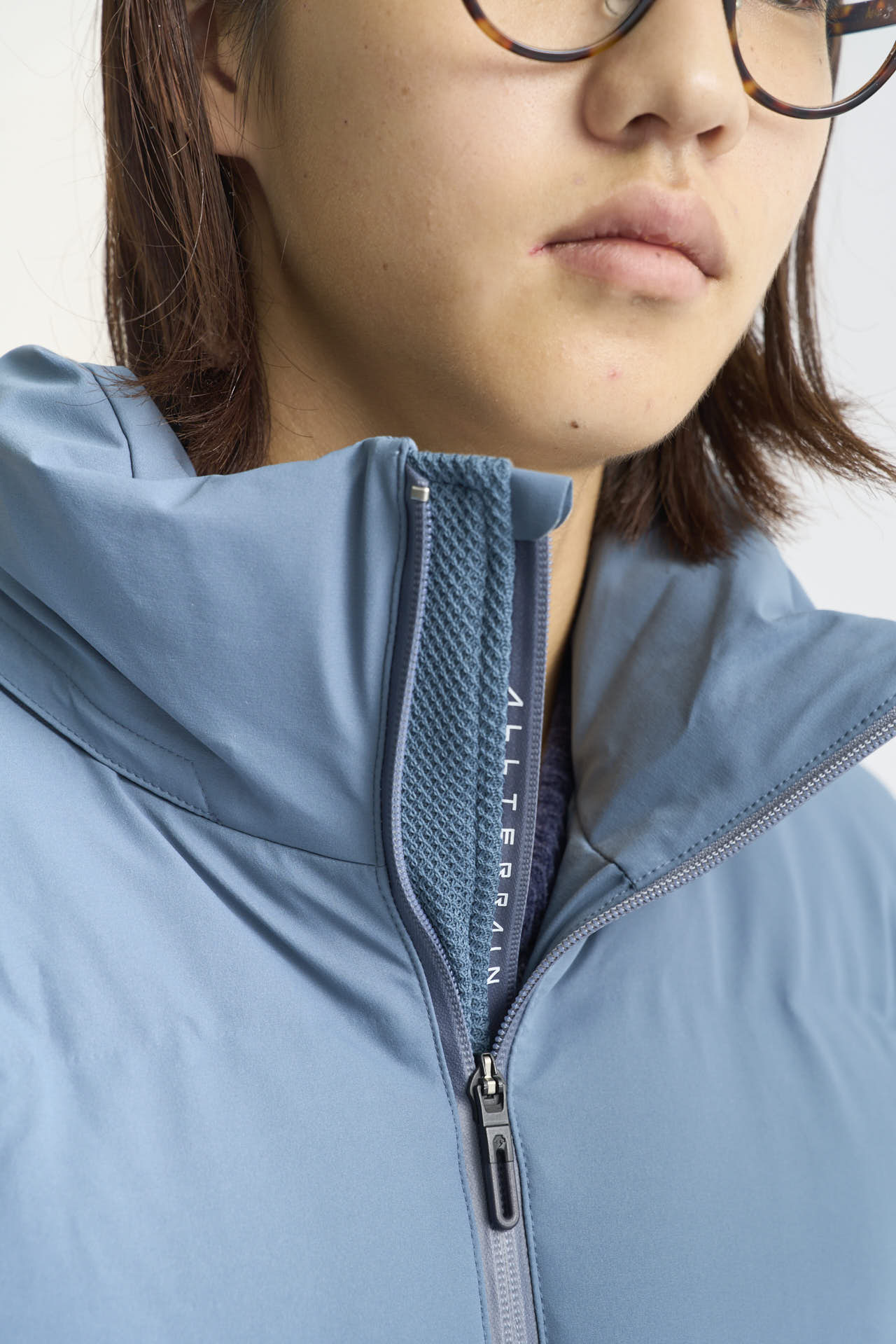 フロントジッパー部分には、デサント独自のデュアルジップベンチレーションシステムが採用されている。2列のジッパーとその間に配置されたメッシュ生地により衣服内に外気を取り込み、ジャケット内にこもりやすい不快な熱や湿気を逃がしてくれるので、着心地はまさに快適!