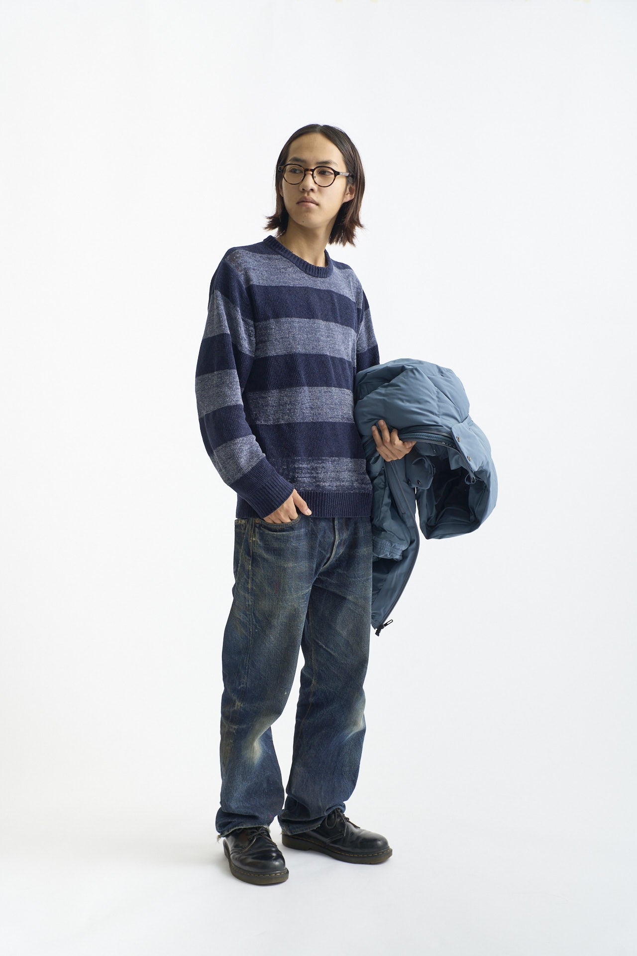 「普段から寒色系の服を着ることが多いので、青みのあるスチールグレーのダウンをチョイス。中に着たボーダー柄のセーターはダウンに合わせてジャストサイズのものを選んでバランスを取りました」。