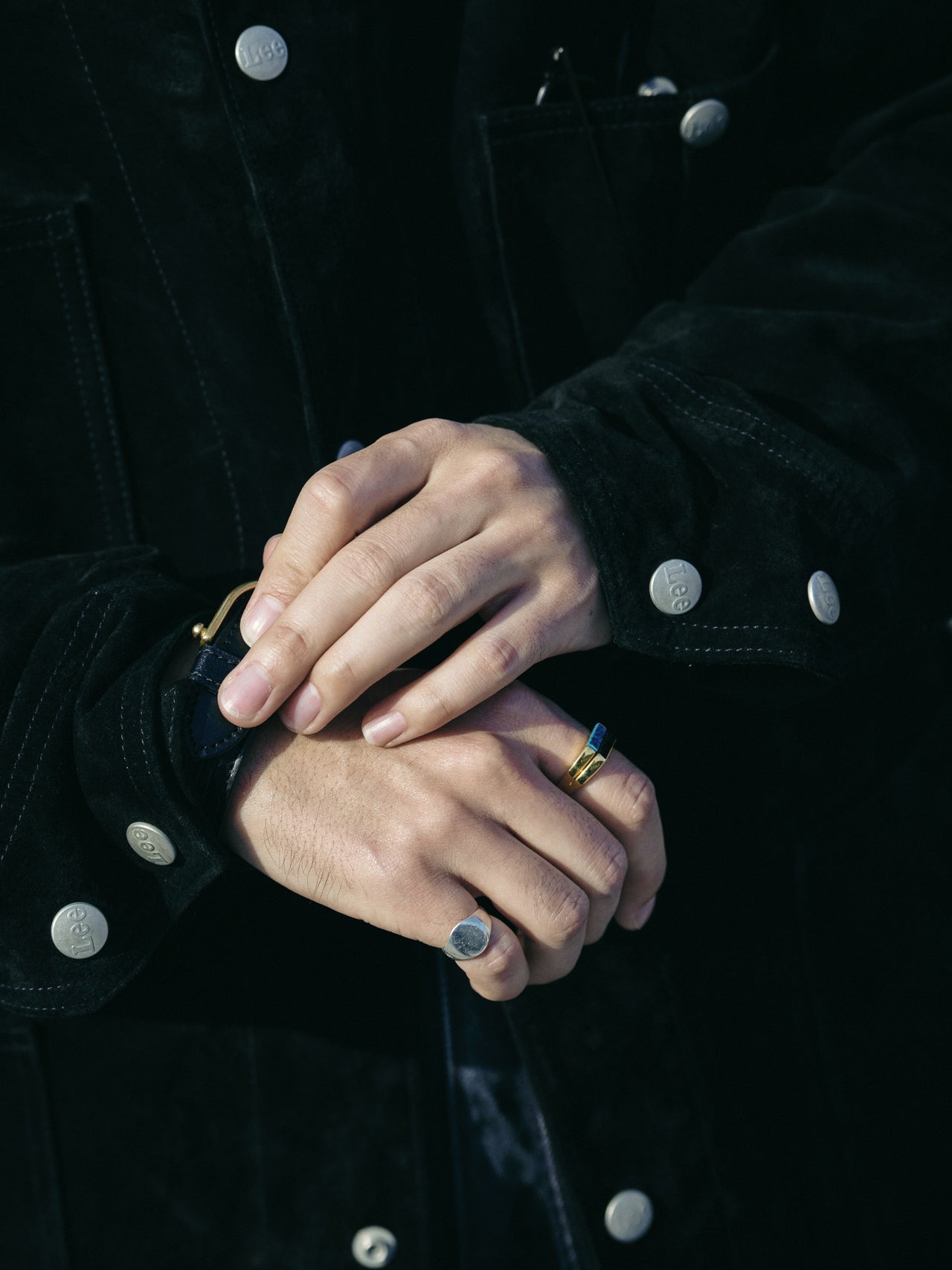 【コワザ】中に着たジャケットのチョークストライプをはじめ、暗めの色味で全身を統一し、ゴールドのアクセを引き立たせた。