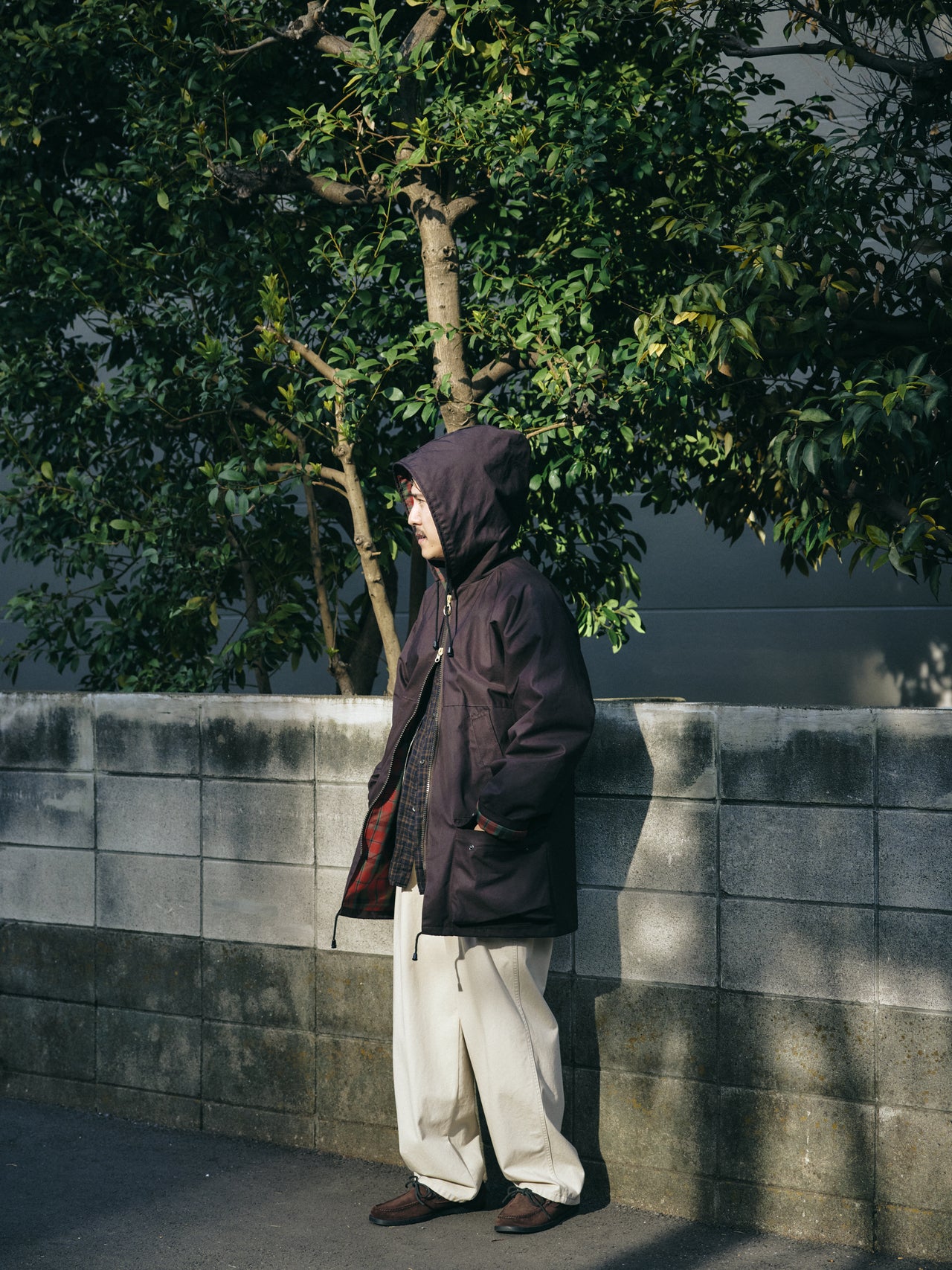 【コワザ】寒い冬にはとくに、フードはちゃんと被って着たい派。怪しい雰囲気にならないよう、足元にキレイめなものを合わせたり、シャツをインナーに。