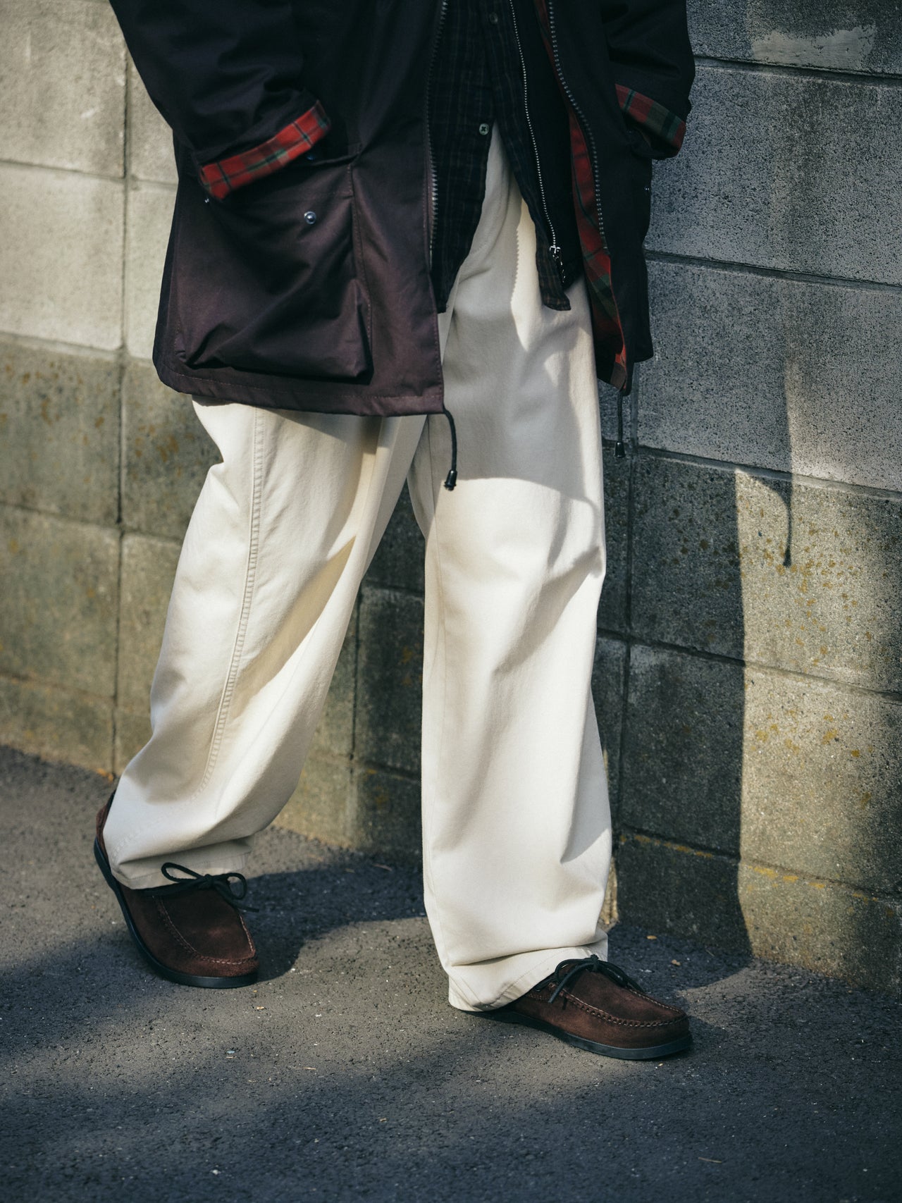 「ペタッとしたデッキシューズが、少し前から気分でした。なかでも茶色のスウェードはどんぴしゃで、ソールが黒なところも、いわゆるデッキシューズ感が払拭されて上品」