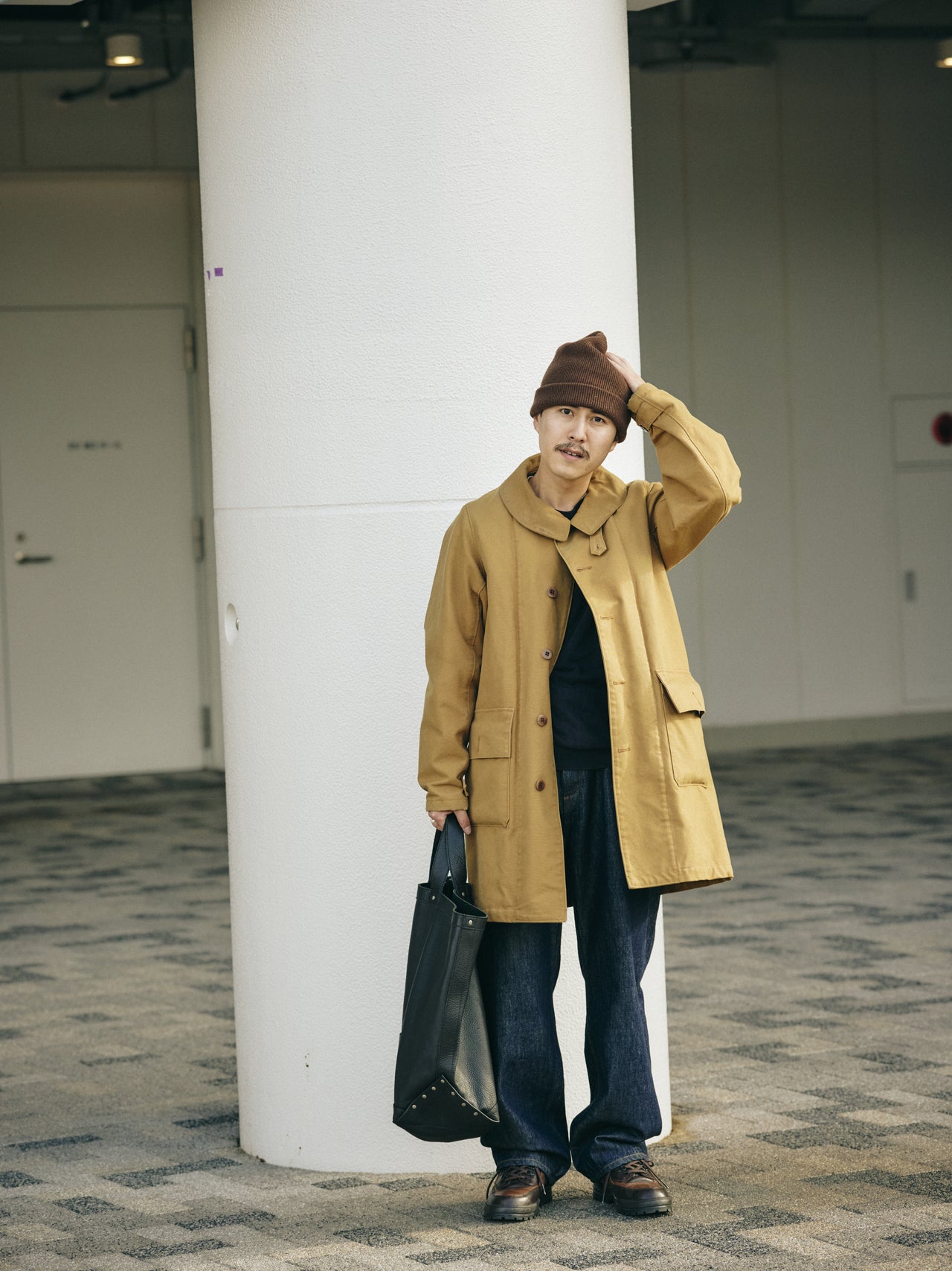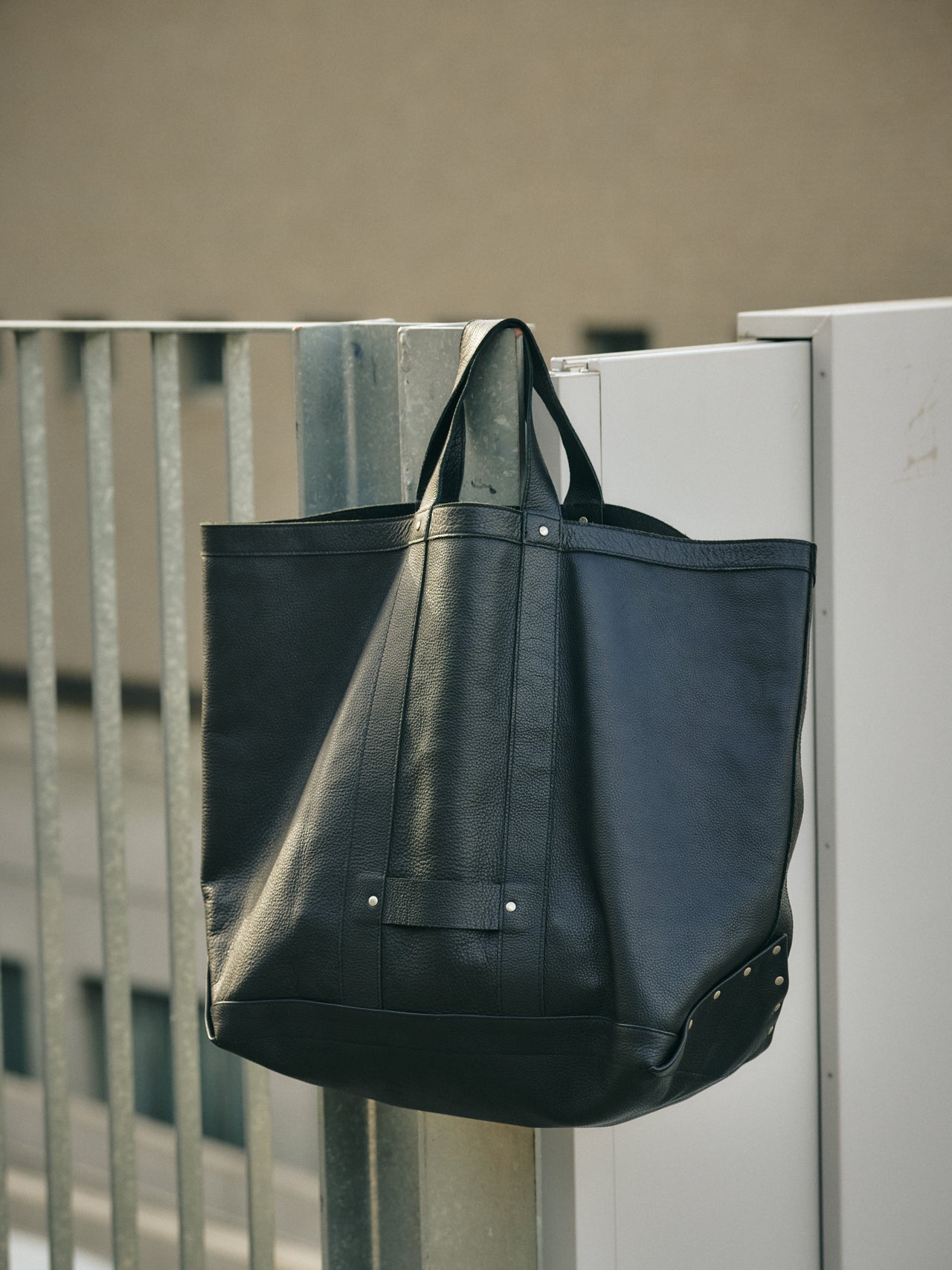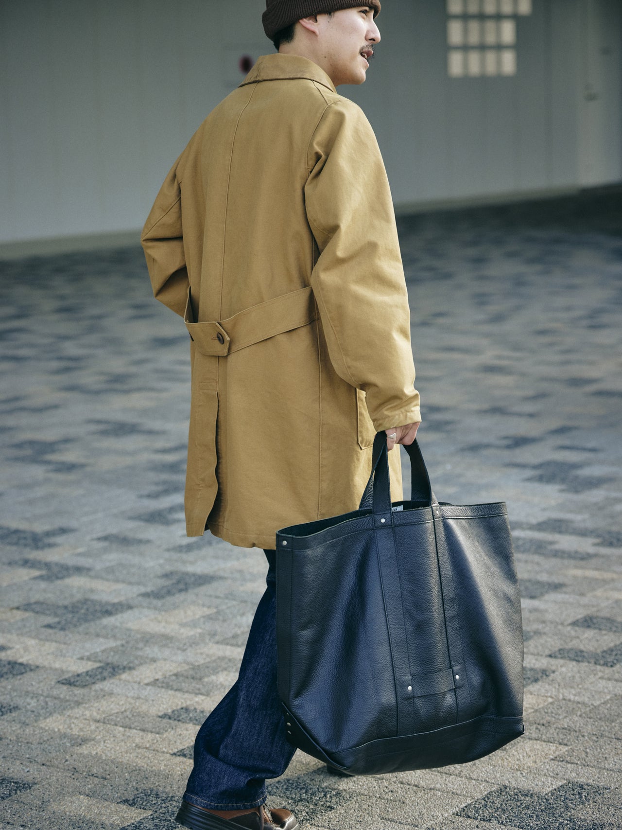 「普段はバッグを持ちませんが、仕事のときに大きめのトートを持つのは好きです。通常スウェードで展開しているこのモデルを、特別にシボ革に変更した別注品。シボ革の高級感と、クタッとしたバランスが気に入っています」