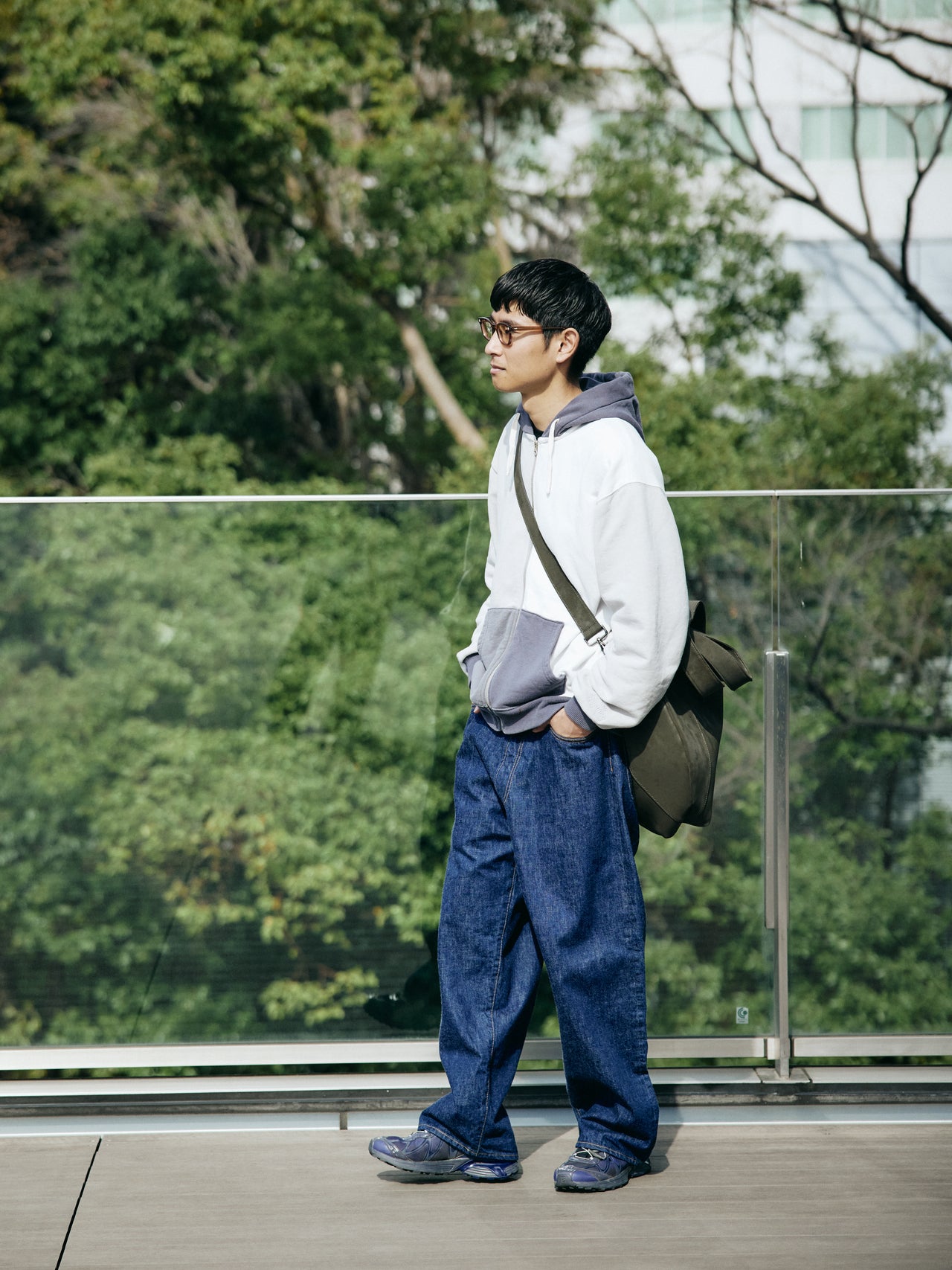 【コワザ】“今っぽさ”を意識しすぎないカジュアルな上下を、ヴィーガンレザーの端正な質感を差すことで引き締めた