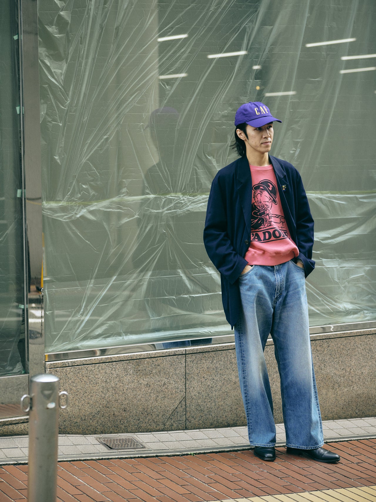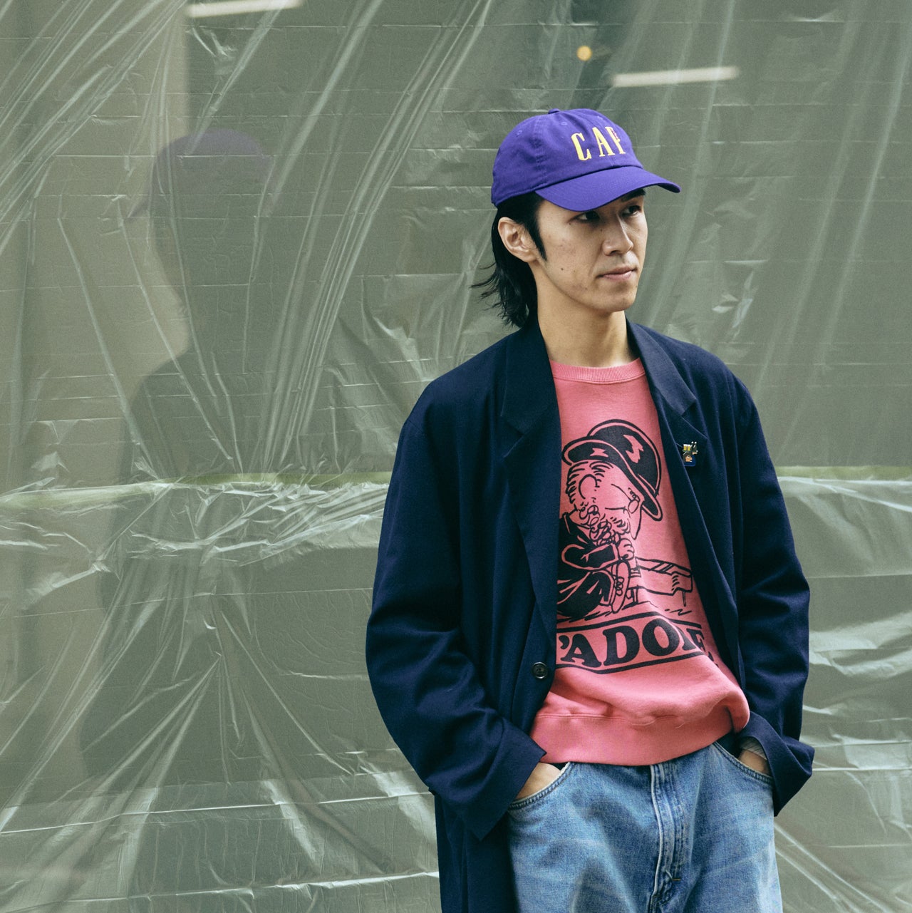 【コワザ】キャップのユーモラスなデザインを活かすように、ピンクのスウェットを合わせた。カラーミックスの遊び心あるスタイリングに