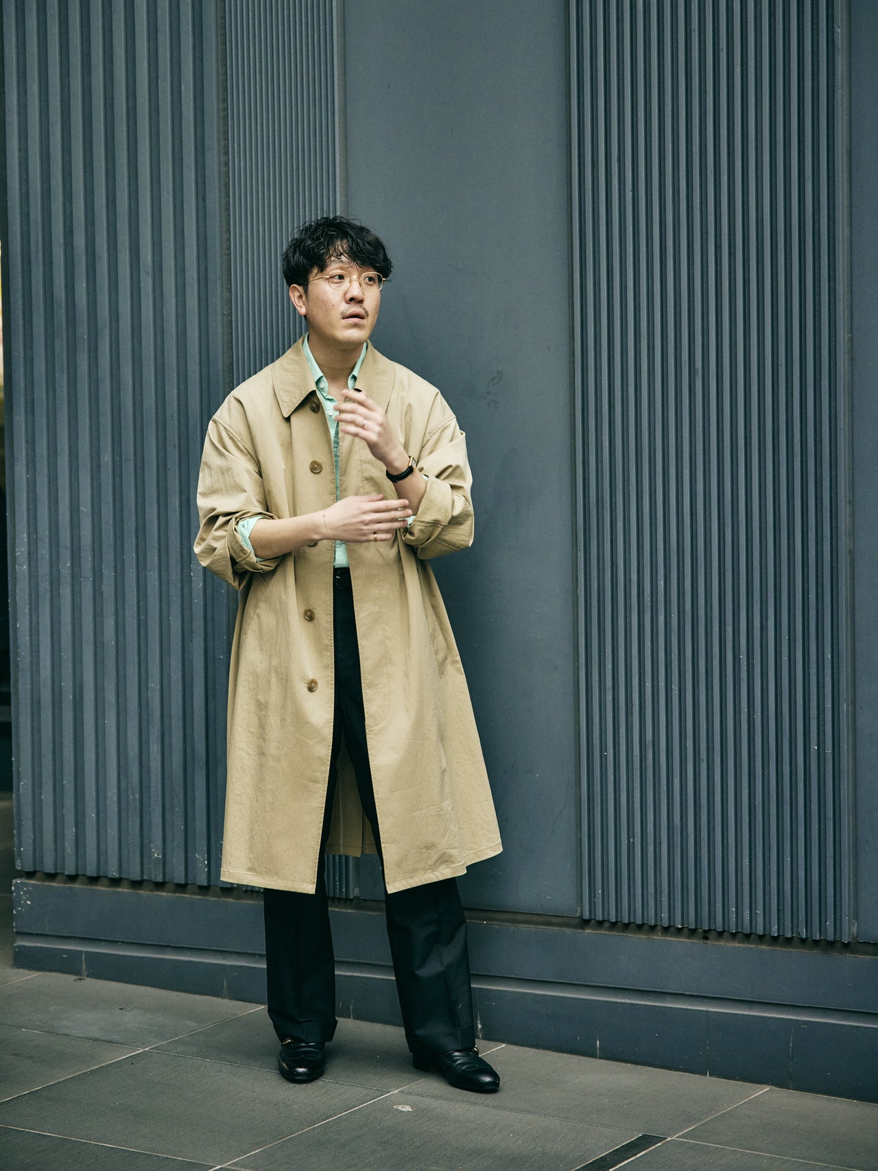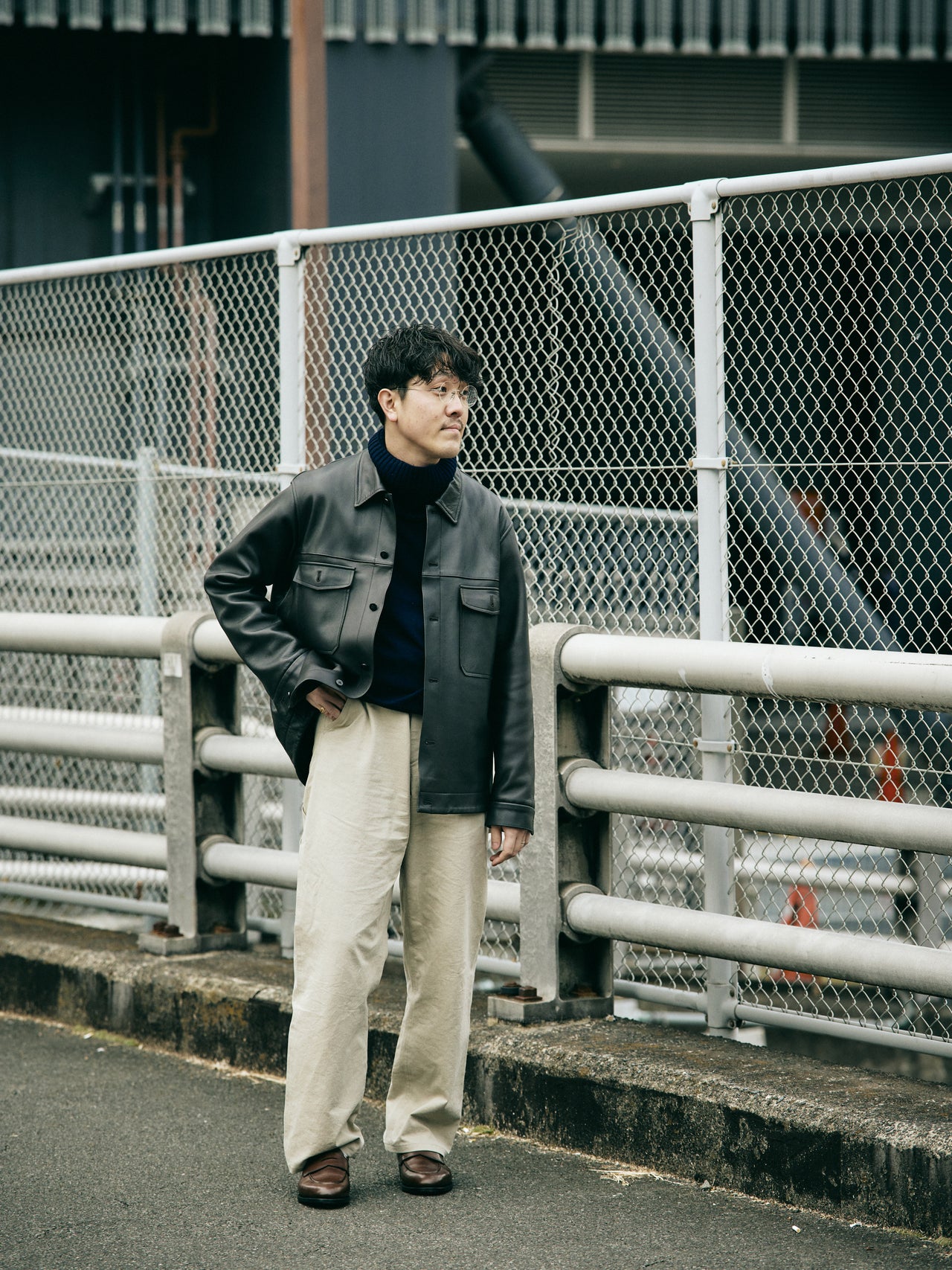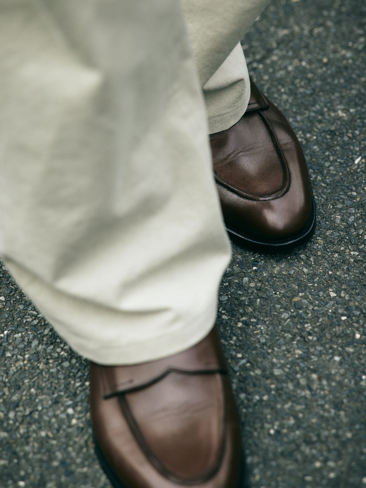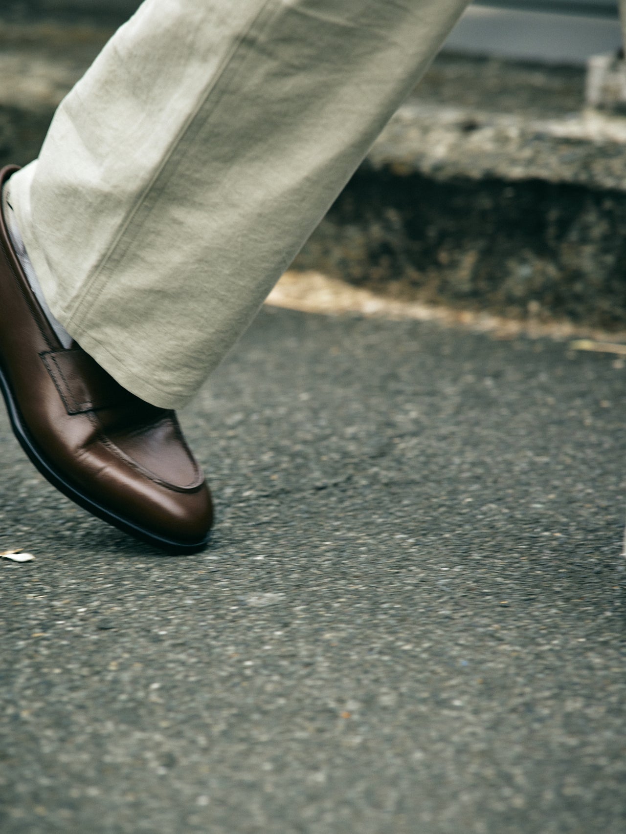 【コワザ】シューズのブラウンが際立つよう、淡いトーンのパンツを選んだ。上質な靴に引っ張られすぎない、コンフォータブルなスタイルに