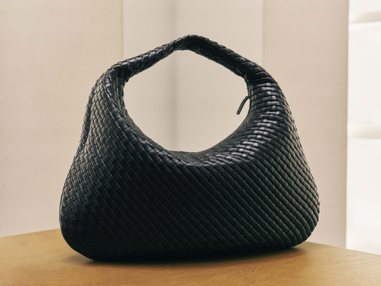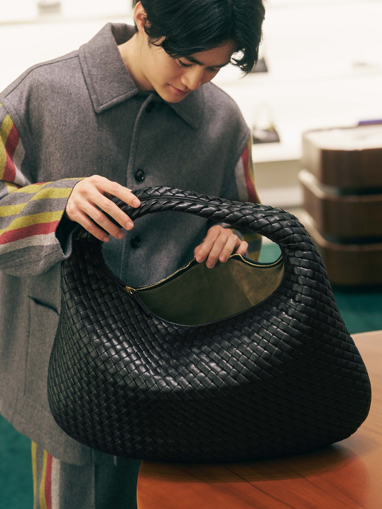 ボッテガ・ヴェネタのアトリエで職人が実際に使用するテーブルから着想を得た什器、La Tavolaが設置され、2026年プレスプリングの新作やホリデーアイテムが並ぶボッテガ・ヴェネタ 銀座フラッグシップの店内。この日、鈴鹿が着用しているような温もりのある生地感やカラフルなラインが施された気分の上がる洋服には、可愛げなフォルムのバッグを持つのがおすすめだ。この「マキシ ヴェネタ」はまさにそれ。