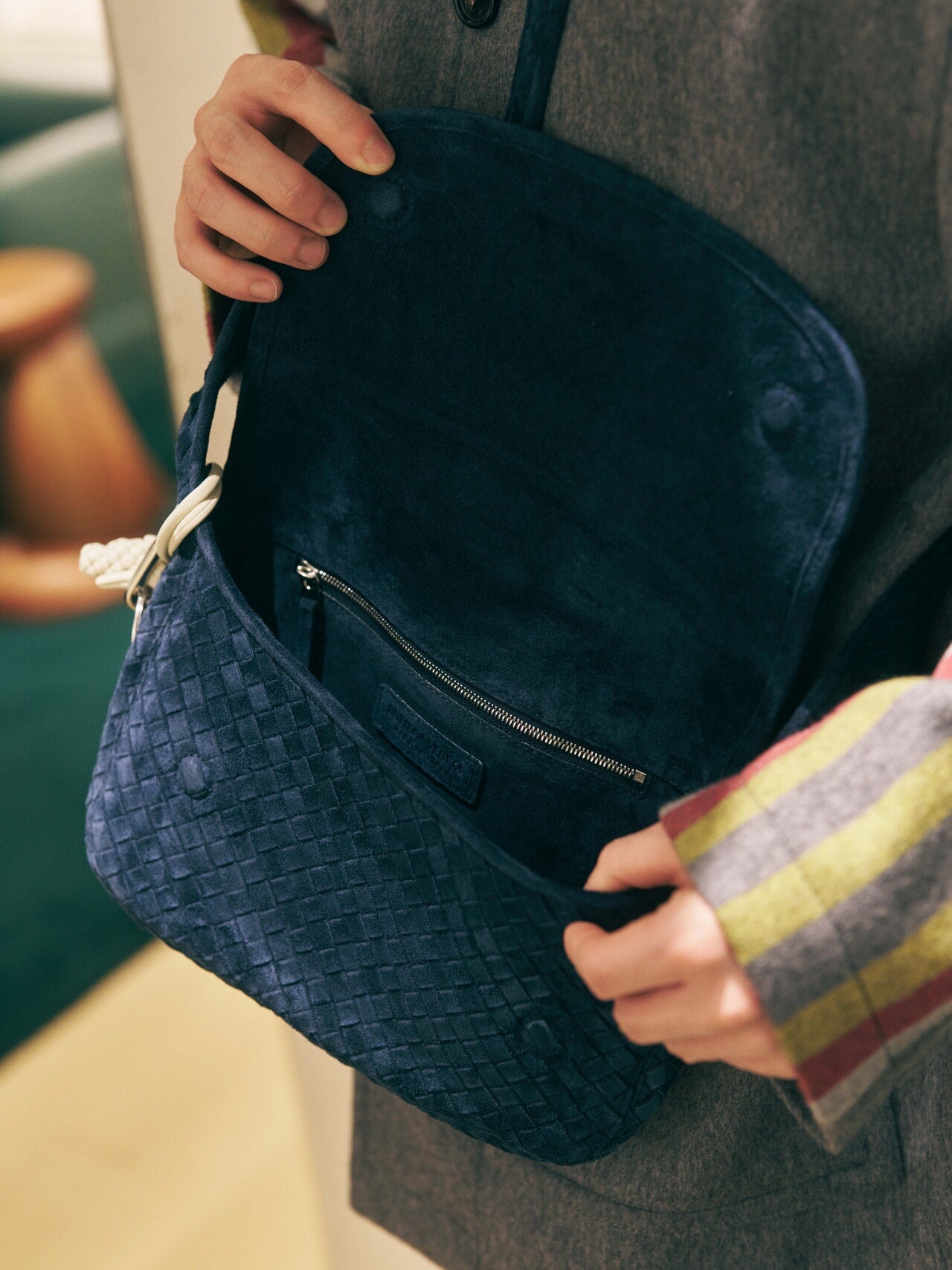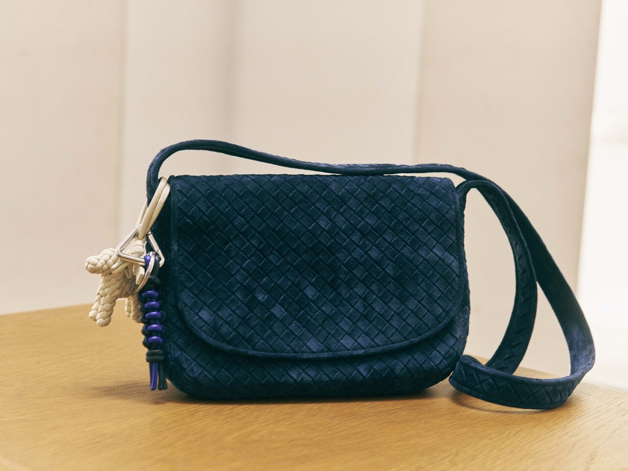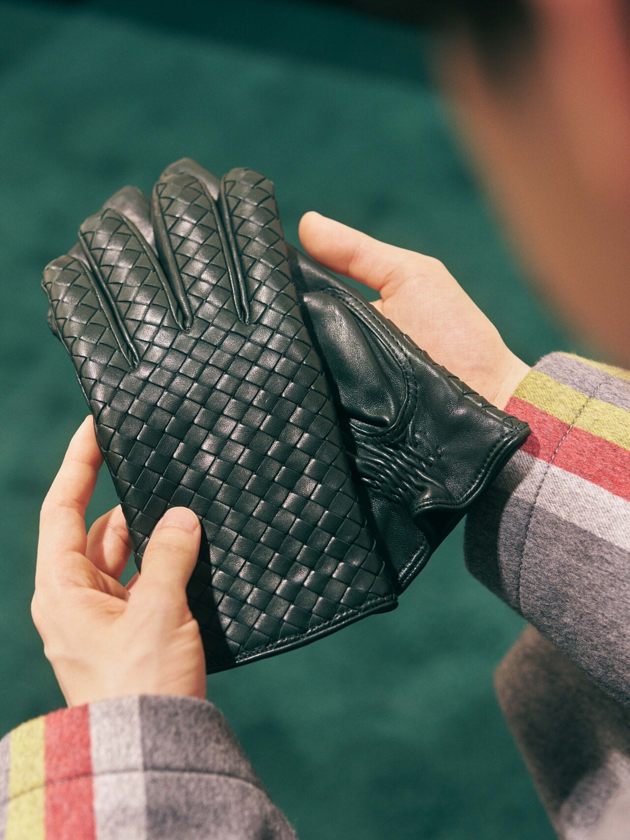 ボッテガ・ヴェネタのアイコンで、僕たちの憧れのデザインでもあるイントレチャート。イタリア語で“手編み込み”を意味する言葉で、レザーをテープ状に裁断して、職人が手作業で丁寧に編み込んでいく技法のこと。毛足のあるスエードを使用したこのメッセンジャーバッグもそうやって作られている。