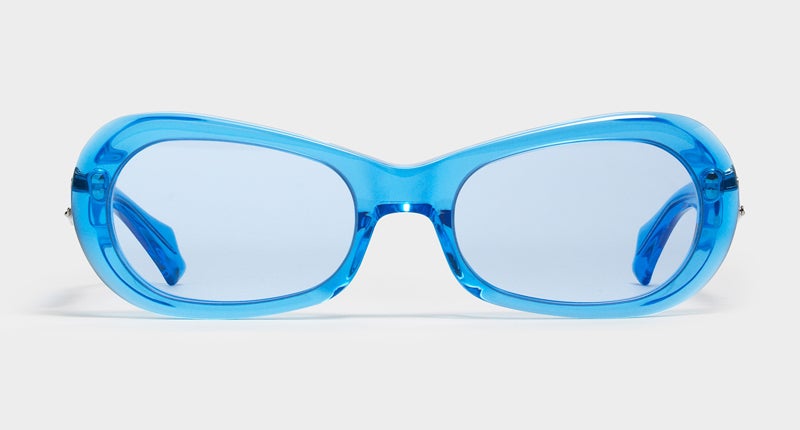 第一弾ではクリア素材のヒューチャリスティックなデザインだった。今回発表する第二弾は、大胆なカラードローストリングとカラビナを採用したユニークなデザインのアイウェア2型各3色だ。