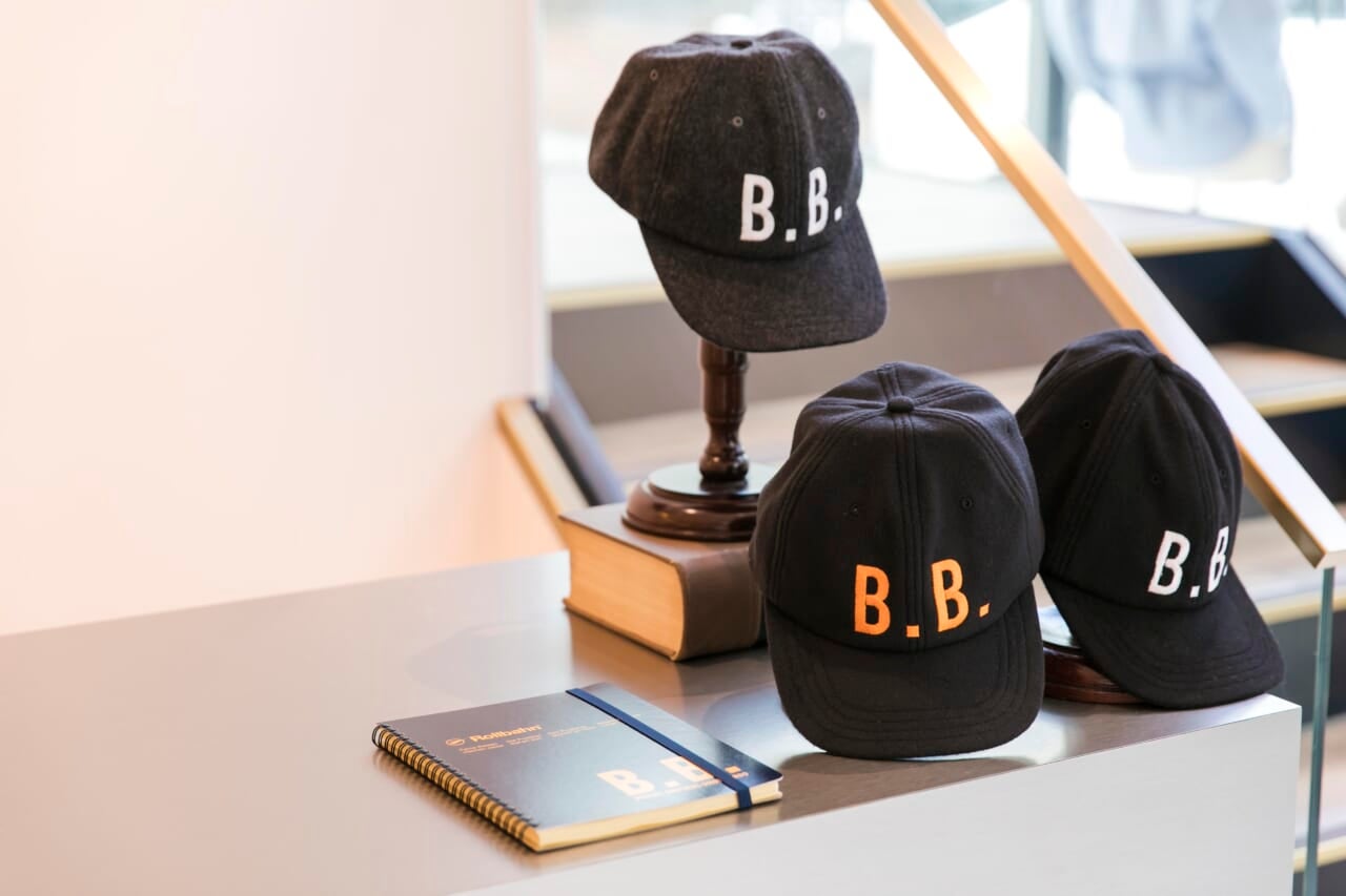 注目アイテムは、日本上陸40周年のランウェイで話題になり、商品化された「B.B.」ロゴ入りのアメリカ製ベースボールキャップ。ネイビー地にオレンジロゴのタイプは「ブルックス ブラザーズ 表参道」だけで取り扱う限定商品となる。