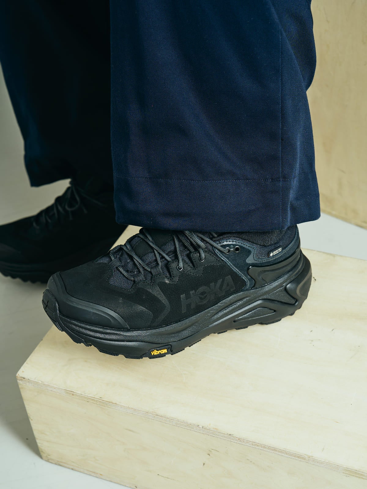 ホカが誇るベストセラーモデル「カハ 3 ロー GTX」。長距離ハイクもカバーするクッション性に優れたソックライナーや反発力を向上させた2層構造EVAミッドソールが特徴だ。砂利の侵入を緩和するアキレス腱に沿ったヒールカラーに、緩んだ路面もしっかり捉えるVibram® Megagripアウトソールをオン。トレンドの厚底がデイリーファッションを格上げしてくれる。