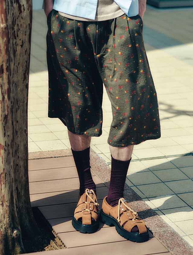 タフな印象のグルカタイプのレザーサンダルは逆にチャーミングな花柄ショーツをぶつけギャップを楽しむ。バーガンディのモダンなソックスなら遊びはあってもハズしすぎない。