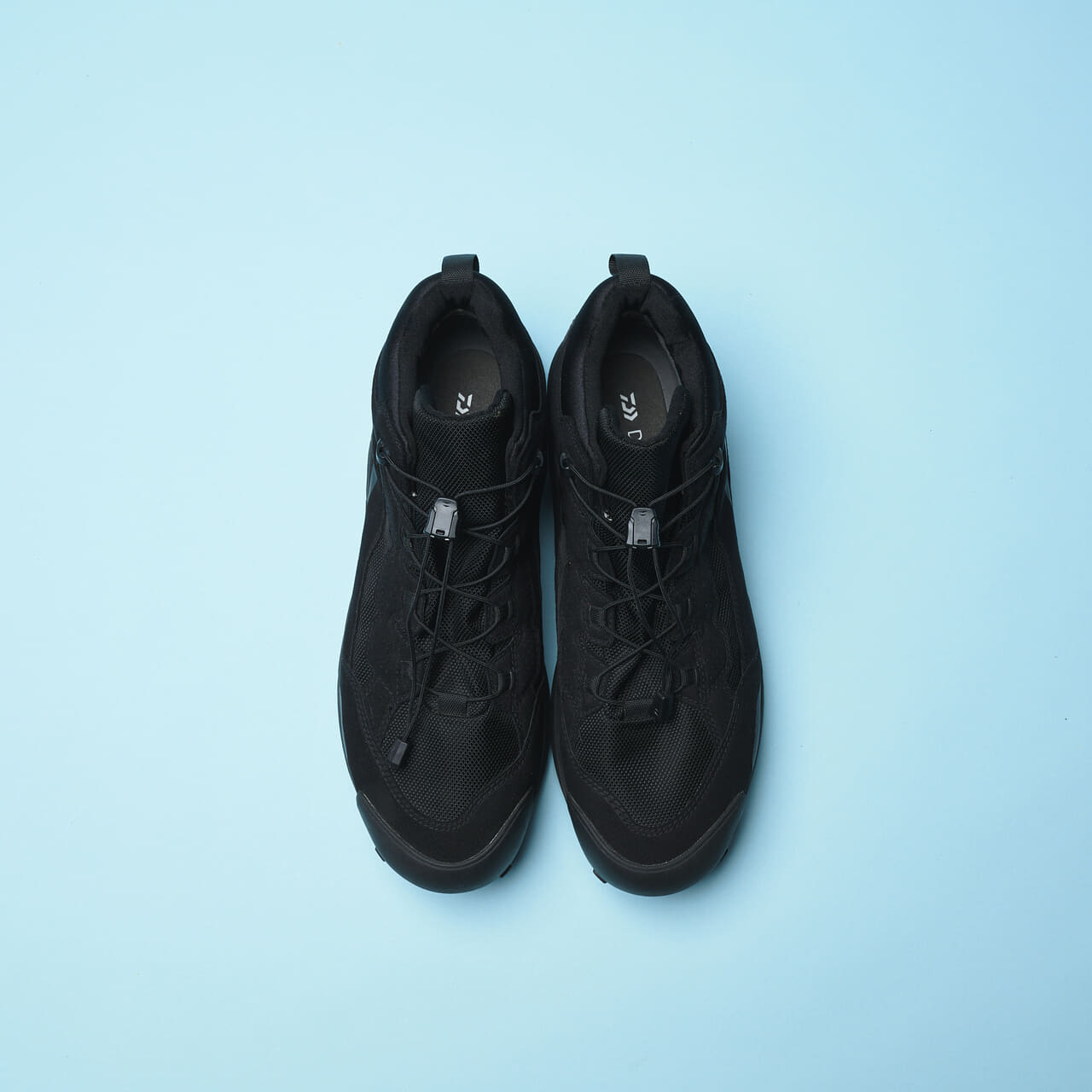 デサントのシェルジャケットの製造に用いる接着技術を応用したミニマルなルックスが特徴。透湿防水性をキープしながら、足を包み込んでくれる柔らかな履き心地もポイントだ。靴内部の段差を極力なくすことで、足当たりを軽減し快適性をアップ。オリジナルのシューレースシステムで着脱もストレスフリーになっている。革靴のようなスマートなトゥのフォルムと洗練のオールブラックがソリッドで品のあるムードを演出。
