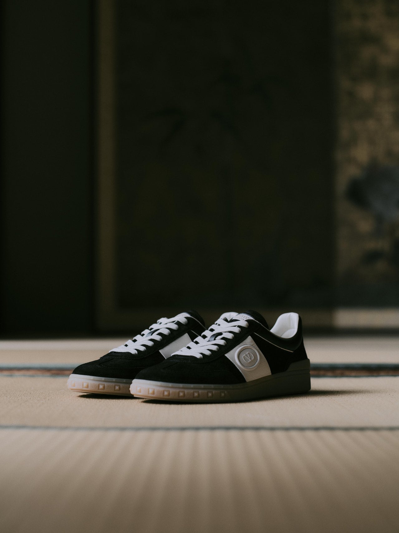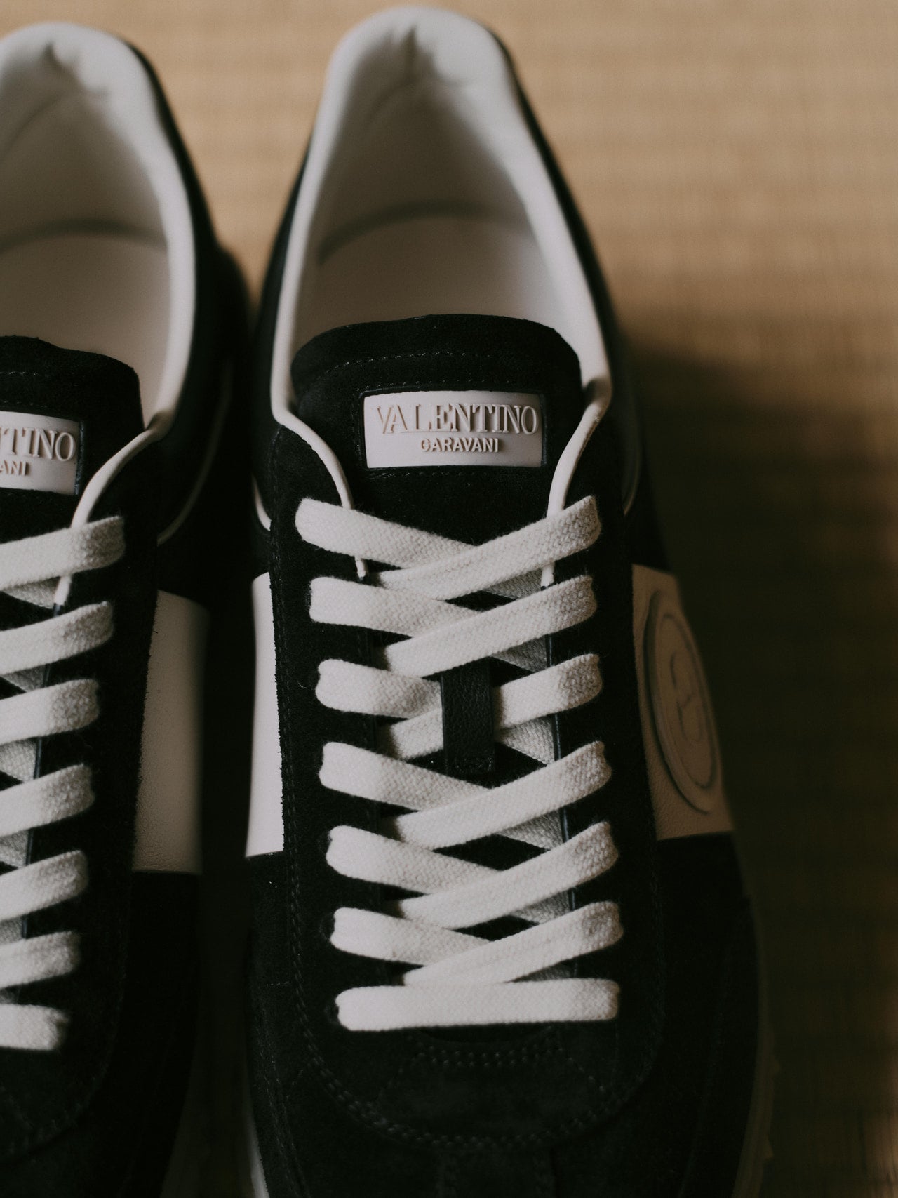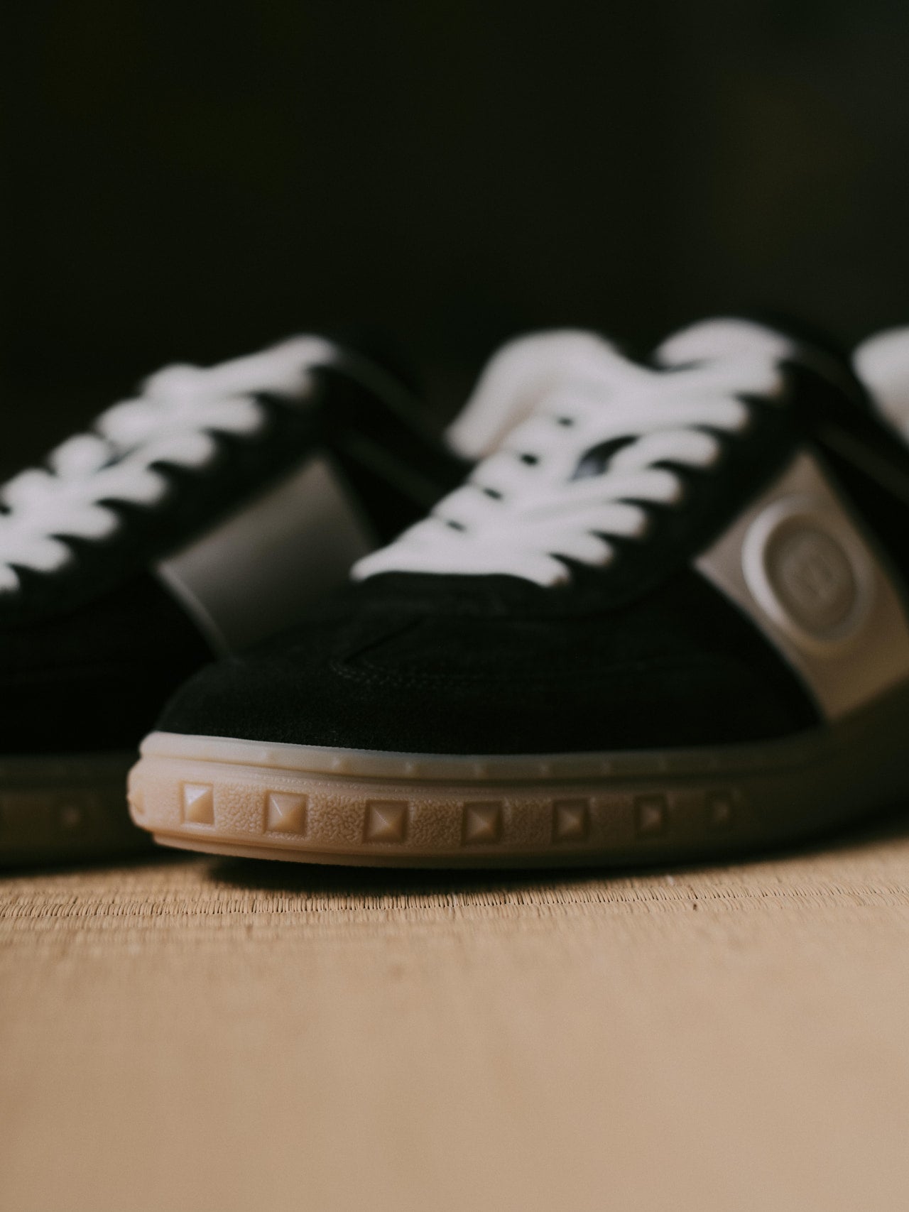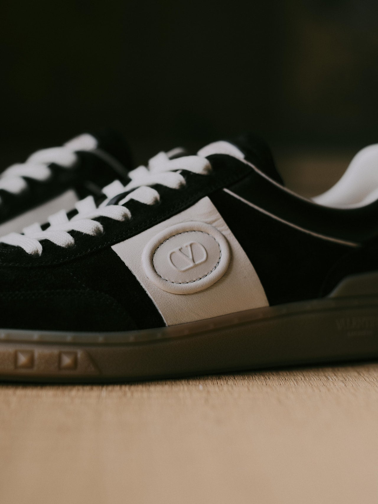 柔らかくしなやかなスエードを採用。Vロゴ シグネチャーのディテールが入ったレザーパッチやタンのヴァレンティノ ガラヴァーニ ロゴといったデザインが魅力の1足だ。ブラックとオフホワイトの配色にスタッズディテールのカスタムラバーソールという今っぽい組み合わせはさまざまなスタイルによくなじむ。