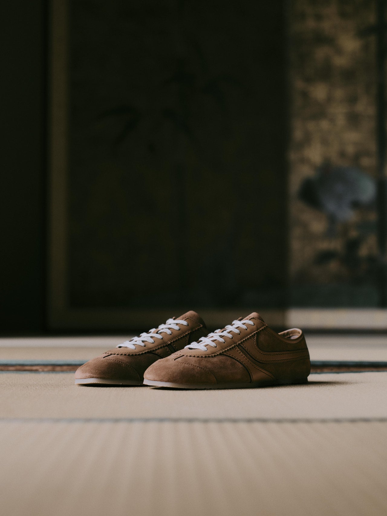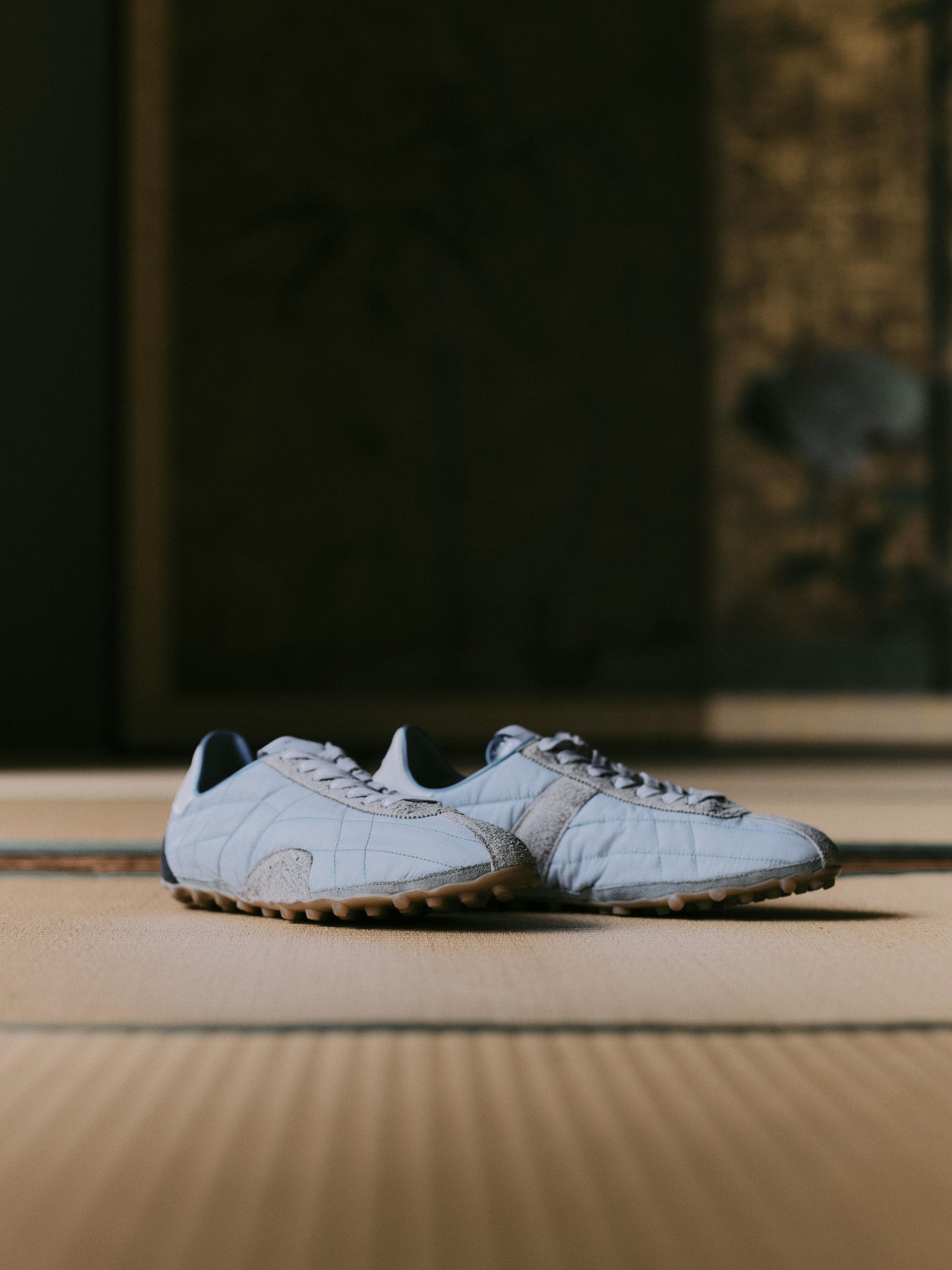1960年代のランニングシューズにインスピレーションを受けた「スプリンターズ」。手作業で施された質感のコントラストによってレトロなスポーツスタイルを現代的に再構築した。キルティング生地とヘアリースエードのアッパーに、コントラストのきいたヒールと精緻なステッチワークのディテールが足もとのいいアクセントに。シュータンに施されたナンバリングロゴもさりげない。