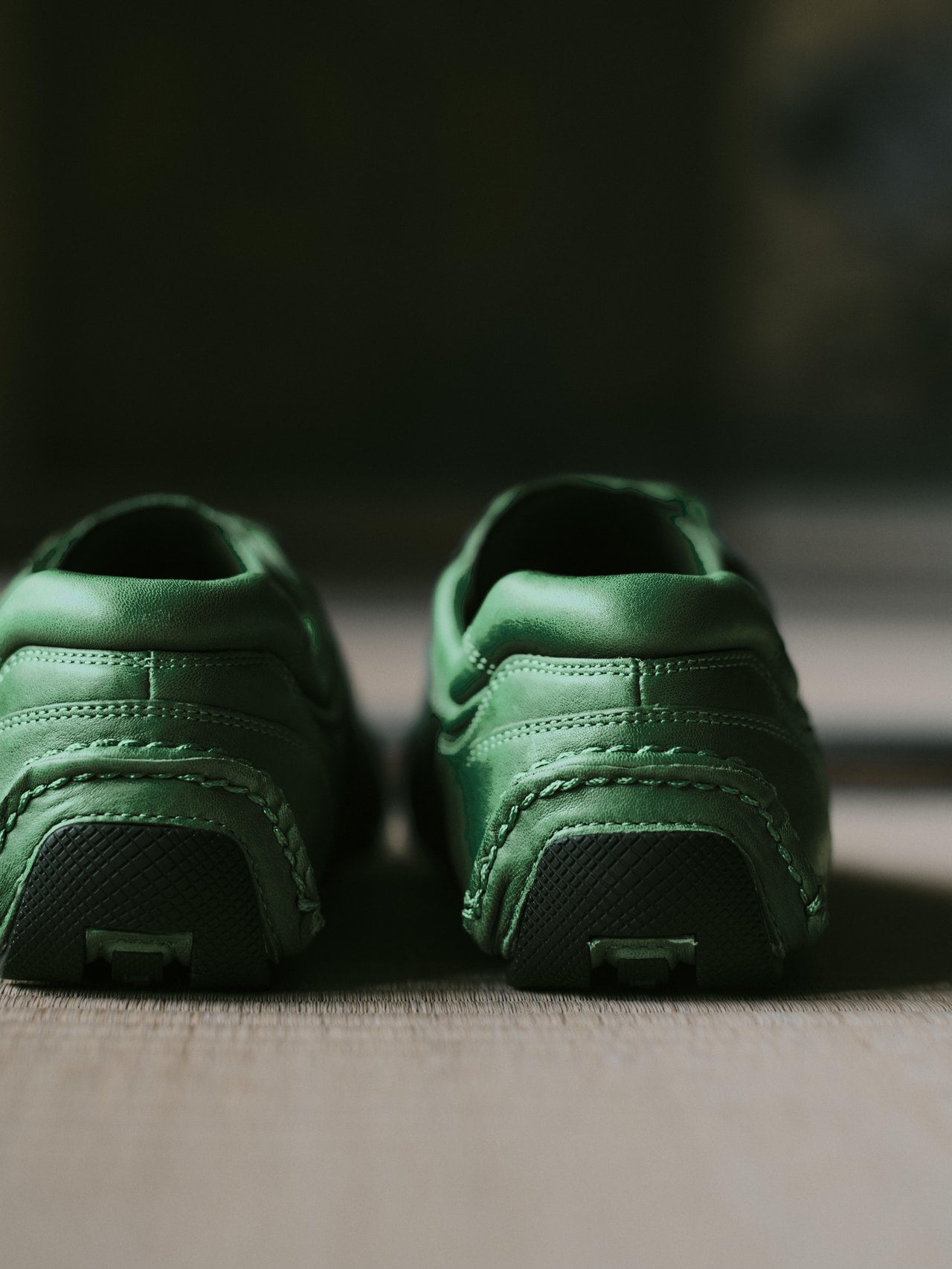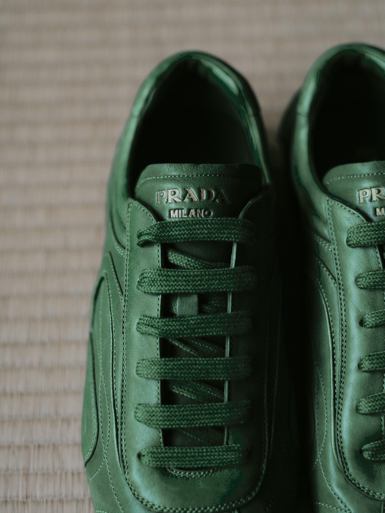 「大人がトレンドのドライビングシューズを履くなら『Prada Montecarlo』スニーカーがおすすめ。オールブラックでまとめたスタイリングにビビッドグリーンをチョイスしてあえて主張されて履くのも良さそう」。