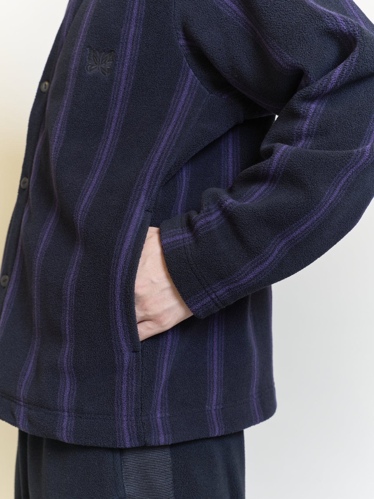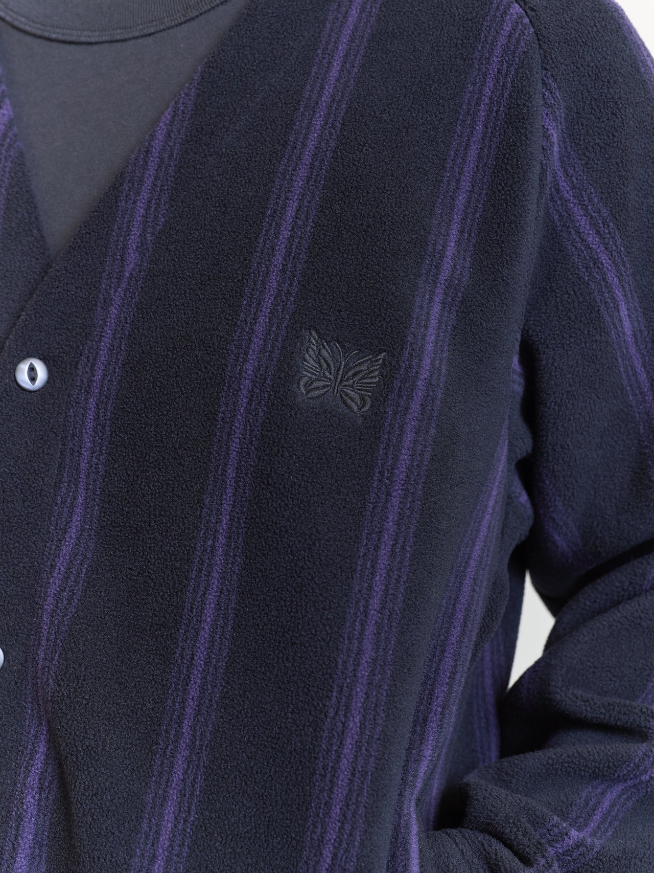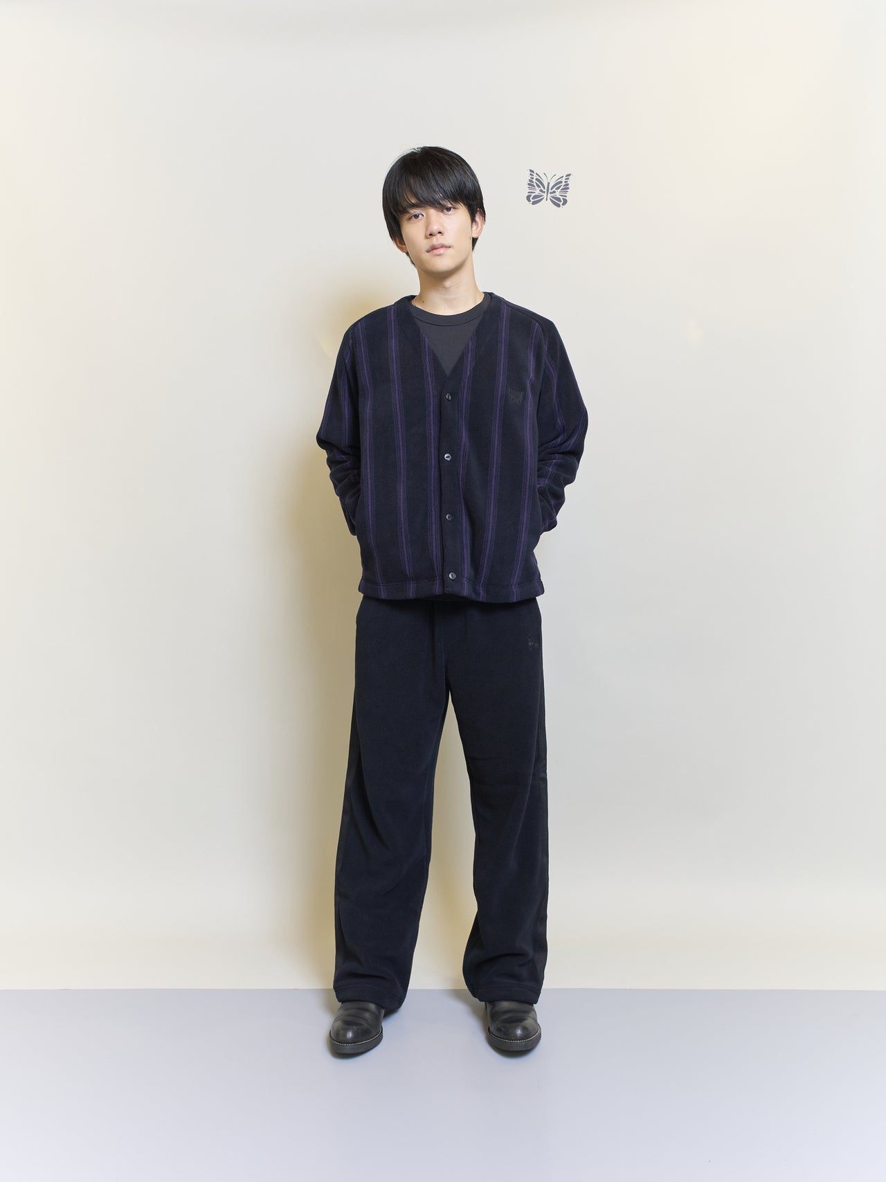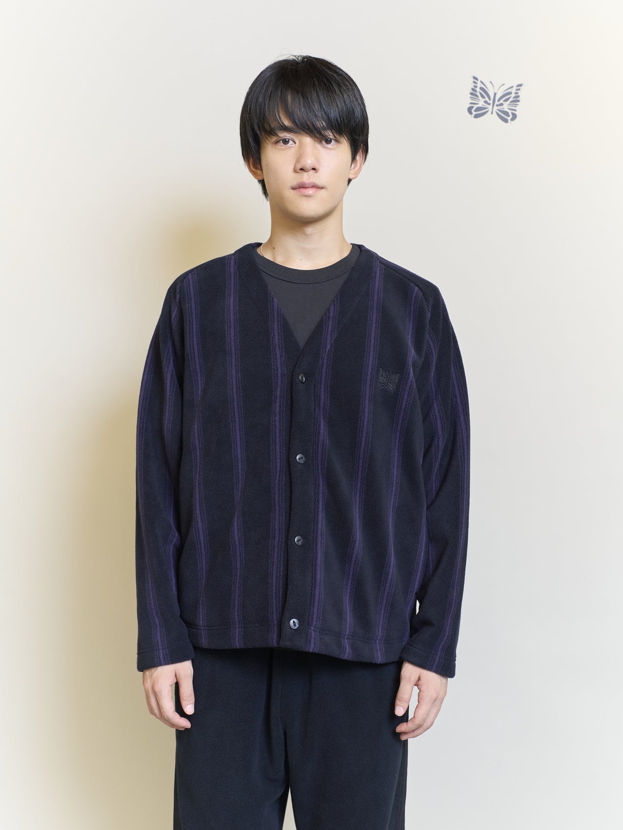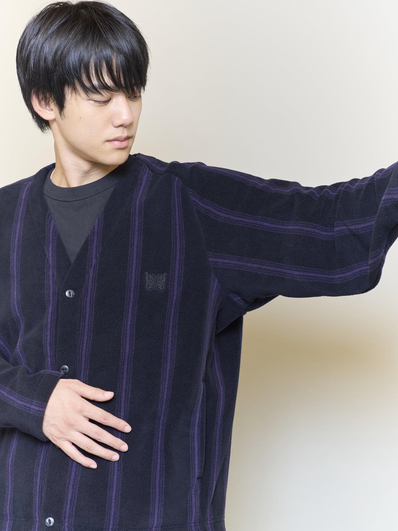 樋之津 次は最多カラーバリエーションのカーディガン。本コラボレーションコレクションの中で一番ニードルズ感の強いアイテムがこれ。ニードルズのアイコンであるバタフライロゴの刺繍と、ニードルズのアイコニックなパープルストライプのプリント柄が施されています。