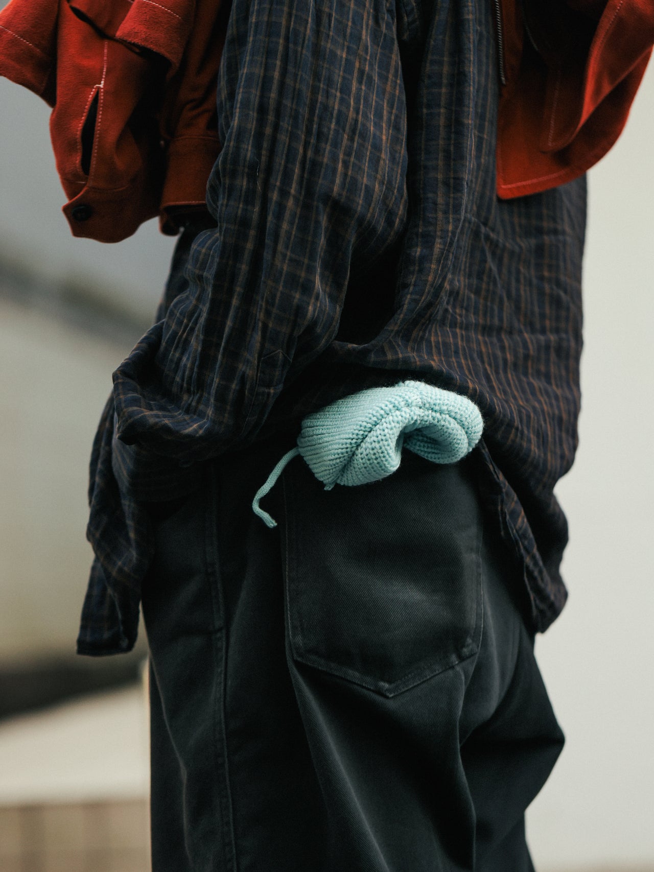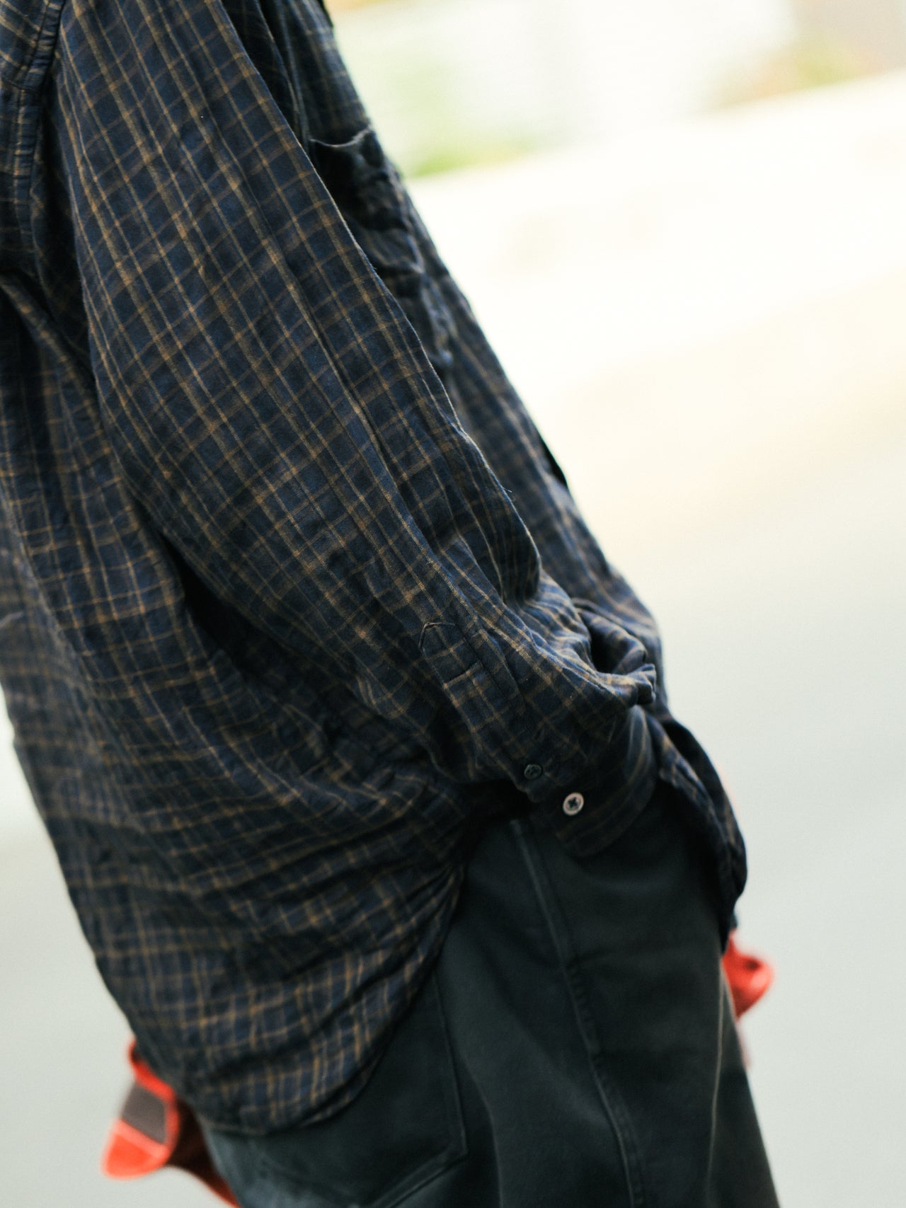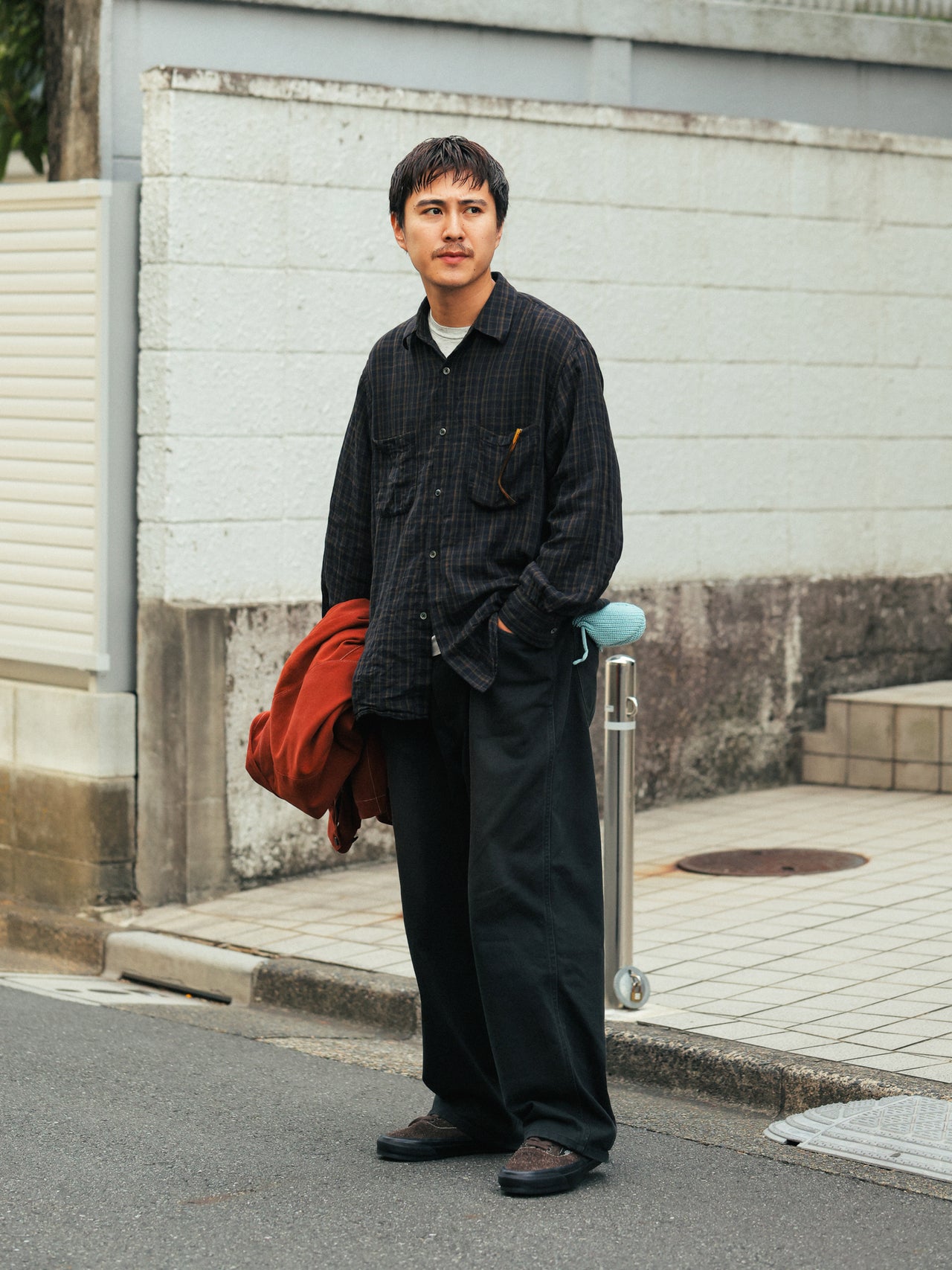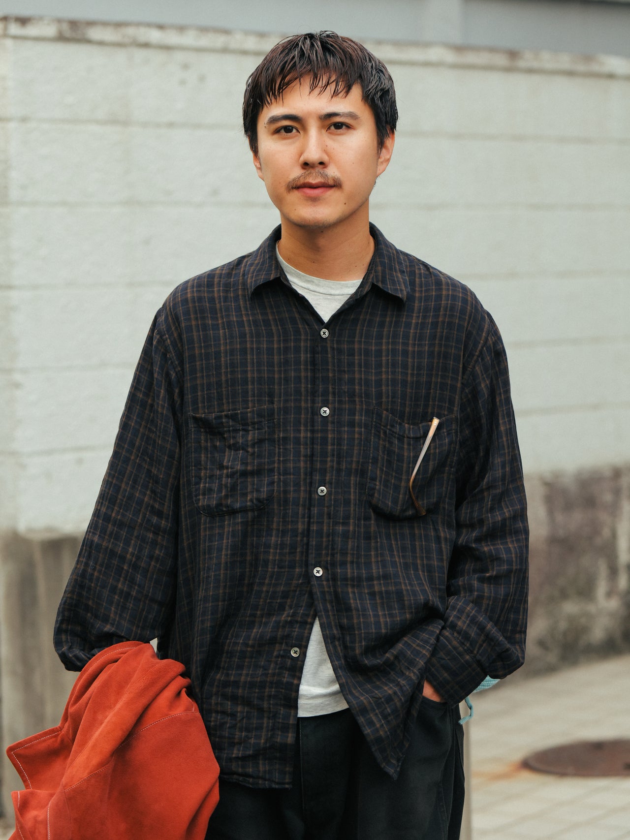 「秋になり始めのこの季節はシャツ一枚でさらっとしがちですが、軽いアウターを持って出たり、帽子をかぶらないけどパンツのポケットに入れたり、アクセサリーとして持つことが多いですね」。