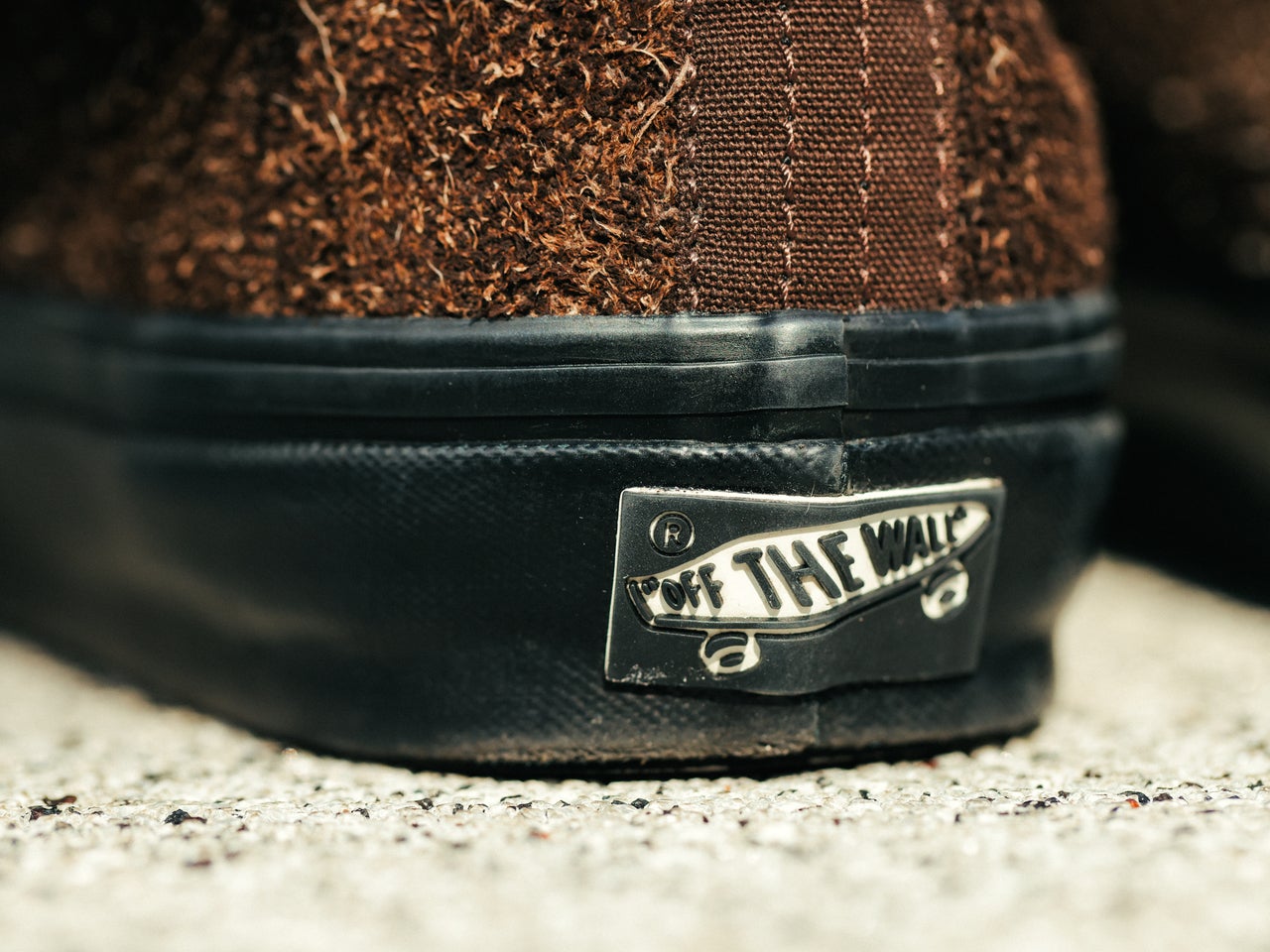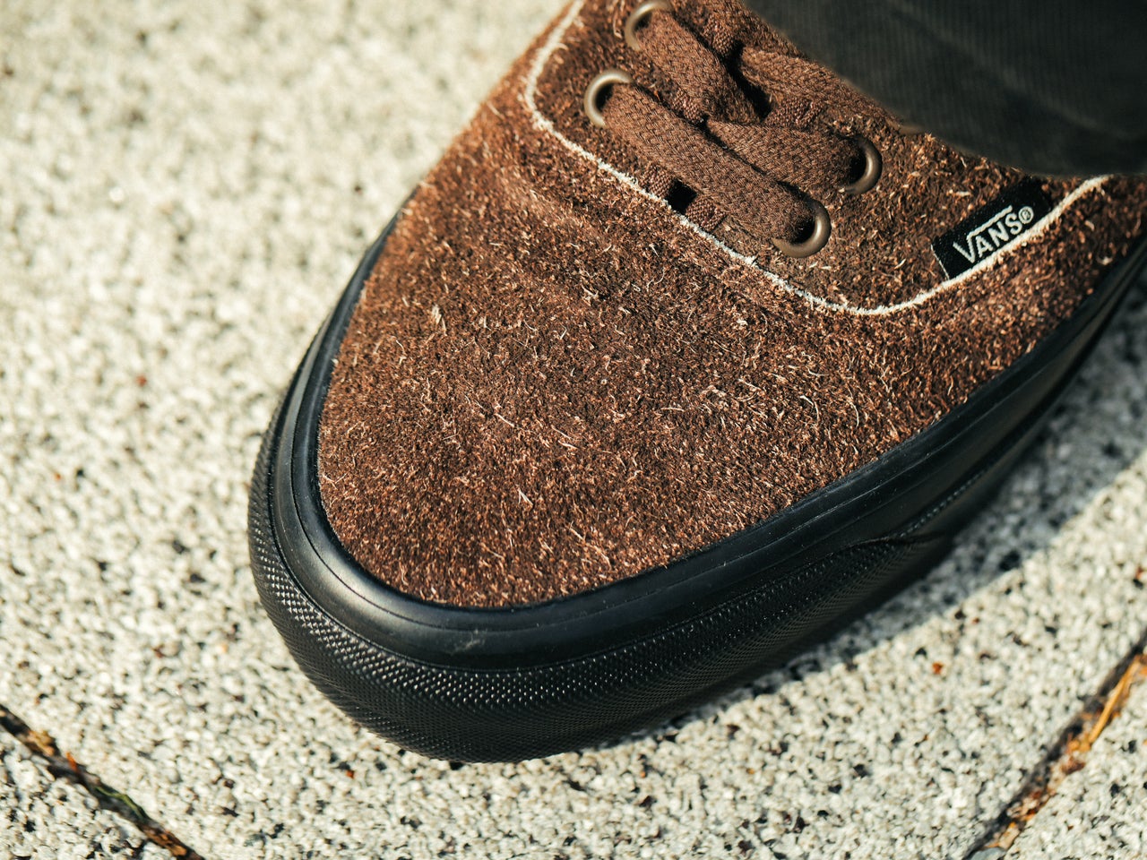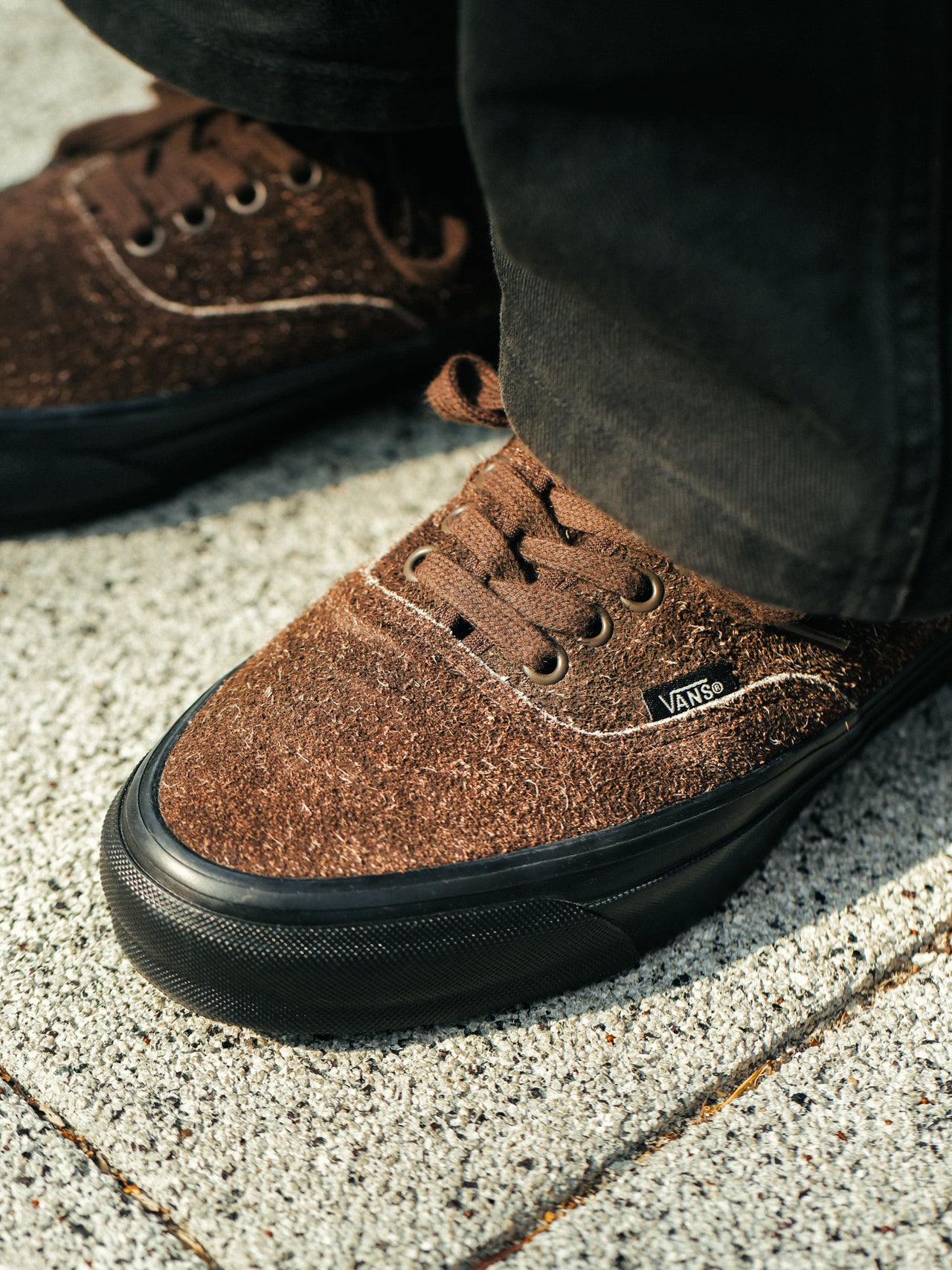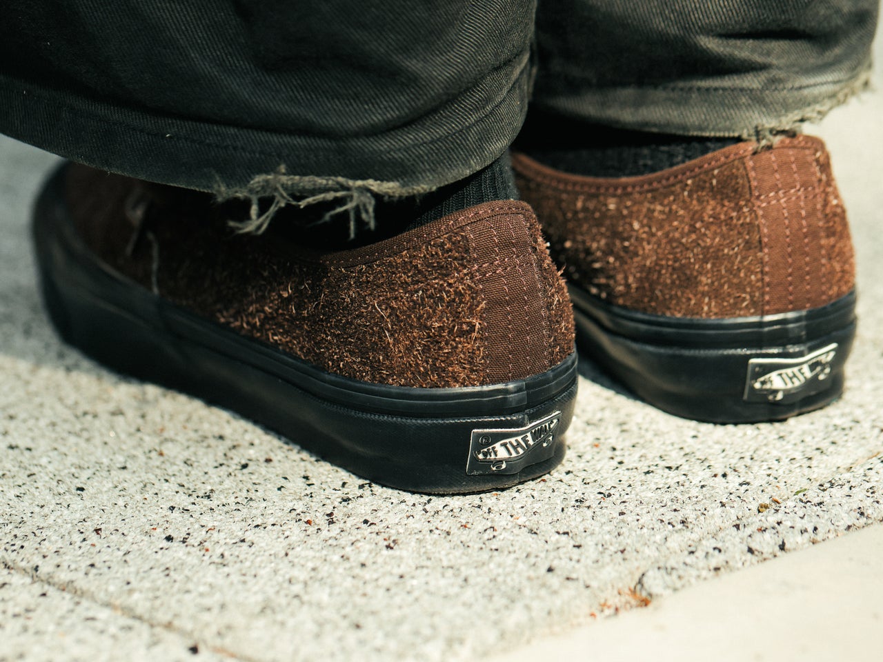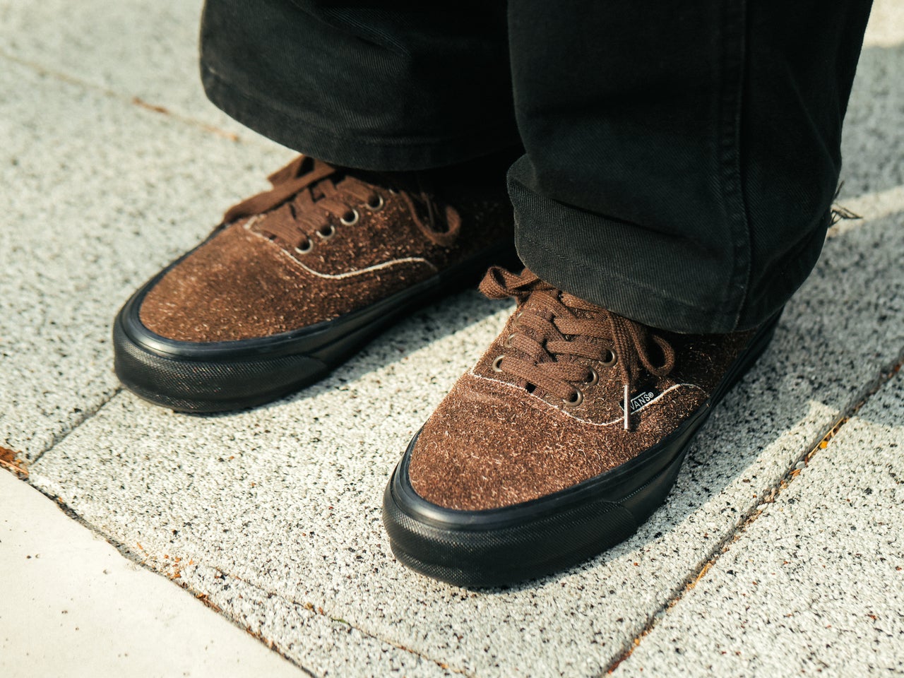 アッパーに毛足の長いスエードを使用したブラックとダークブラウンの落ち着いたカラーのVANS「オーセンティック」。国内ではビューティー&ユースでしか変えないエクスクルーシブモデルだ。
