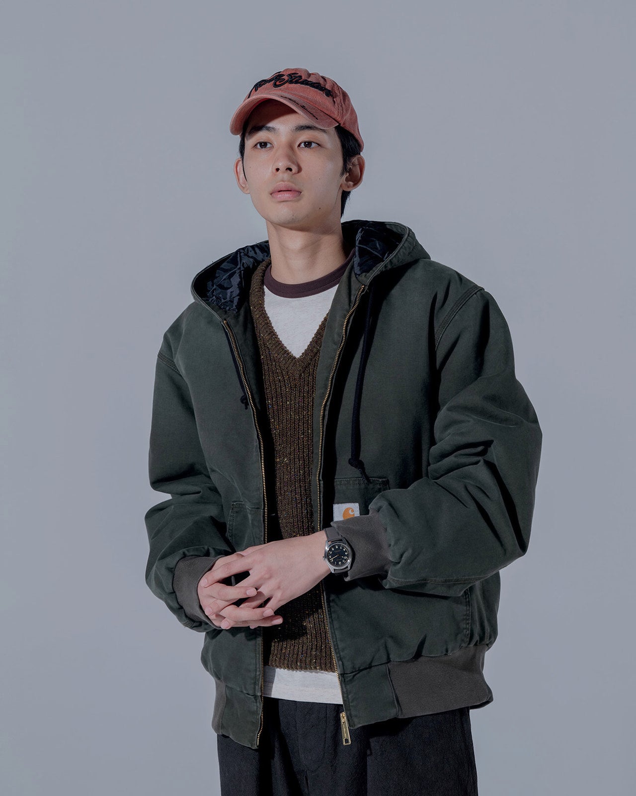 力強さを感じる時計の雰囲気とラバーベルトの色に合わせ、深いグリーンのワークジャケットをチョイス。ストレートにタフに仕上げてもいいけど、インにリンガーTとニットベストを重ねて、やわらかさも添えるのがモダン。武骨なのに、ちゃんと今っぽくて親しみやすい。時計も服装もそういう気分で選びたい。