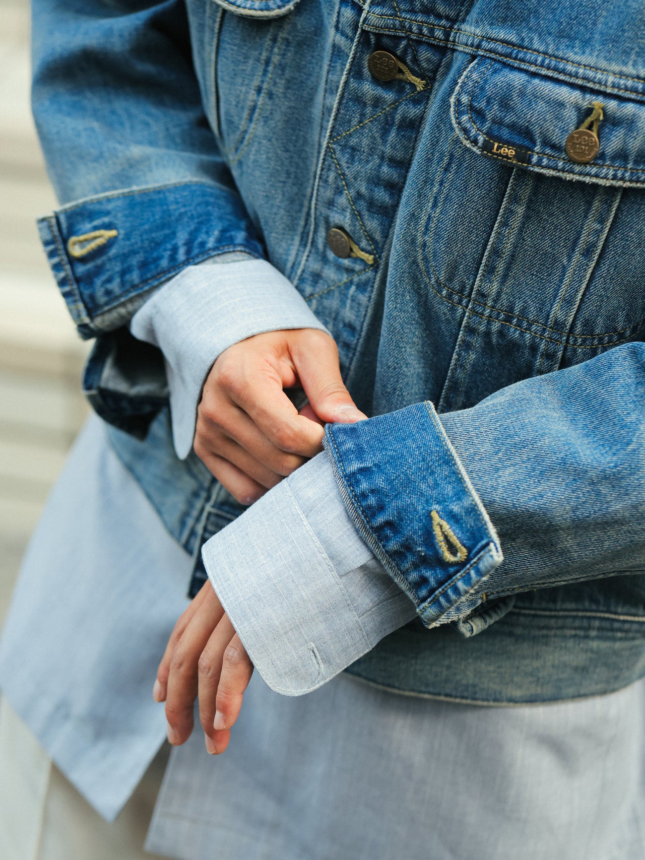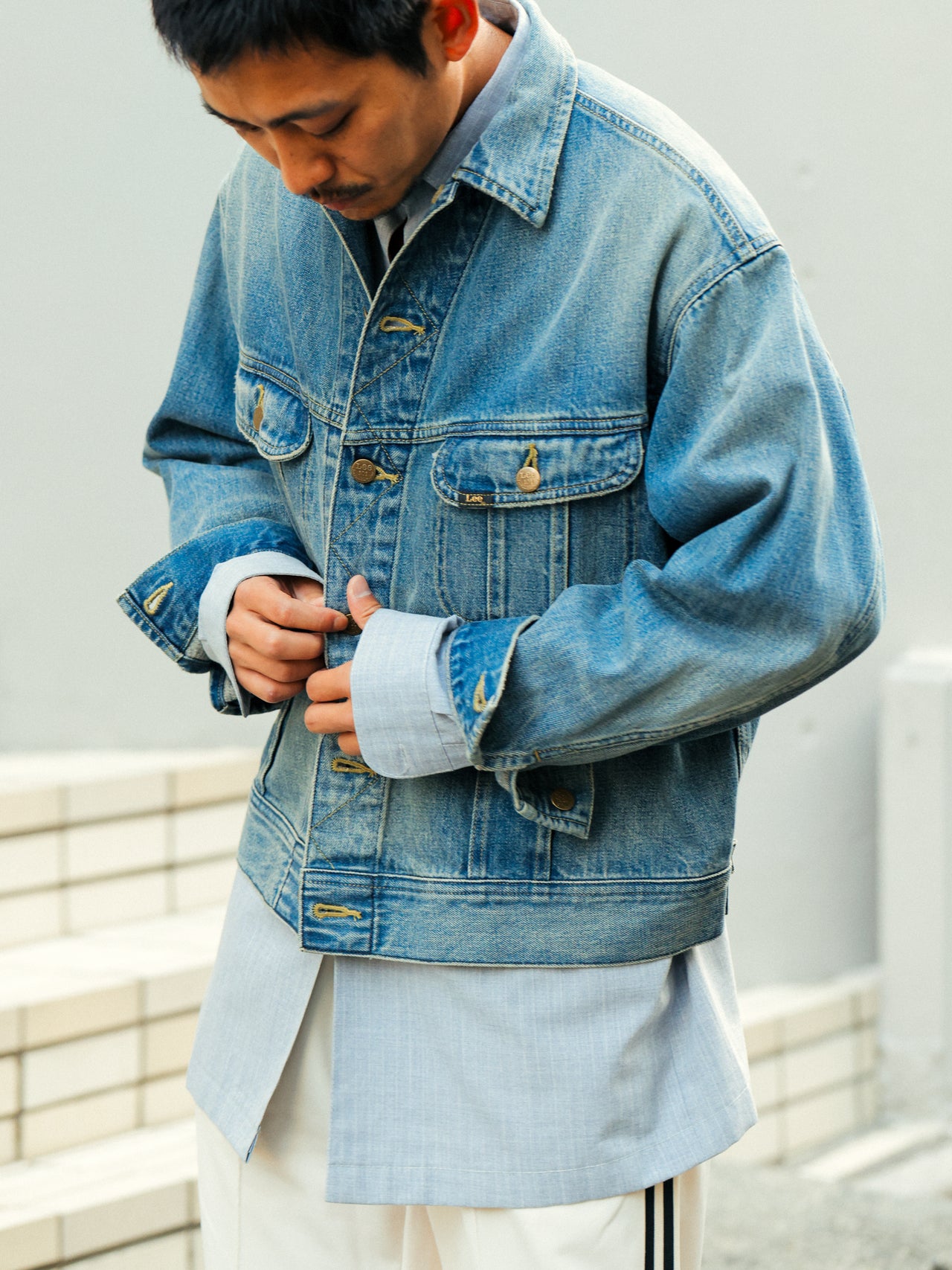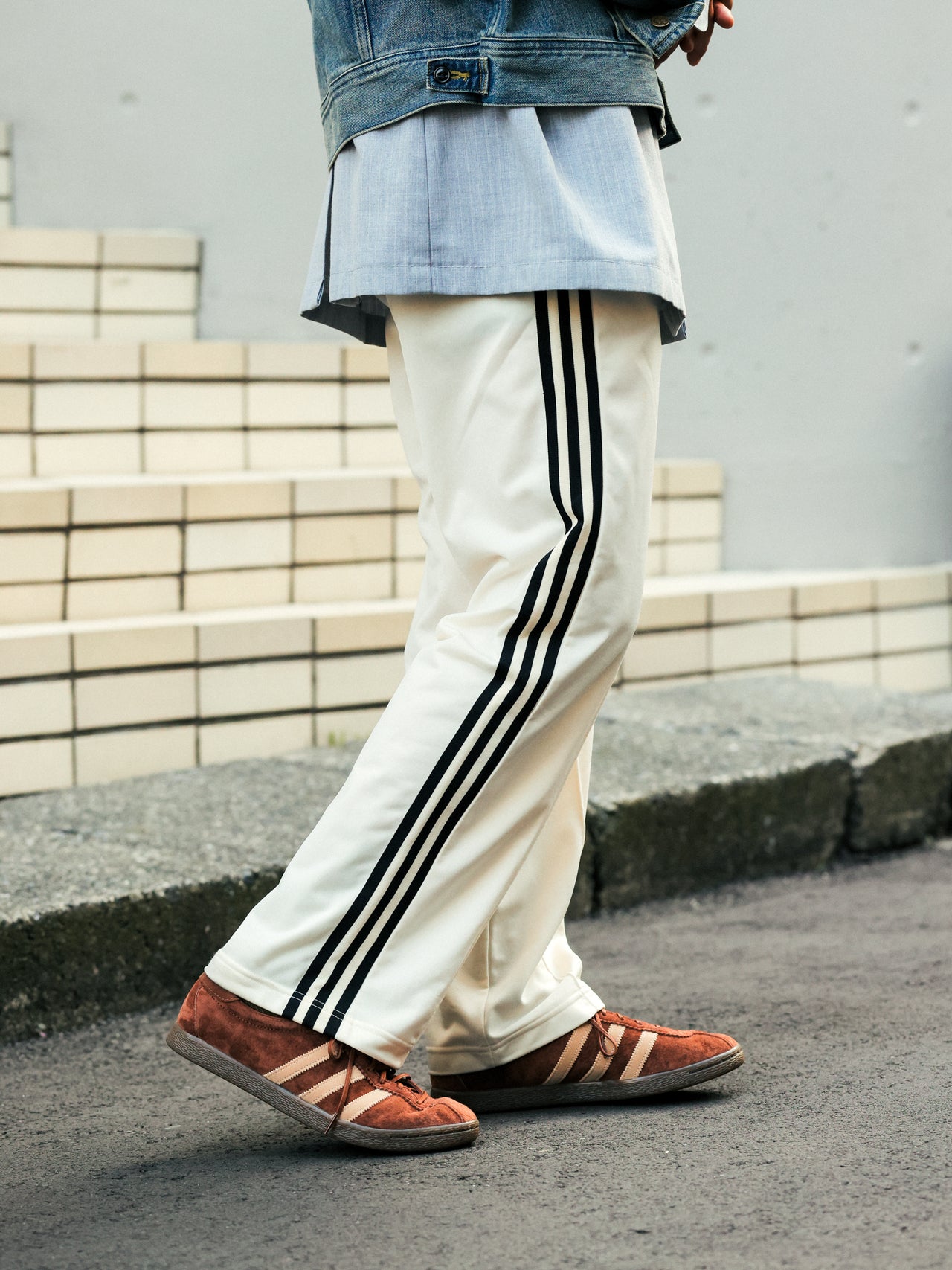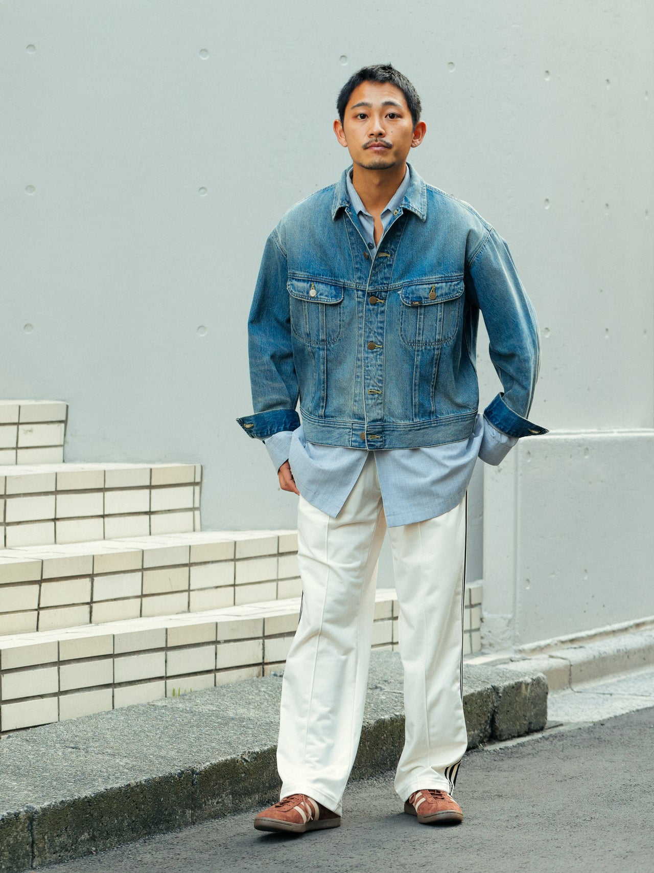 「わかりやすくアディダスのスニーカーにはアディダスのトラックパンツを合わせて、スポーティになりすぎないようにシャツとデニムジャケットでカジュアルさをプラスしました。爽やかな色合わせもフリークス ストア別注の『タバコ』によって程よく重さが出るのが気に入っています」。