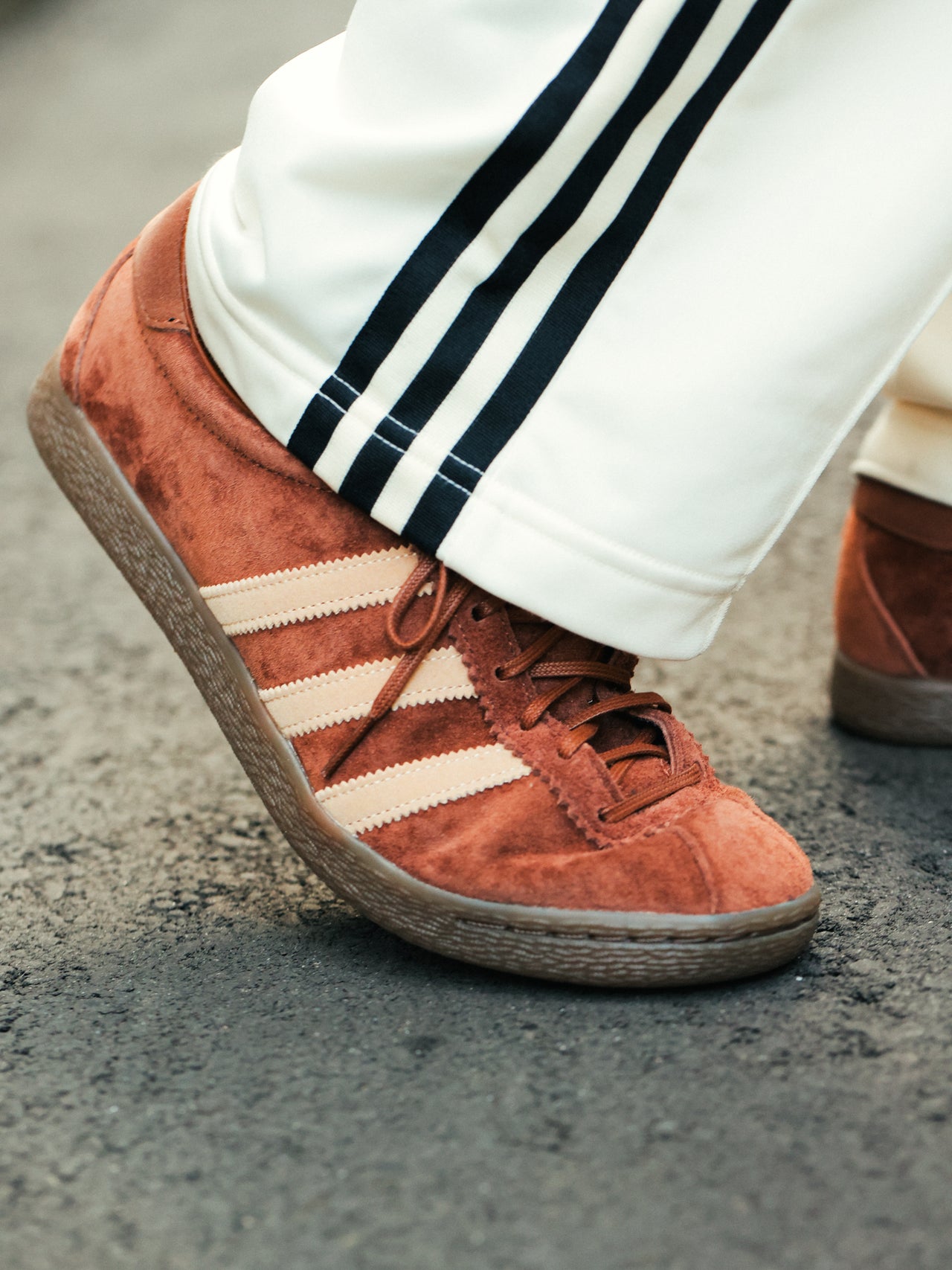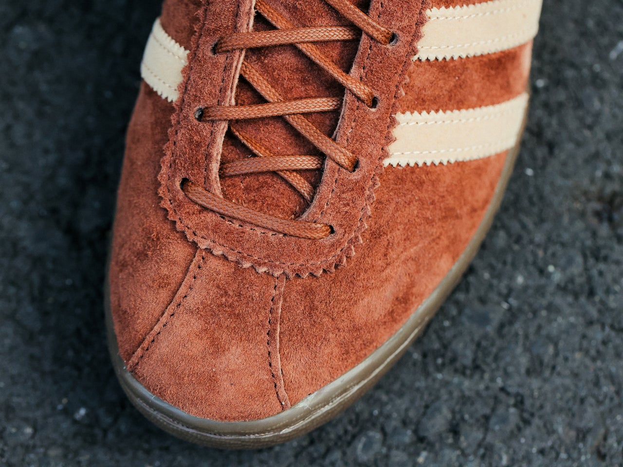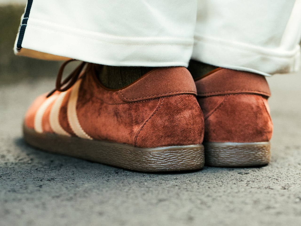 70年代の雰囲気を醸し出すスウェードアッパーとガムソールはそのままに、象徴的なスリーストライプスの素材を変更。シューレースはヴィンテージを彷彿とさせるコットンの平紐を採用し、ブラウン・アイボリーの2色が同梱されている。