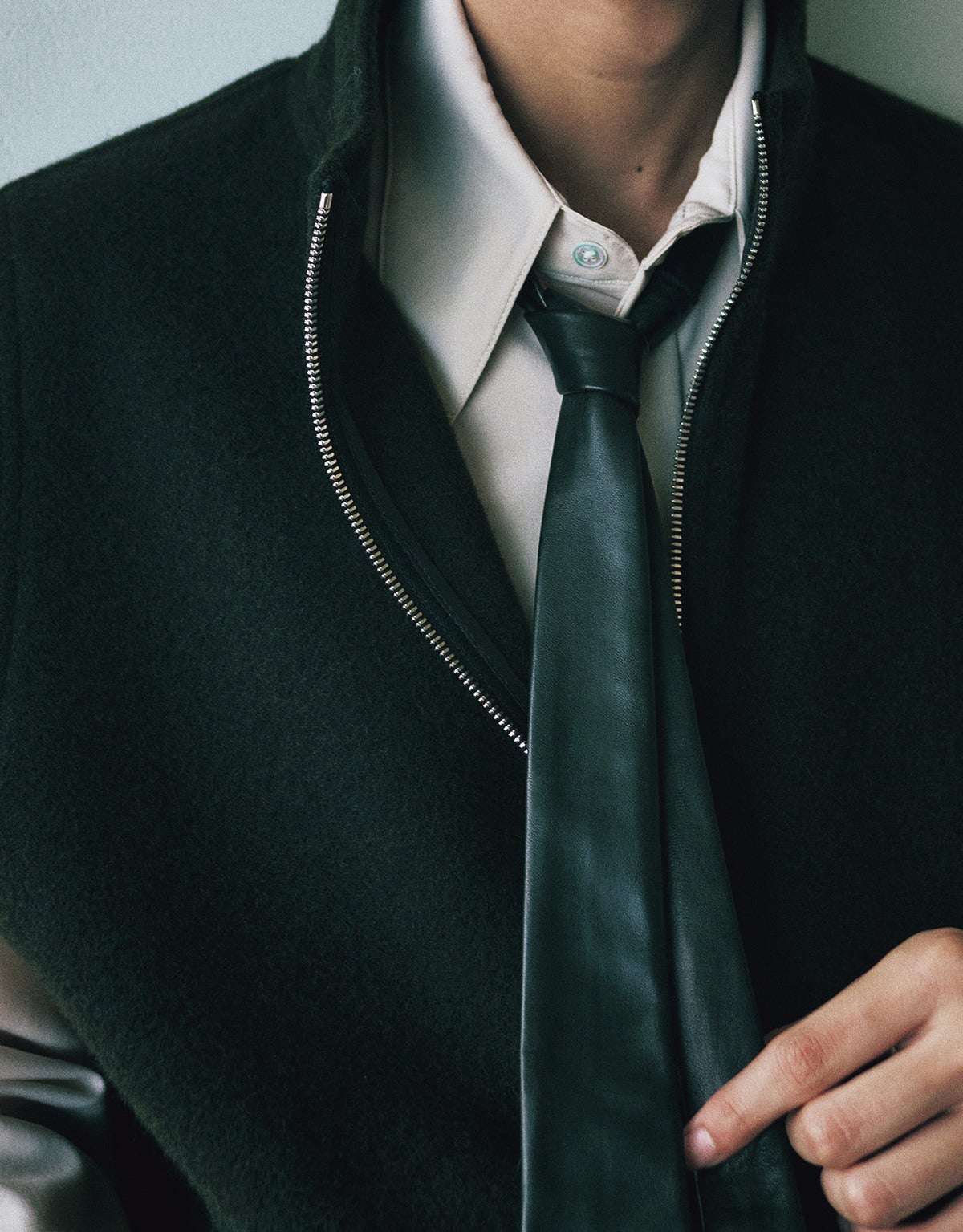 しっとりと柔らかい質感のシープスキンを使用したレザータイ。クラシカルなシャツのタイドアップスタイルも、素材でわずかに変化を加えることでモダン&スタイリッシュな印象に早変わり。