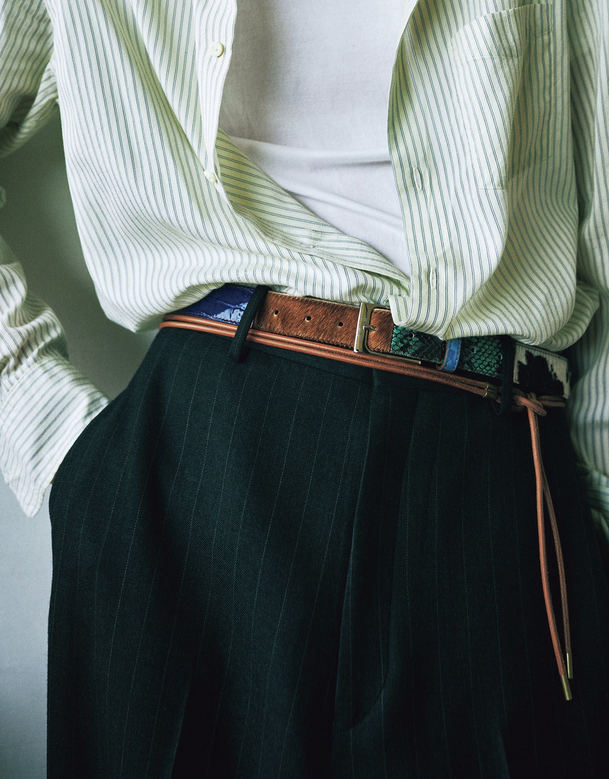ティーが製作過程で生じた余り革を1本のベルトに。型押しのスネークやクロコダイルにヒョウやカウ柄のレザー、質感も色味も異なる素材をつないだデザインは主役級。
