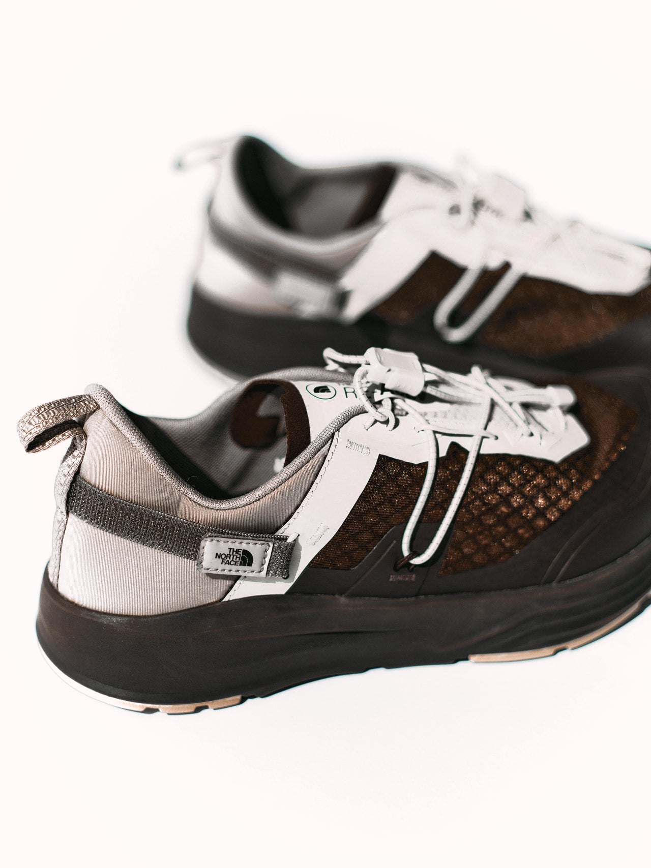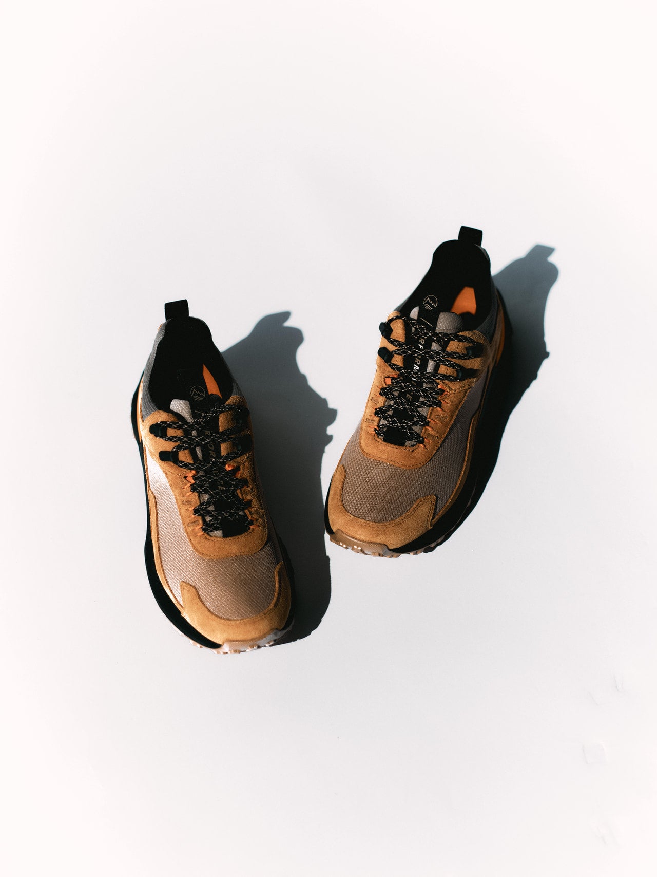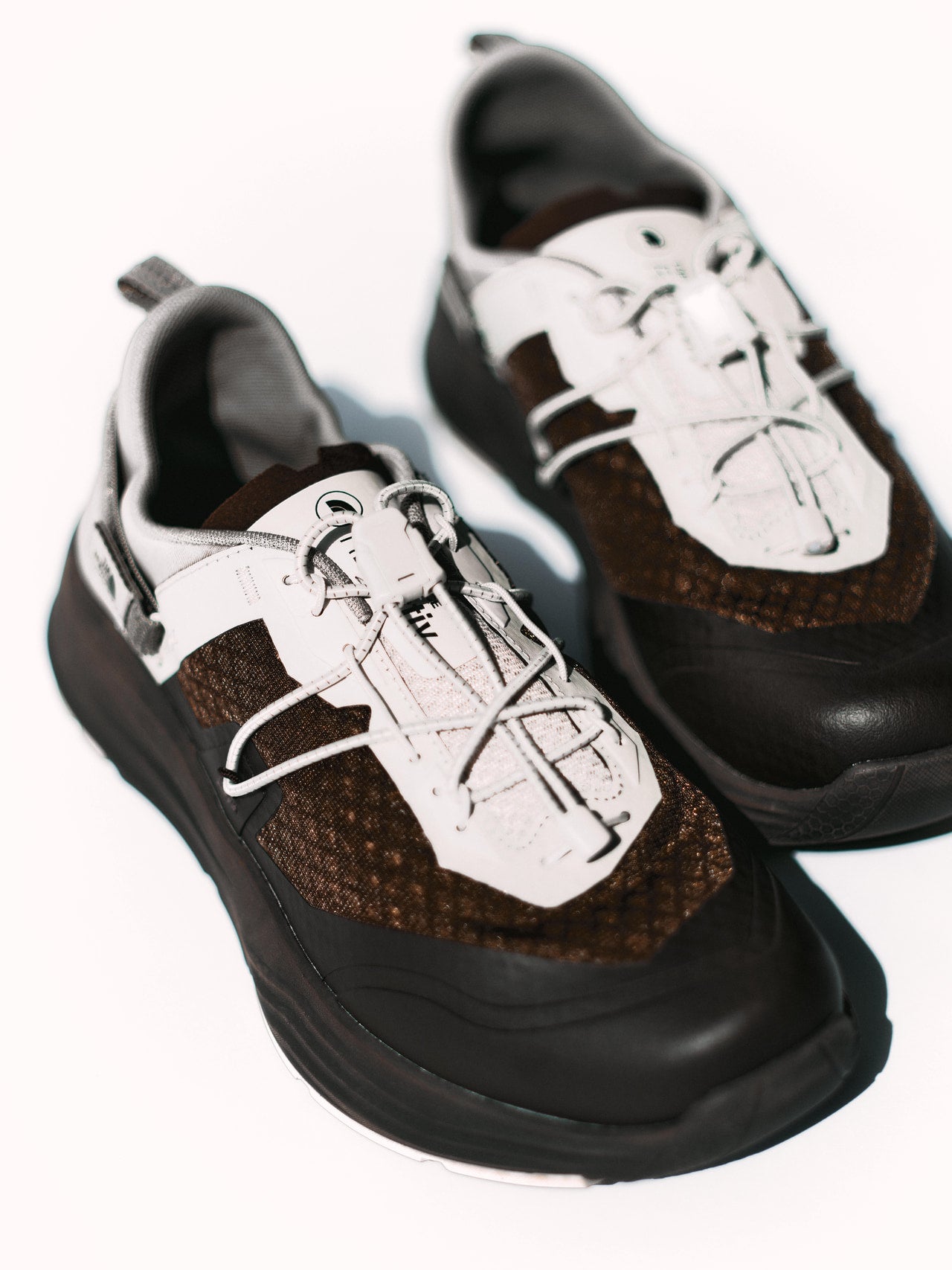 通気性が高いメッシュ生地をアッパーに採用。伸縮性のあるエラスティックシューレースやヒール部分の面ファスナー仕様アジャスターでフィット感をスムーズに調整できるのがポイント。さらに25mm厚のフッドベッドのクッション性は素足でも快適な履き心地だ。ブラウンにベージュ、ブラックのソールとホワイトのシューレースの配色も絶妙で街でも履ける1足になっている。