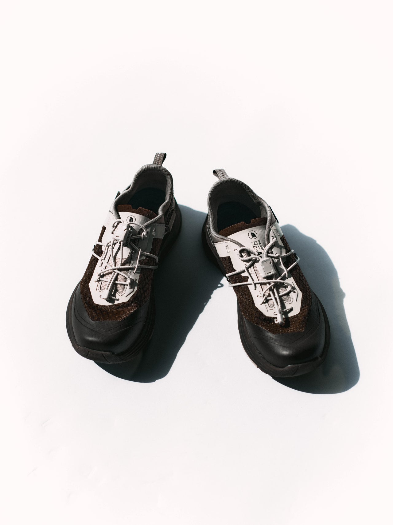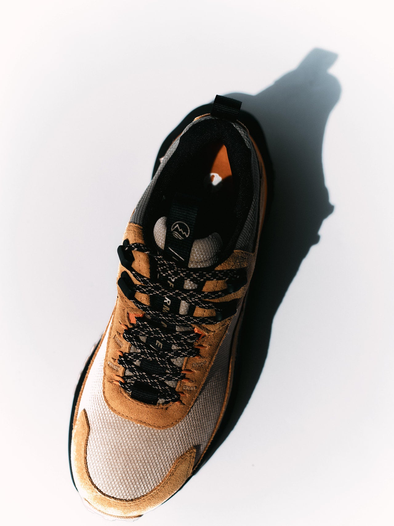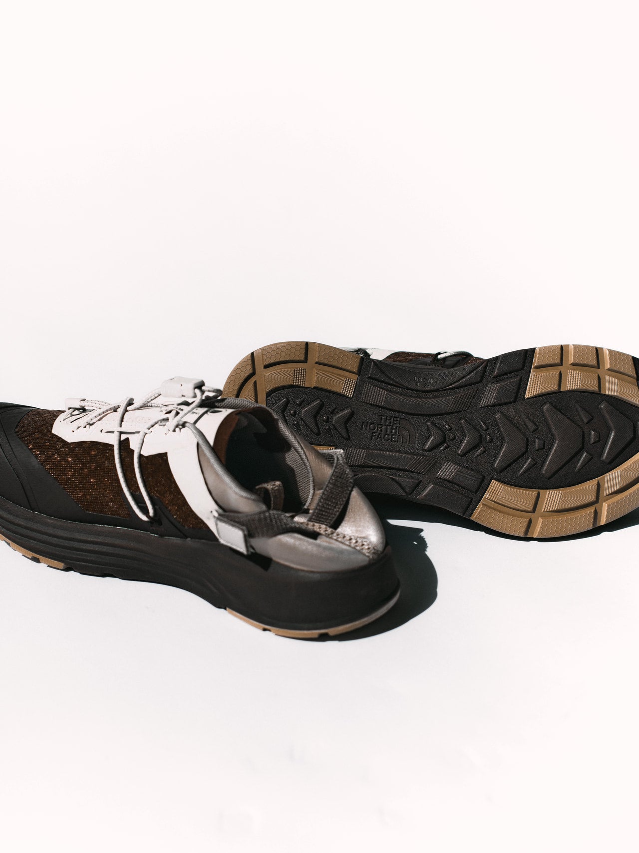 通気性が高いメッシュ生地をアッパーに採用。伸縮性のあるエラスティックシューレースやヒール部分の面ファスナー仕様アジャスターでフィット感をスムーズに調整できるのがポイント。さらに25mm厚のフッドベッドのクッション性は素足でも快適な履き心地だ。ブラウンにベージュ、ブラックのソールとホワイトのシューレースの配色も絶妙で街でも履ける1足になっている。