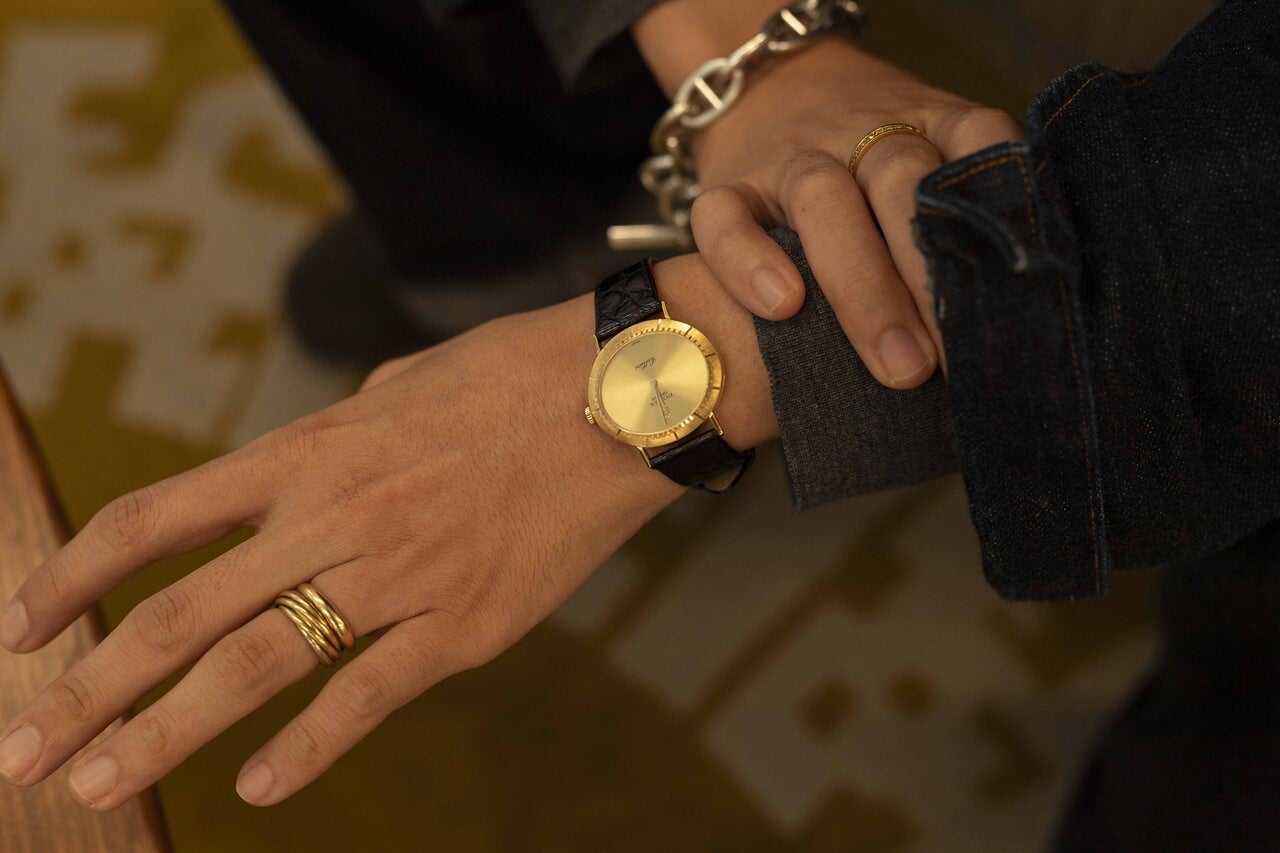 「時計は『ロレックス』のチェリーニです。これまでは『カルティエ』、『エルメス』、『オメガ』など、どれもシルバーステンレス系の文字盤のものが多く、ゴールドフェイスの時計が欲しくて探していたんです。それもできれば手巻き。そんな時に出会ったのがこのチェリーニです。『ロレックス』のドレスウォッチで、フェイスは18Kのイエローゴールドです。今現在も『ロレックス』では現行品で金無垢とメッキ、両方展開しているんですが、これはレザーバンドの尾錠まで金無垢なんです。ヴィンテージショップで購入したんですが、状態もとてもいいし、このチェリーニは隠れた名品だと思います。」