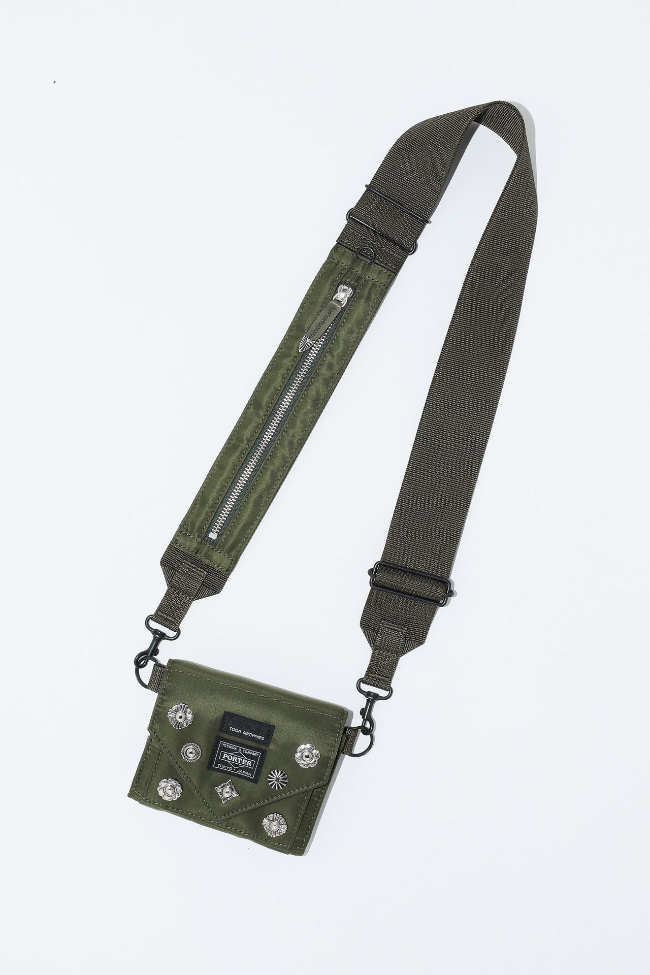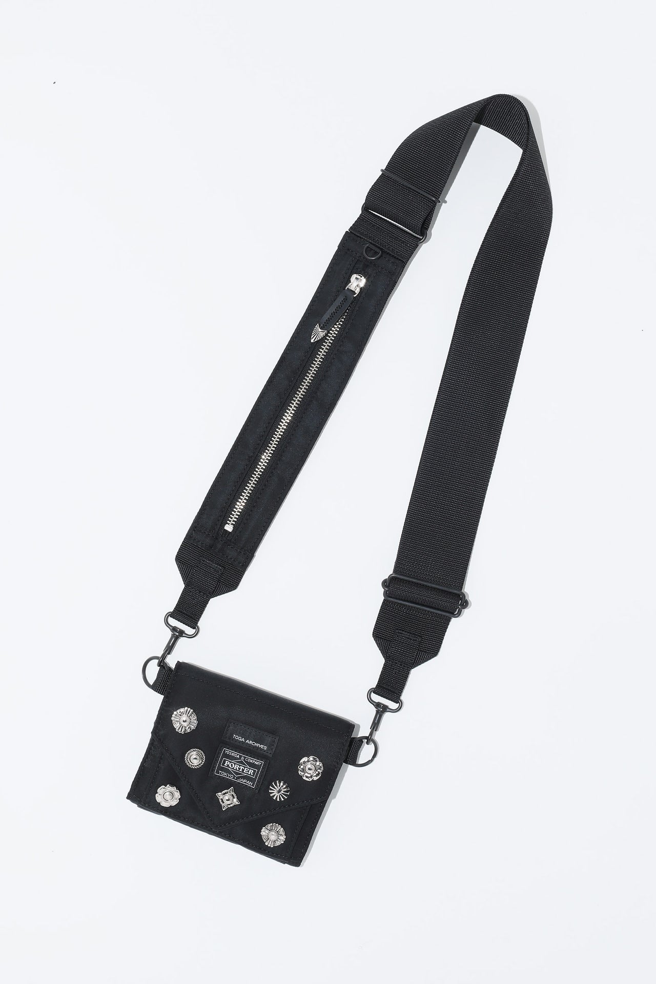 ショルダーウォレットはTOGAらしいメタルコンチョが散りばめられたアイテム。ショルダーストラップのファスナーポケットは物を入れるとマチが広がる仕様で、スマートフォンなどを入れることができる。ストラップを取り外せば、ウォレット単体でも使用可能。