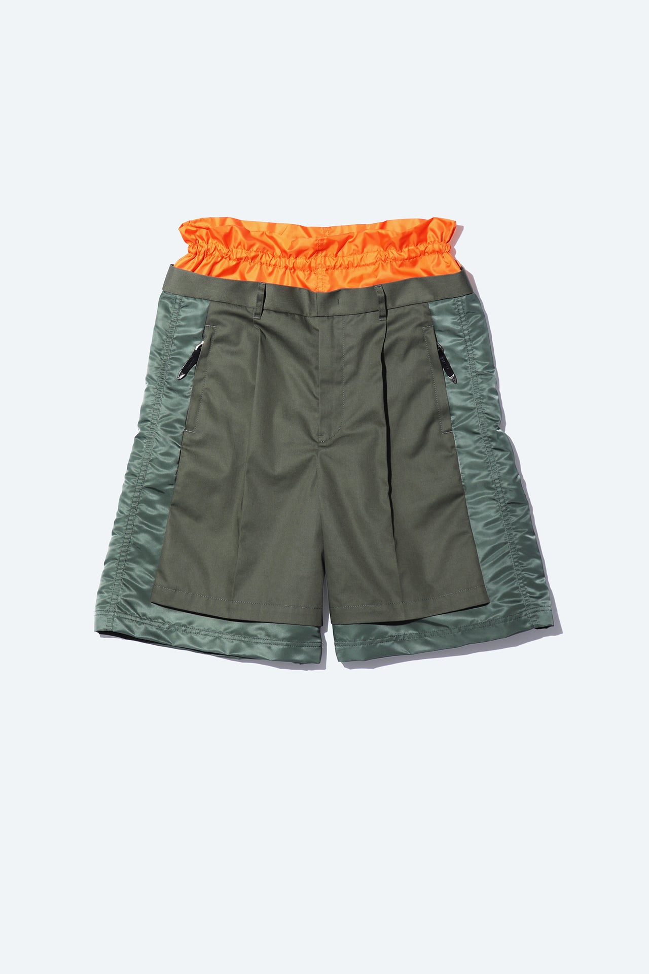 ナイロンとスウェット生地を組み合わせたコラボレーションならではのアイテム。裾を絞るとフォルムが変わり、異なる表情を楽しめる。