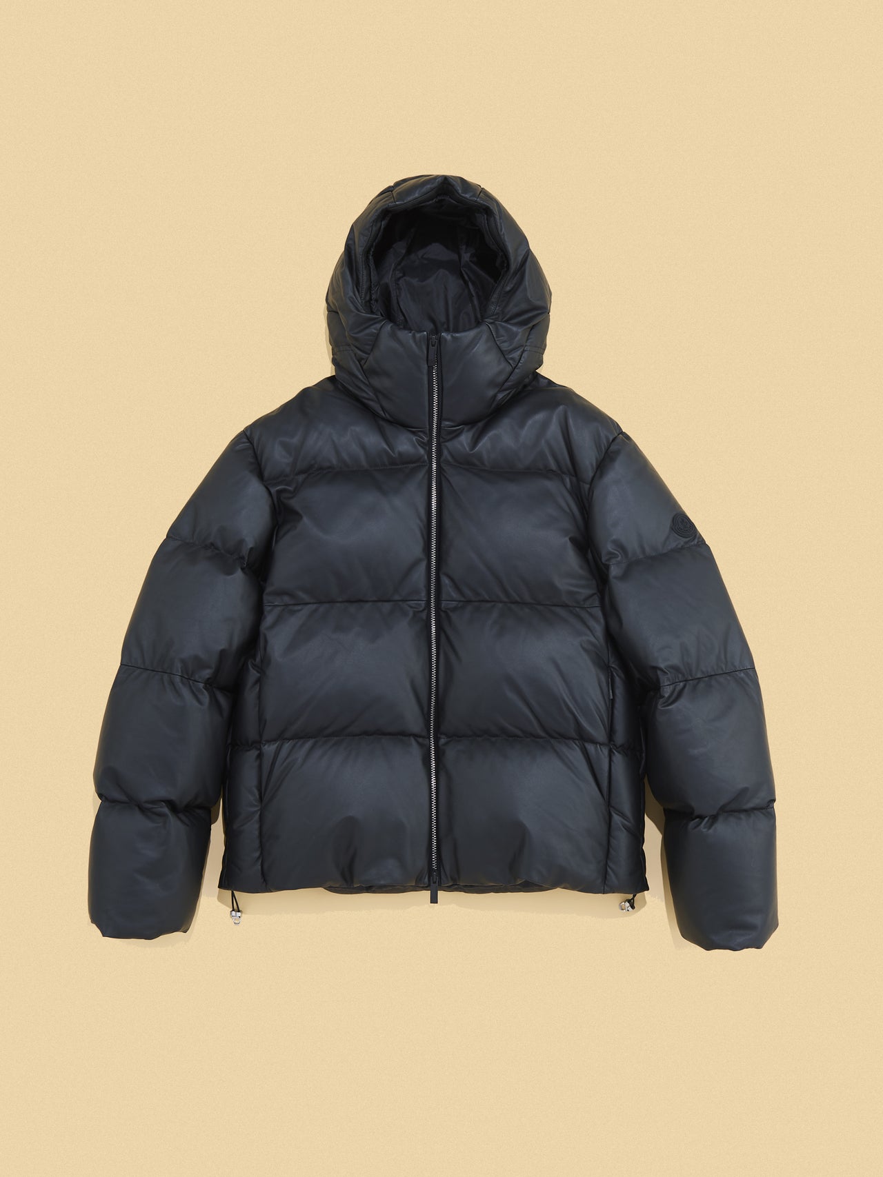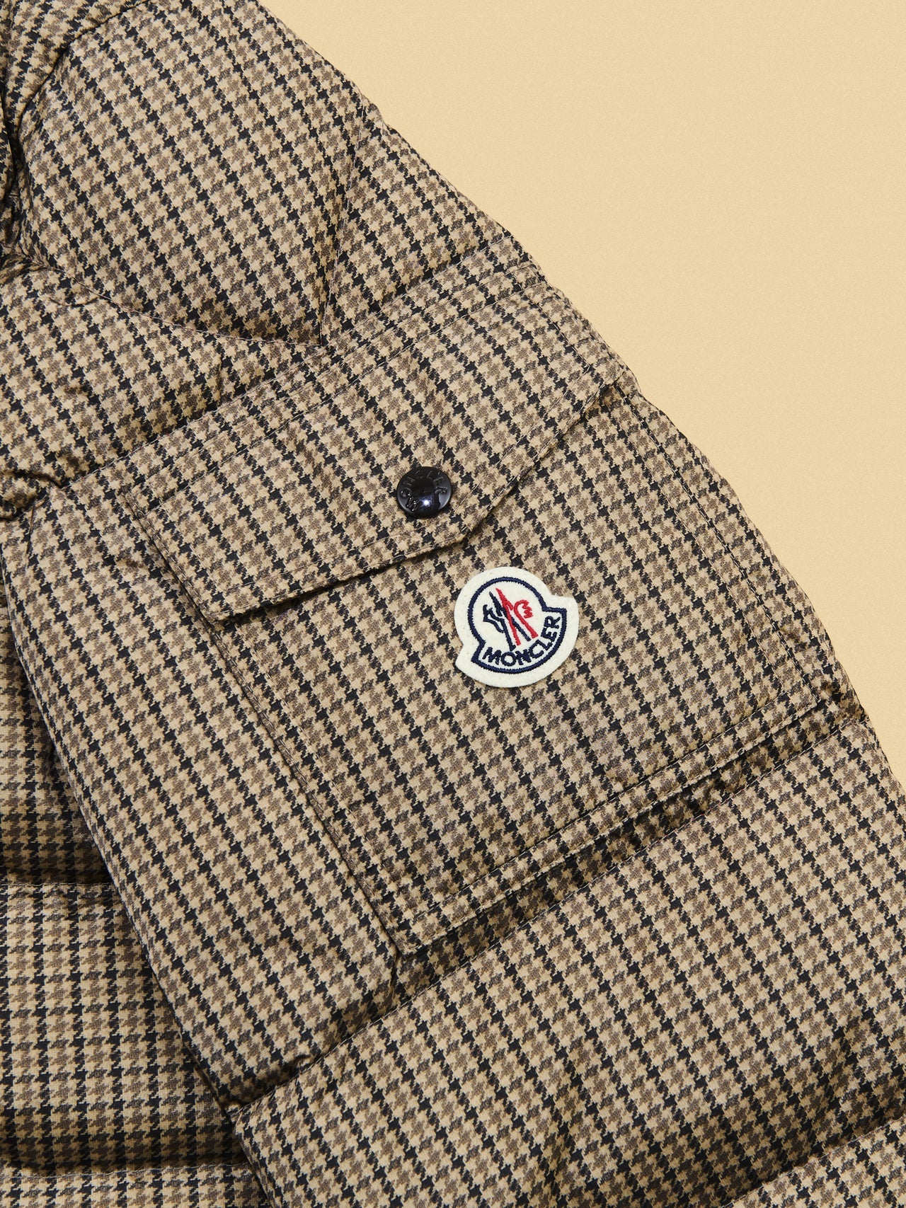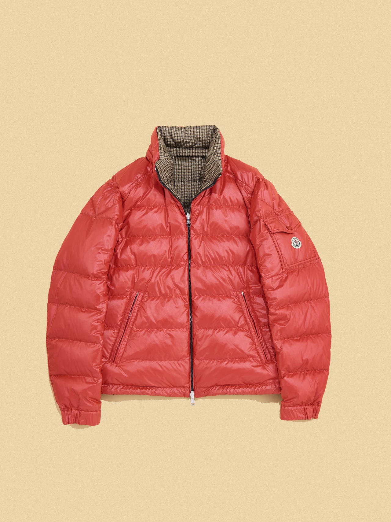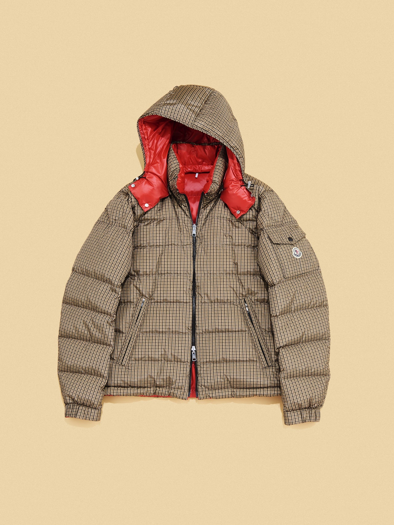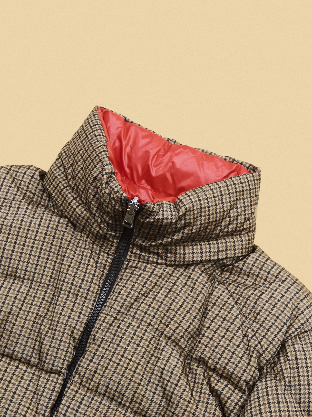 撥水性ナイロン素材を使用した面と、光沢のあるポリエステル素材を使用した面を備えたリバーシブル仕様のJonageショートダウンジャケット。片面はチェックパターン、もう片面はモノクロに仕上げられている。雨の日にも活躍する取り外し可能なフードつきと、さまざまなシーンに合わせて着られる逸品だ。