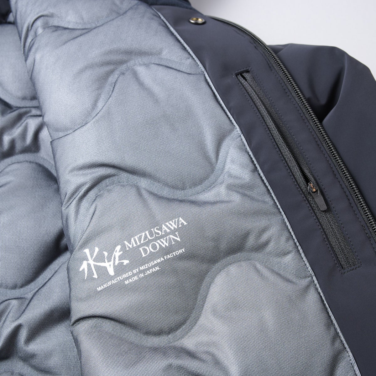 水沢ダウン”INVISIBLE”シリーズのハーフコート「INV-08」。高いウォータープルーフ性能はそのままに、熱接着ノンキルト加工やその他ディテールを全て製品の内側に潜め、より都会的でミニマルなデザインを実現している。