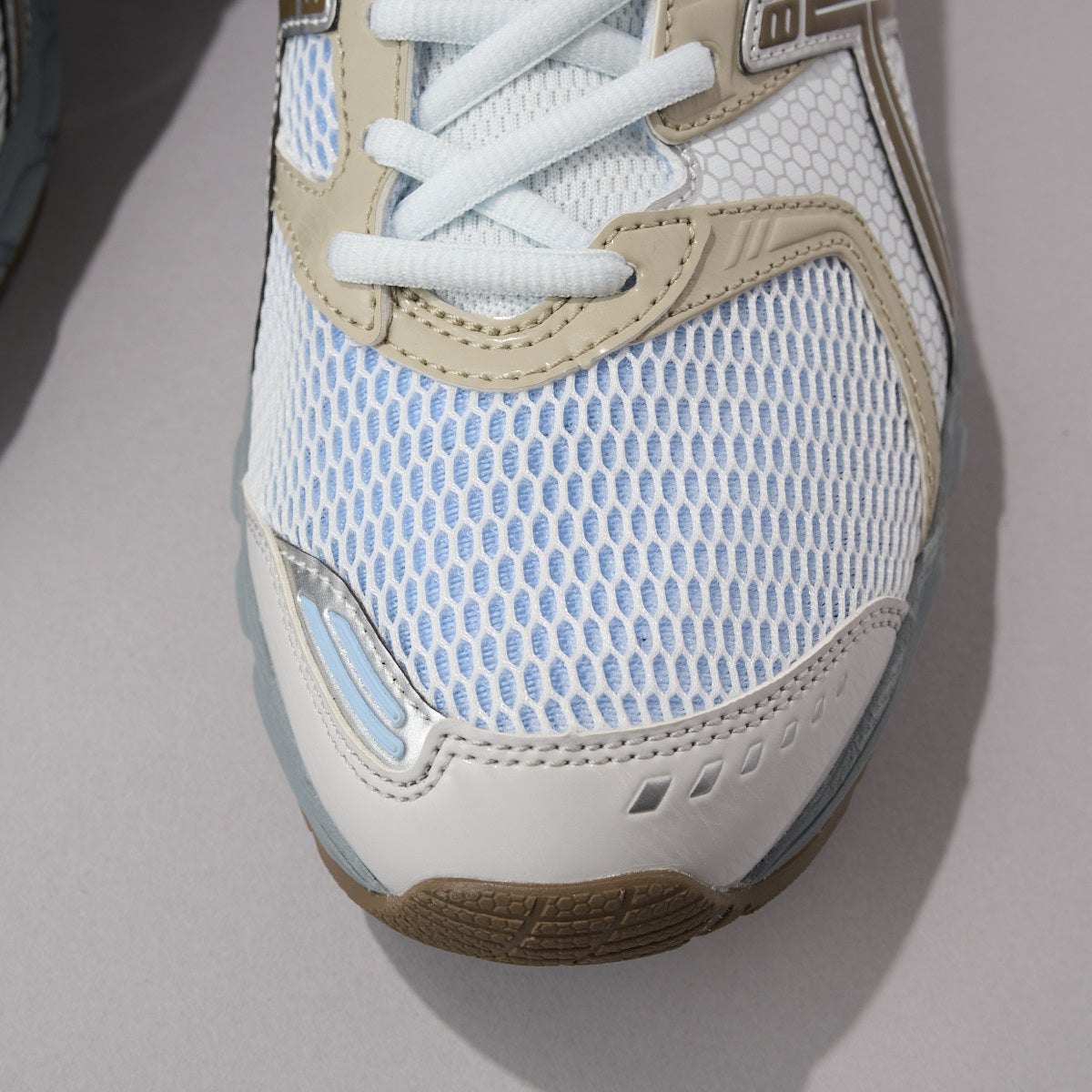 特徴的なアッパーには、アイコニックなクォーターパネルデザインとオープンメッシュパネルを採用。このディテールは当時のランニングシューズのデザインに見られるダイナミックさと美しさを演出する要素になっている。