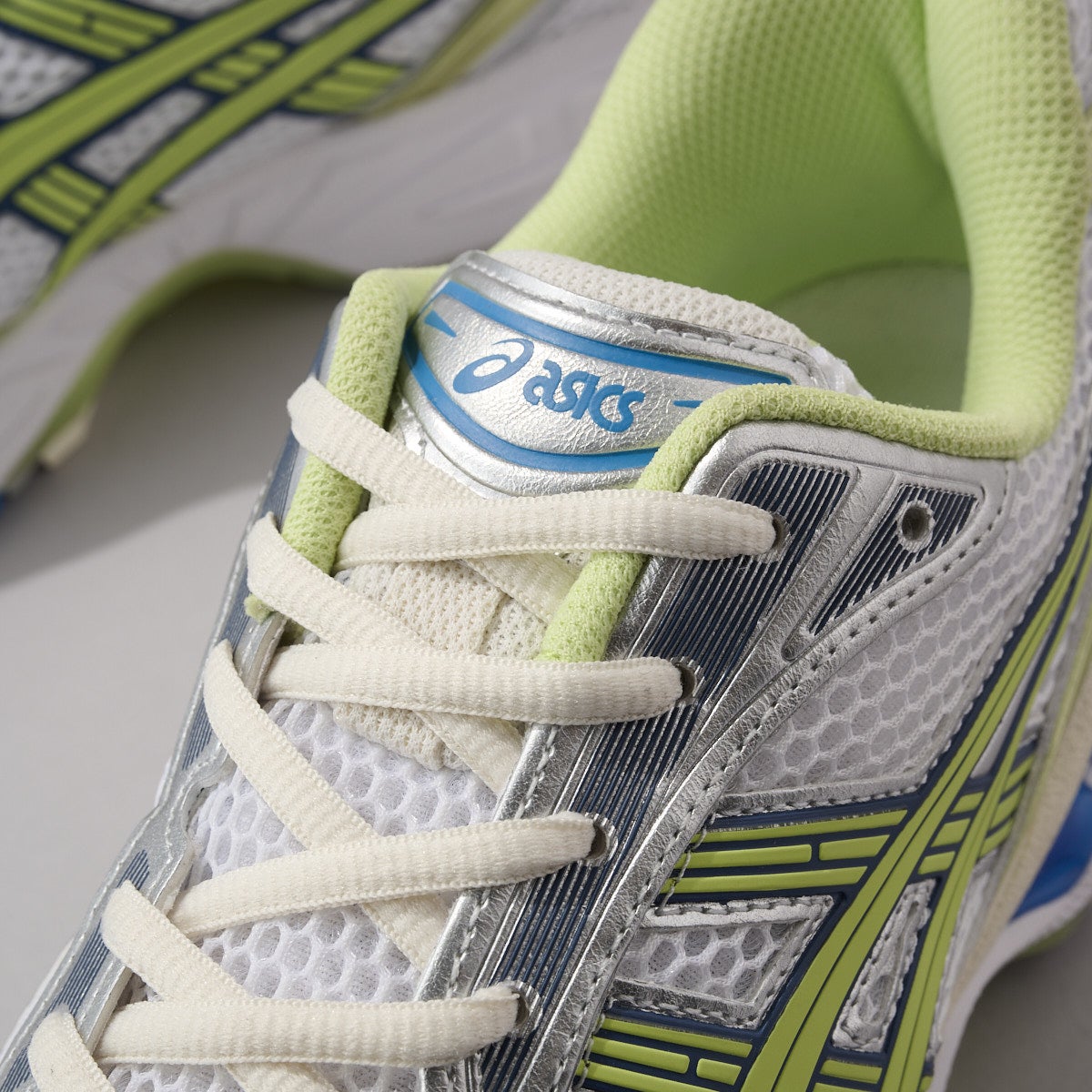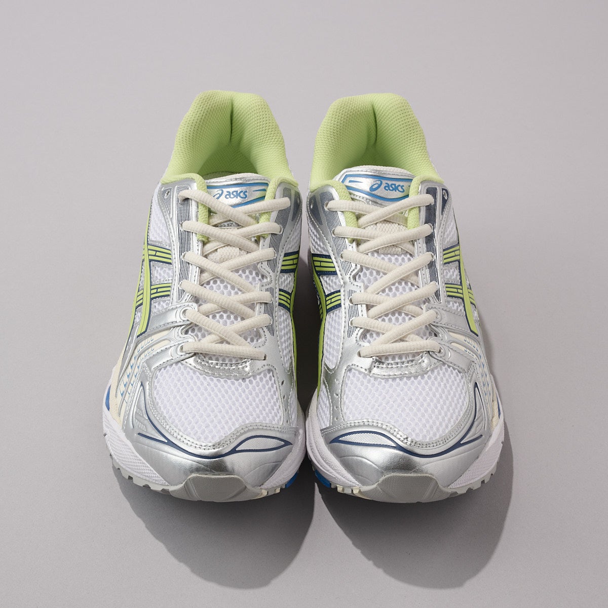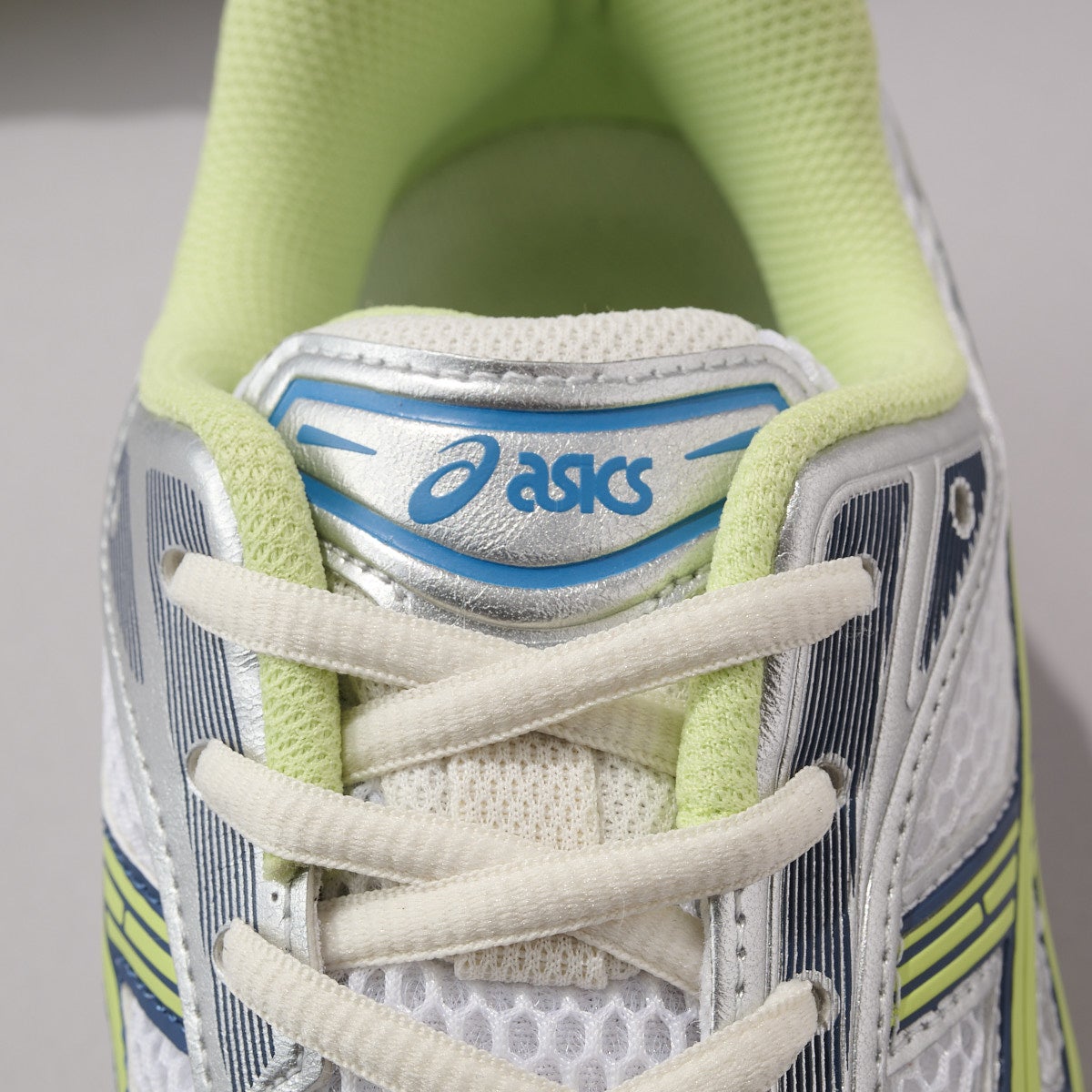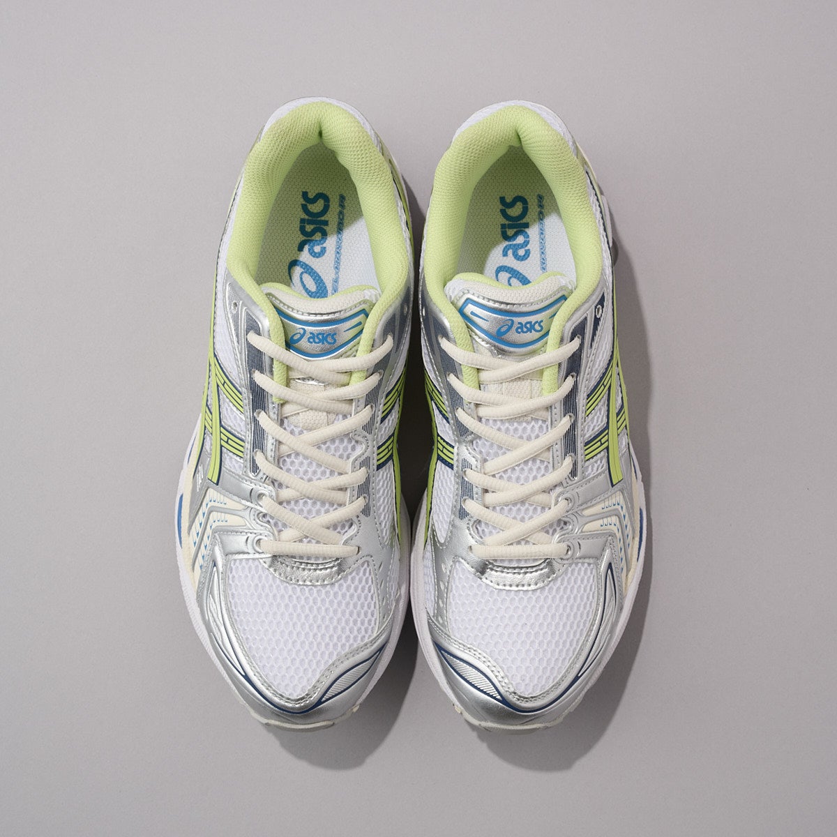 アッパーはクリーンなホワイトのメッシュ素材に、シャープな輝きを放つピュアシルバーのシンセティックオーバーレイ。2000年代のハイテクランニングシューズに見られるテクニカルな雰囲気が魅力だ。サイドのアシックスストライプには鮮やかなライムグリーンを採用した。