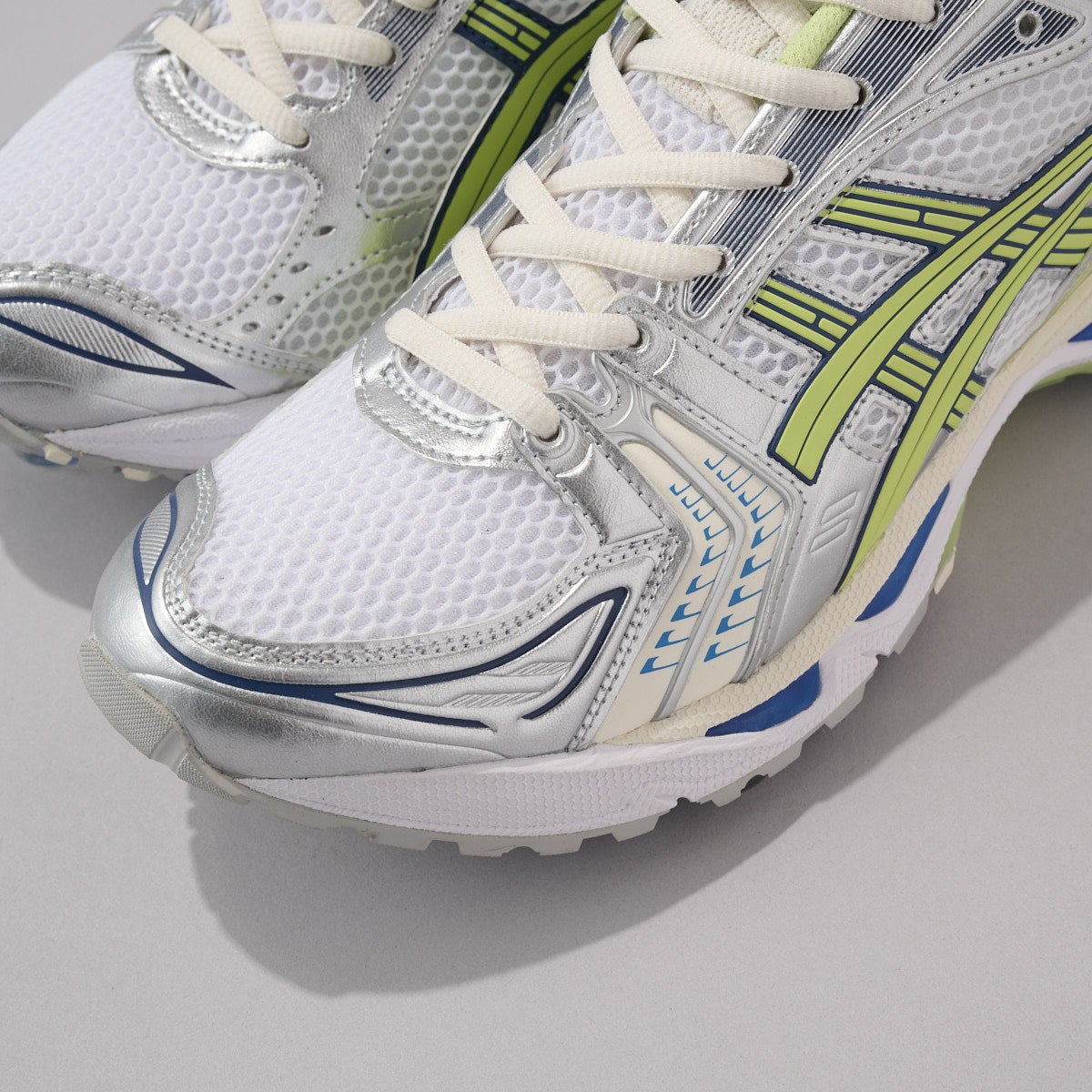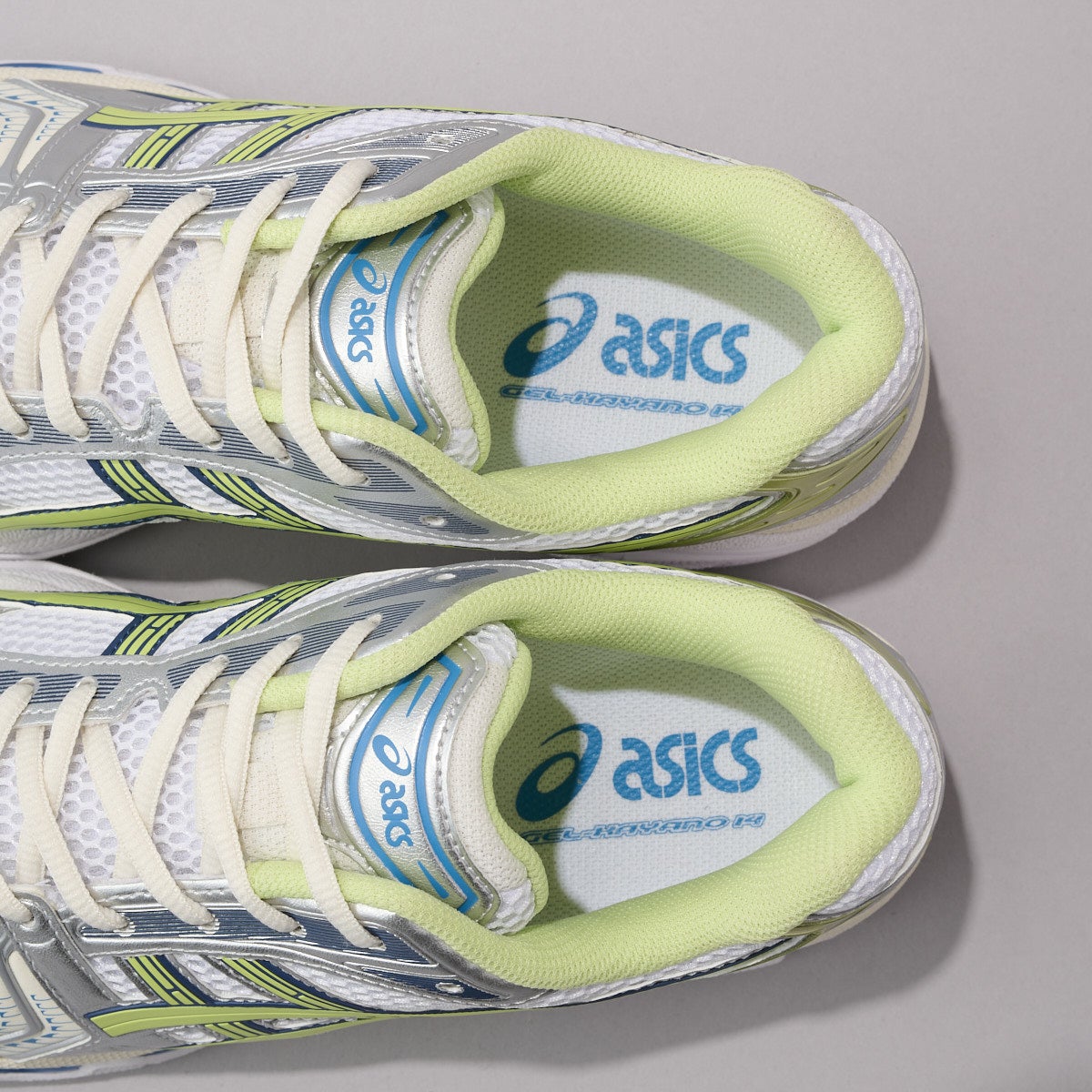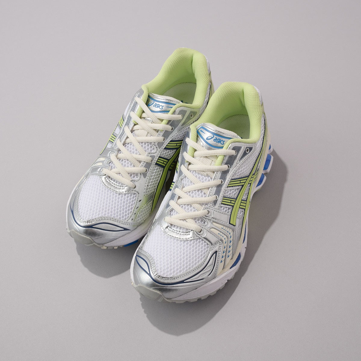 アッパーはクリーンなホワイトのメッシュ素材に、シャープな輝きを放つピュアシルバーのシンセティックオーバーレイ。2000年代のハイテクランニングシューズに見られるテクニカルな雰囲気が魅力だ。サイドのアシックスストライプには鮮やかなライムグリーンを採用した。