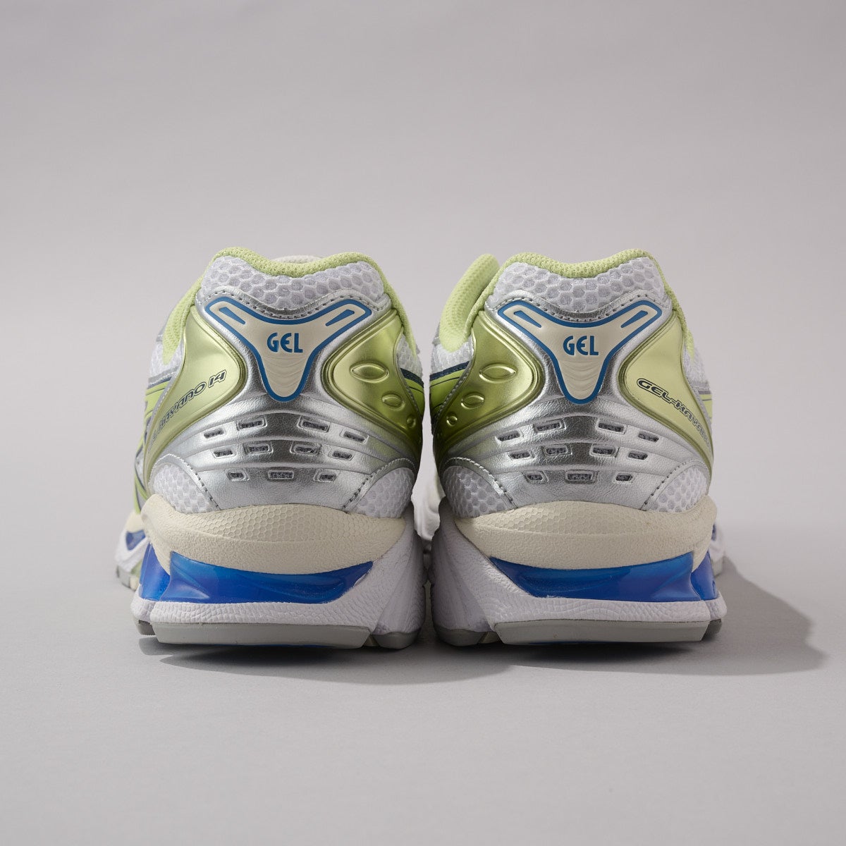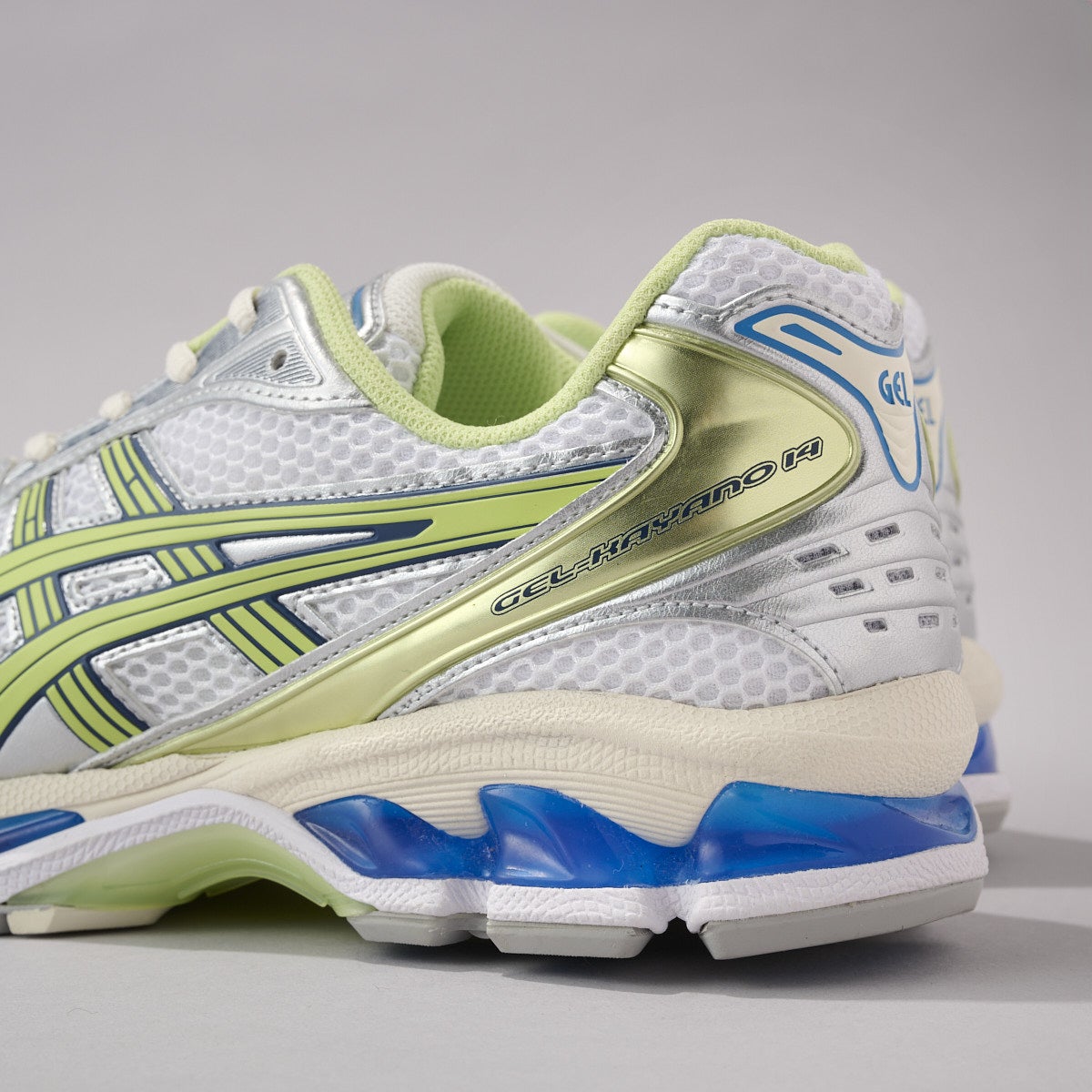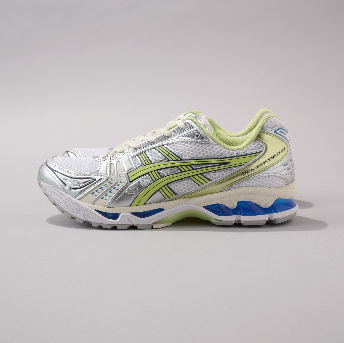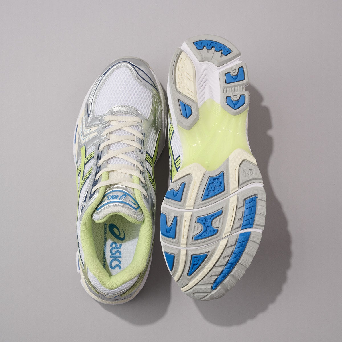 アッパーはクリーンなホワイトのメッシュ素材に、シャープな輝きを放つピュアシルバーのシンセティックオーバーレイ。2000年代のハイテクランニングシューズに見られるテクニカルな雰囲気が魅力だ。サイドのアシックスストライプには鮮やかなライムグリーンを採用した。