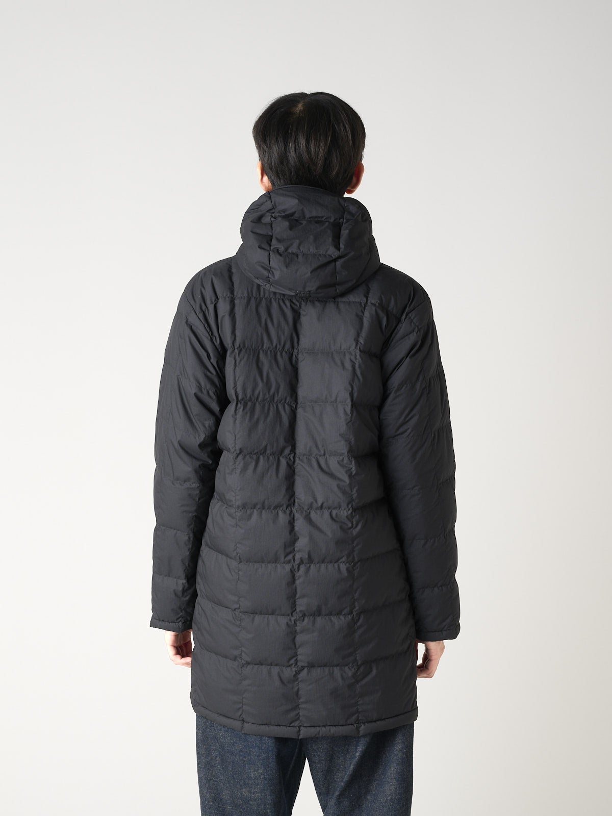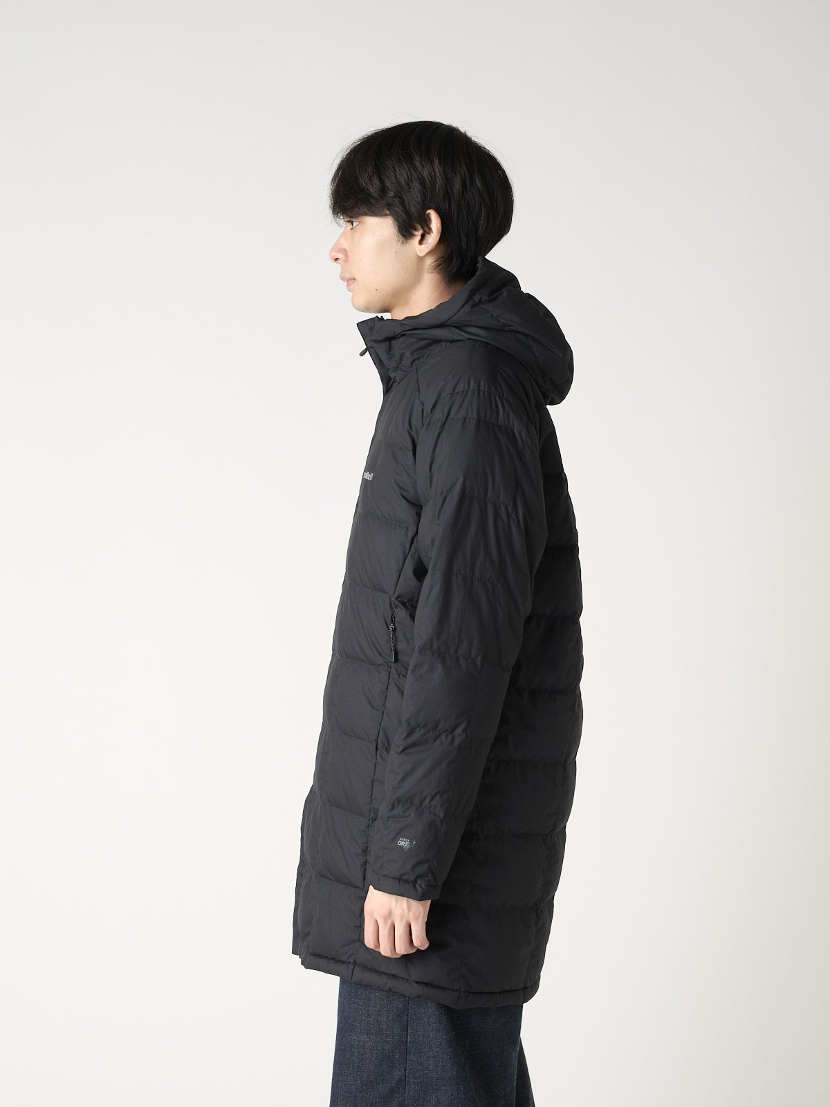 シルエットはタイトで立体的。身頃のダーツがダウンの膨らみを抑え、すっきりとした美しさをキープ。着丈はやや長めで、スーツやジャケットの上からでも裾が出ず、ビジネスシーンにも自然に馴染む。フードは着脱可能で、外せばよりシンプルでフォーマルな印象に。