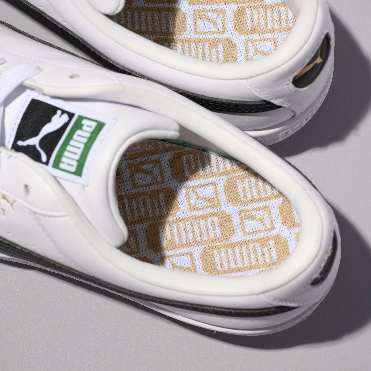 そして外側のサイドには、プーマのアイコンでもあるフォームストリップをレイアウト。時代を超えて受け継がれてきたデザインコードが、現代的なホワイトレザーの質感と融合することで、より立体的で洗練された印象に仕上がっている。