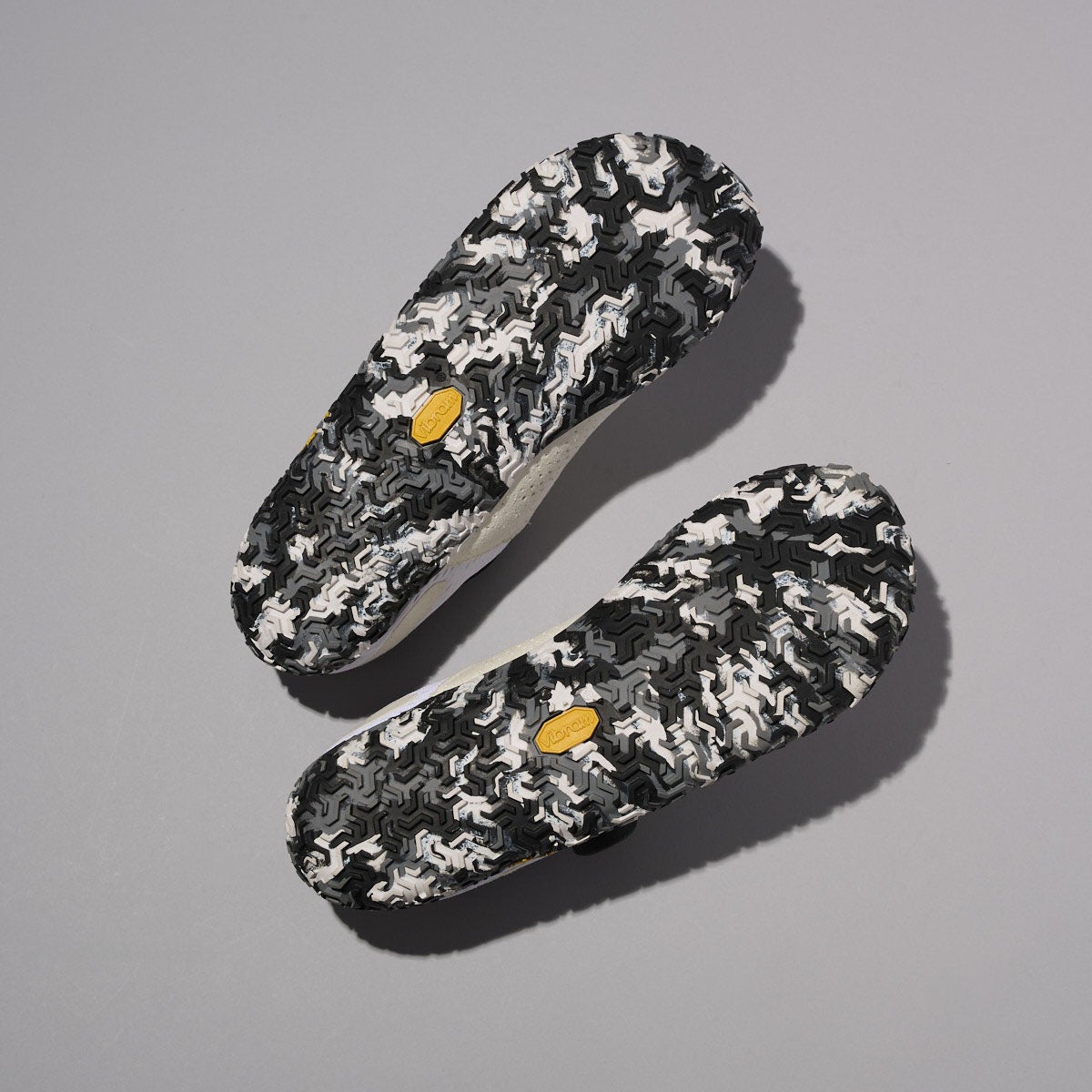 アウトソールには、グリップ性や耐久性を損なうことなくリサイクルラバーを30%配合したVibram社のサステナブルソール「Vibram ECOTEP RECYCLE(ヴィブラム エコステップ リサイクル)」を搭載し、外的要因から足を保護するため爪先から踵までラバーでカバーする構造デザインになっている。